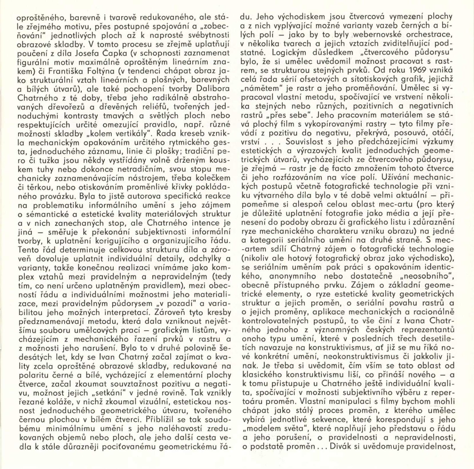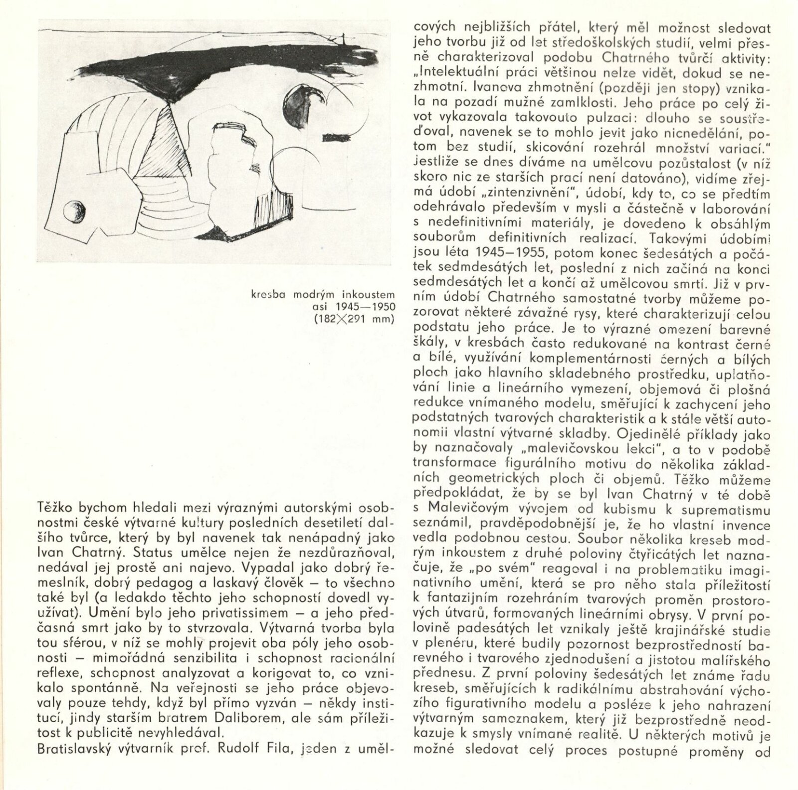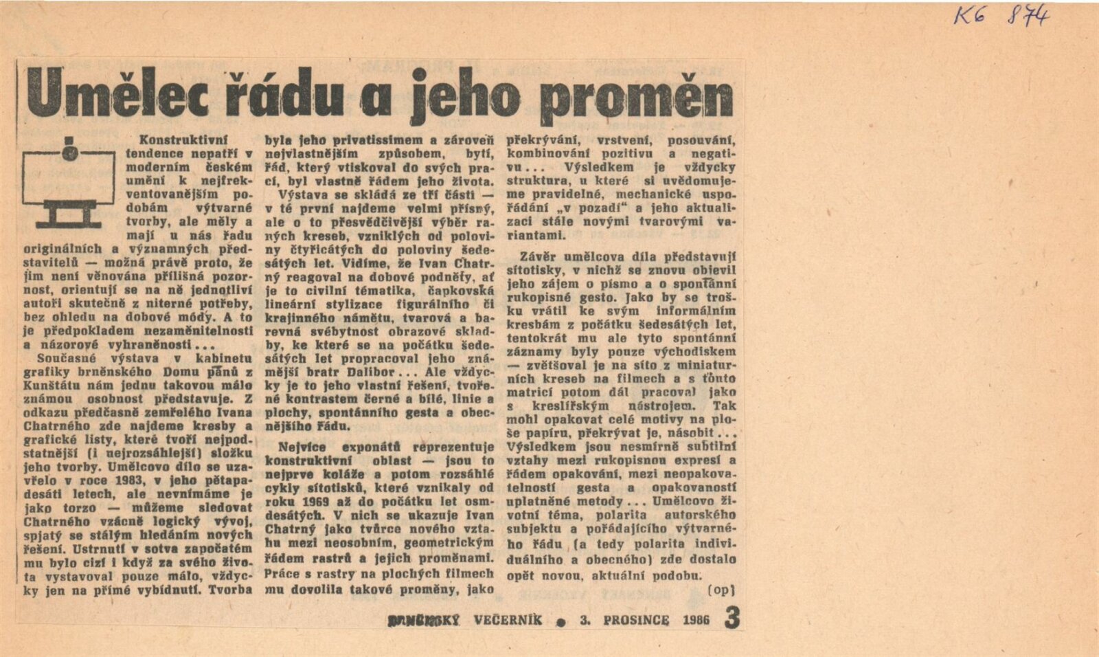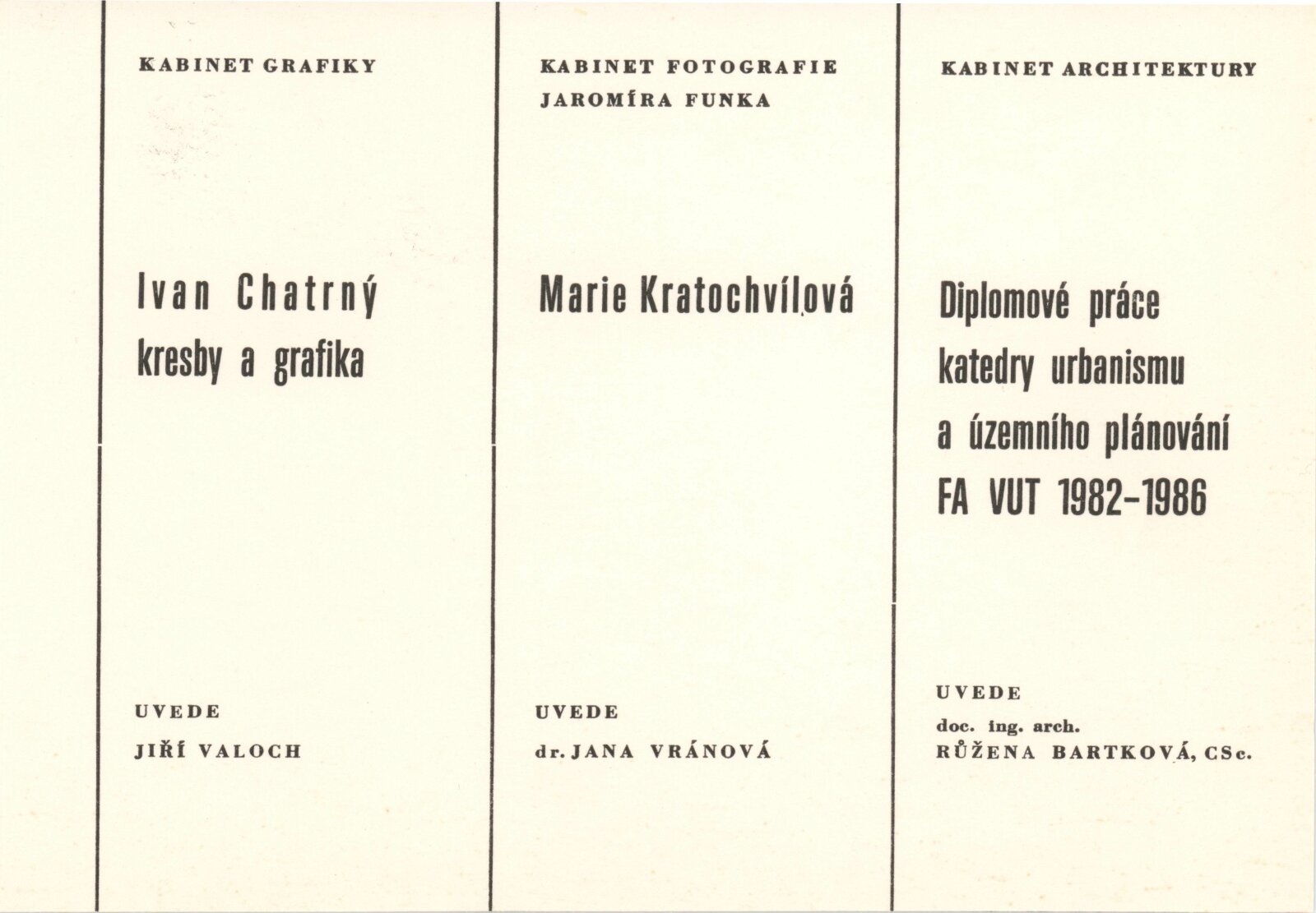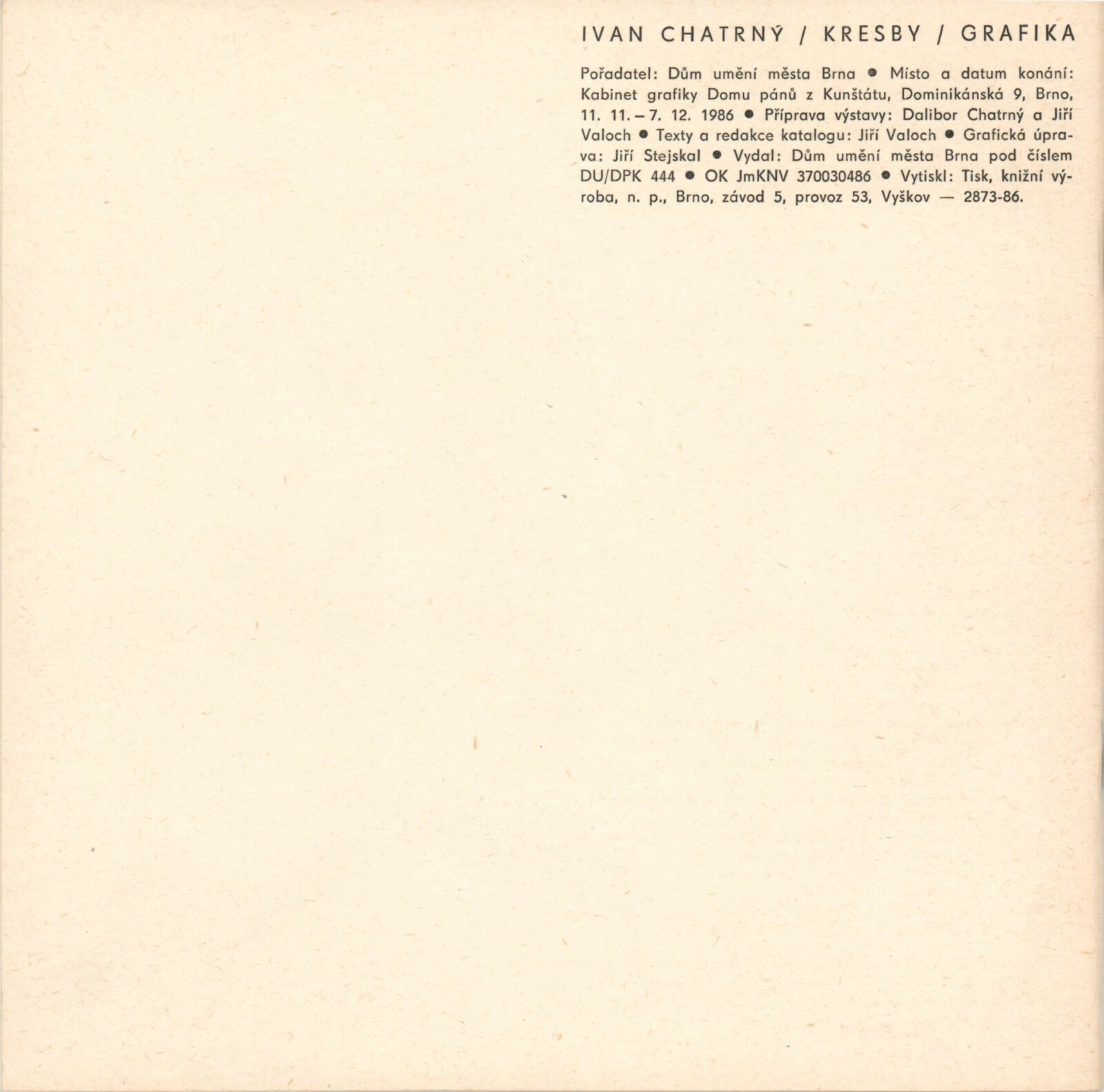 Ivan Chatrný. Kresby, grafika: Dům umění / Dům pánů z Kunštátu, Kabinet grafiky, 11. 11. – 7. 12. 1986 / Text: Jiří Valoch. – Brno: DUmB, 1986. – [33] s., obr., životní data, výstavy, zastoupení ve sbírkách, DPK 874. – MZK; MMB