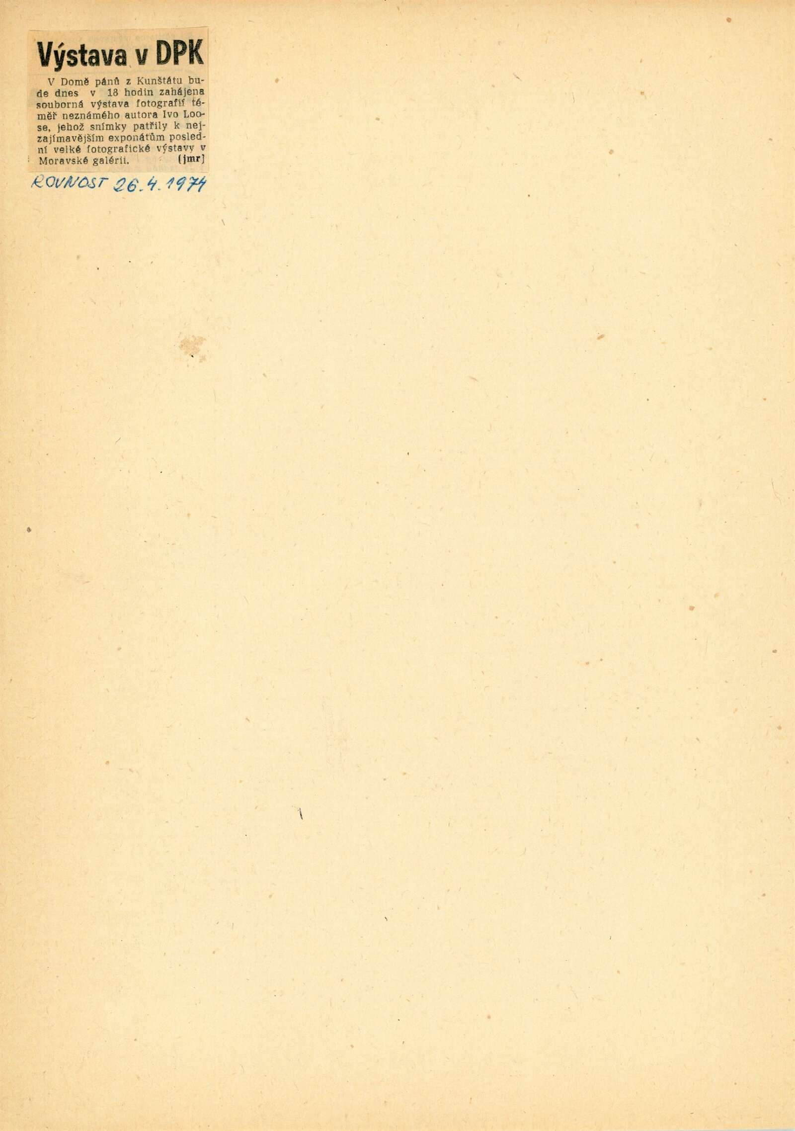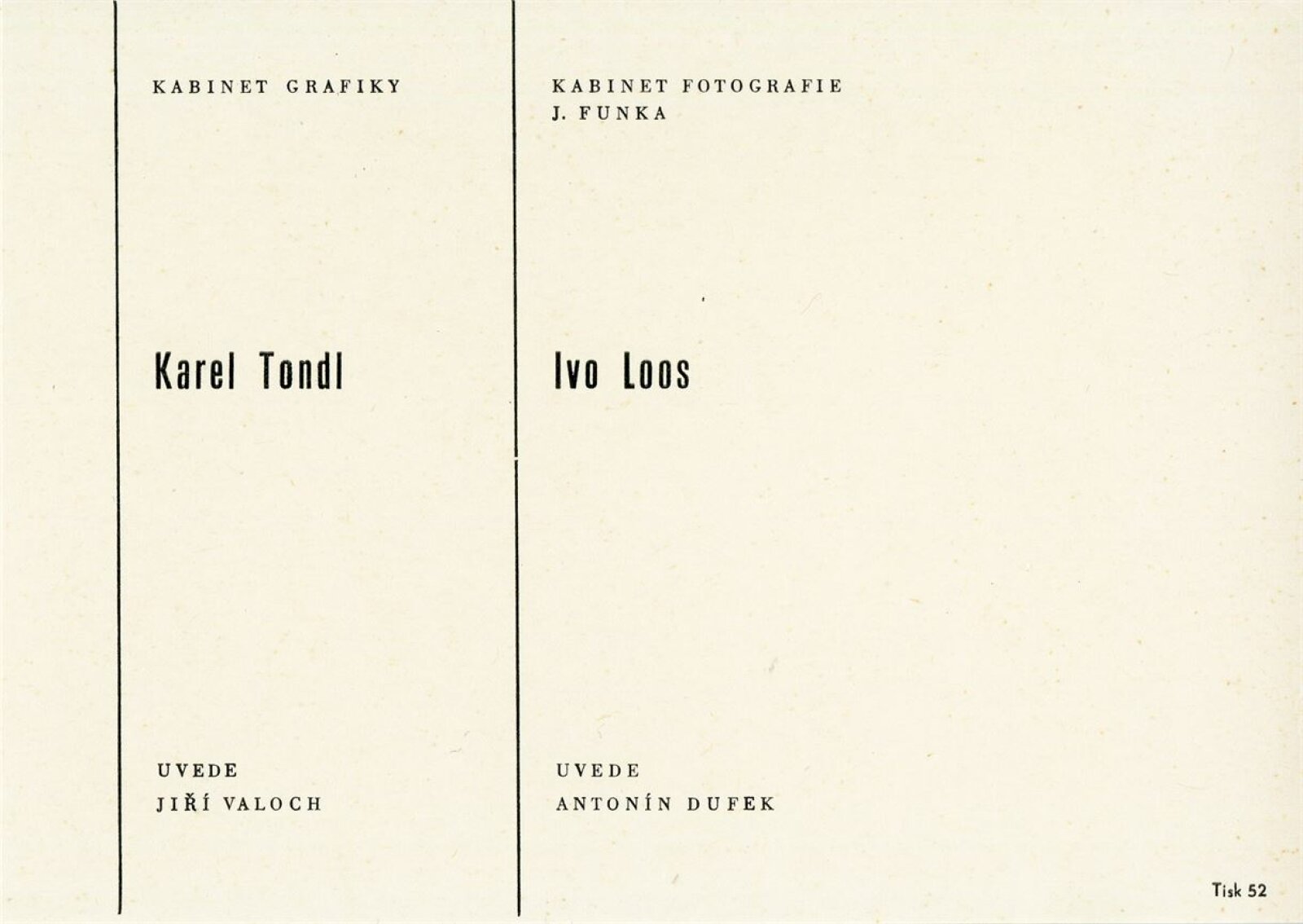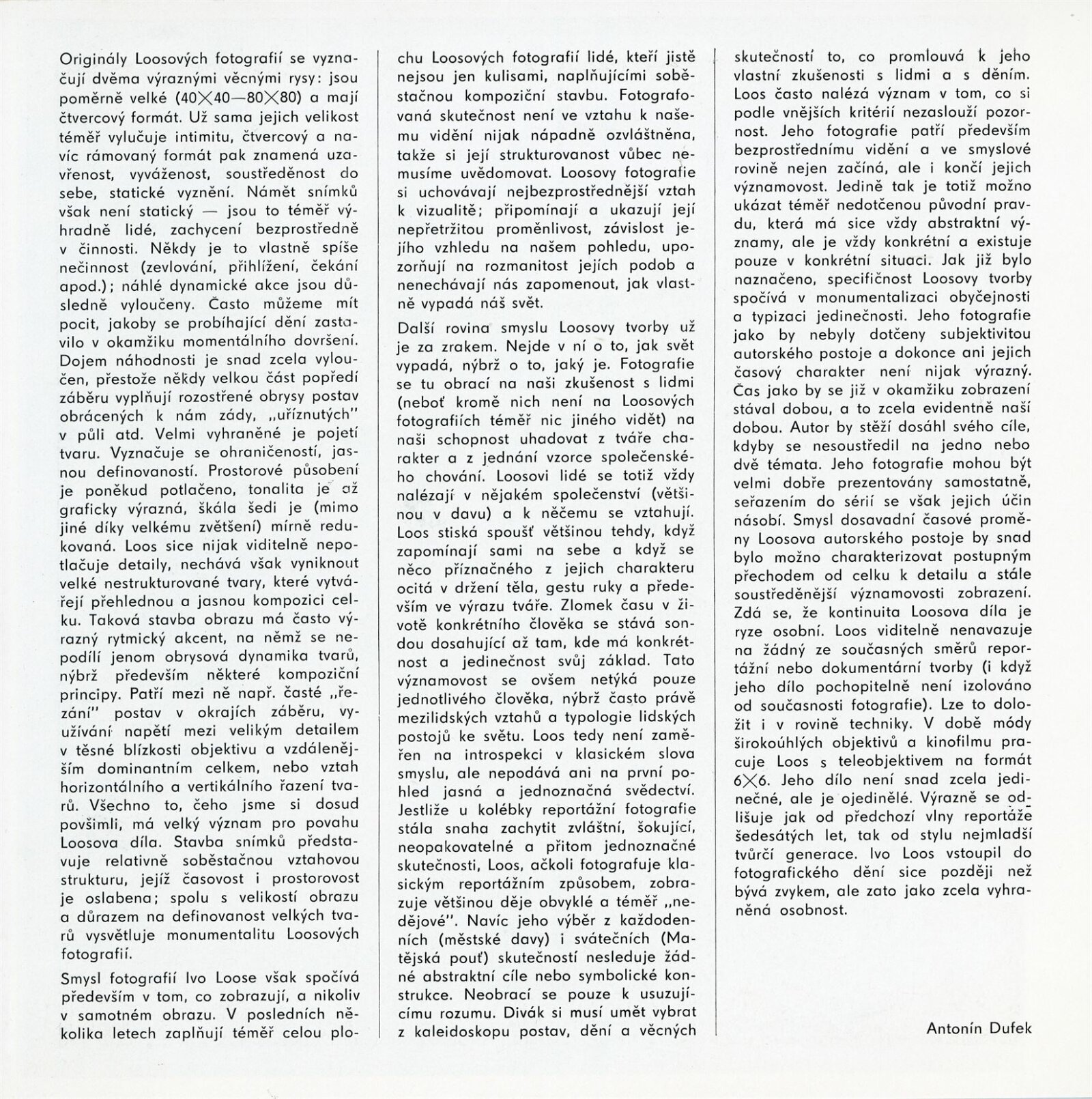 Ivo Loos. Poutě a tváře. Ukázky z cyklu Etudy na dané téma. Brno 1974: Dům umění / Dům pánů z Kunštátu, Kabinet fotografie Jaromíra Funka, 26. 4. – 2. 6. 1974 / Text: Antonín Dufek. – Brno: DUmB, 1974. – 16 s., obr., portrét, životní data, DPK 569. – MZK; MG