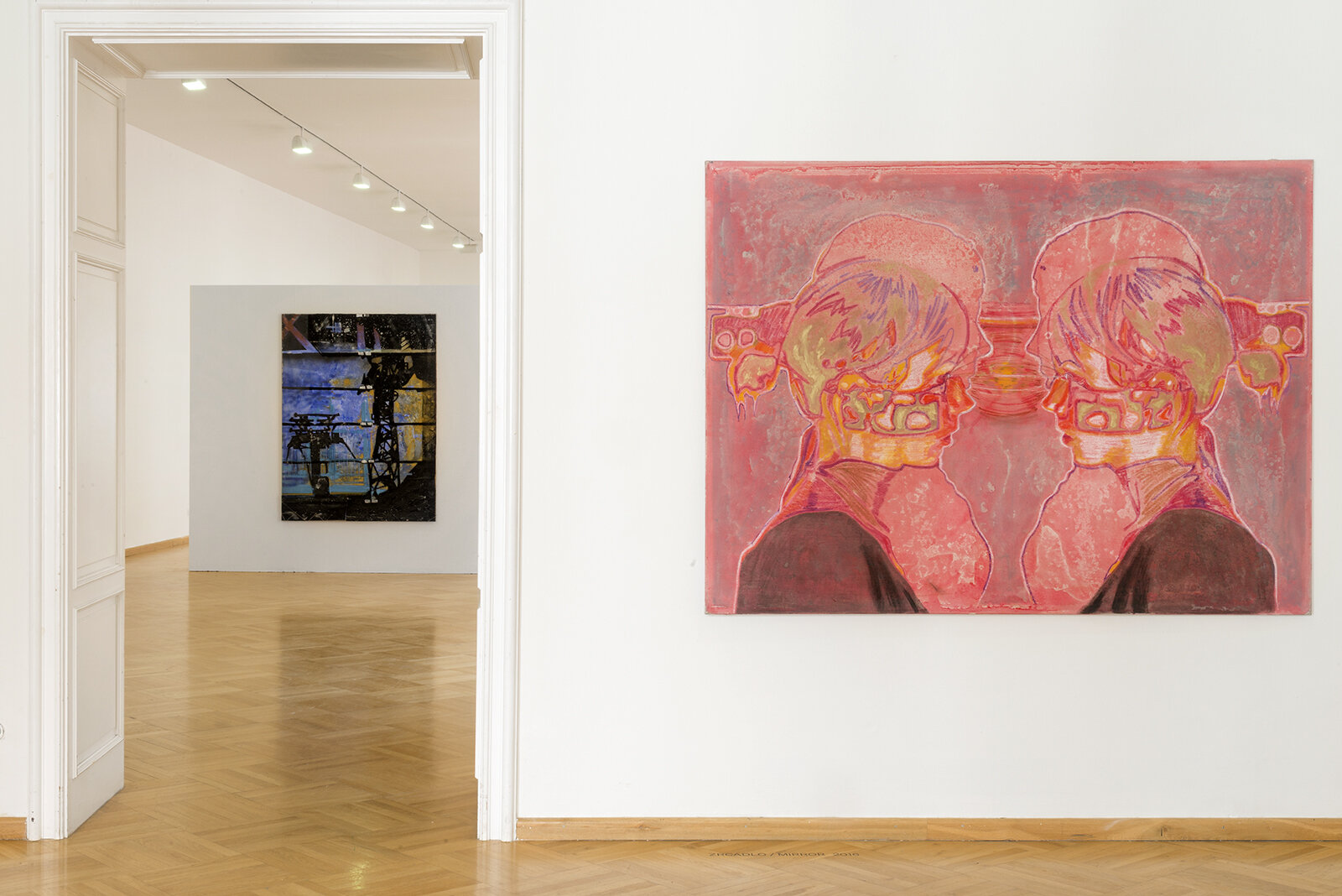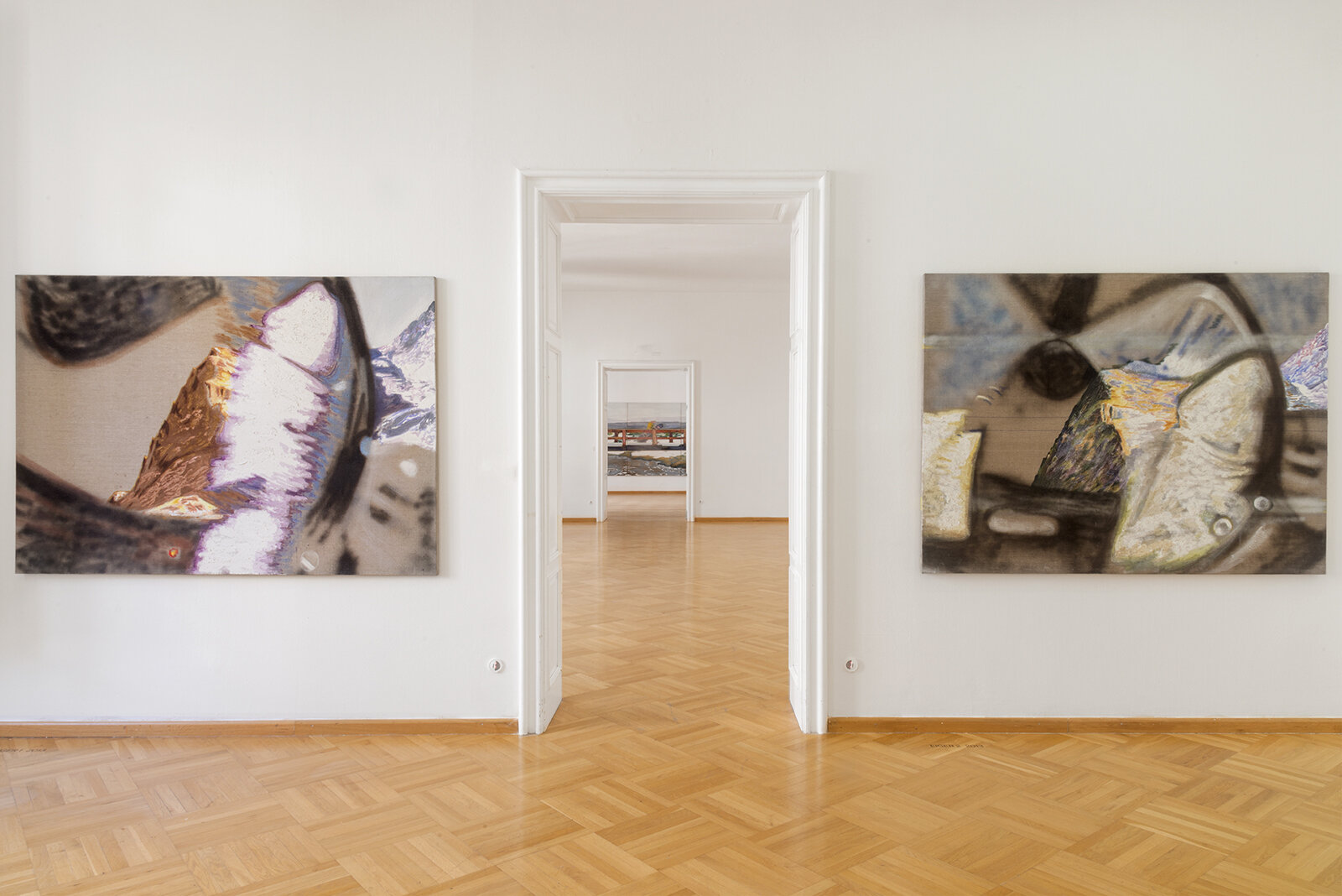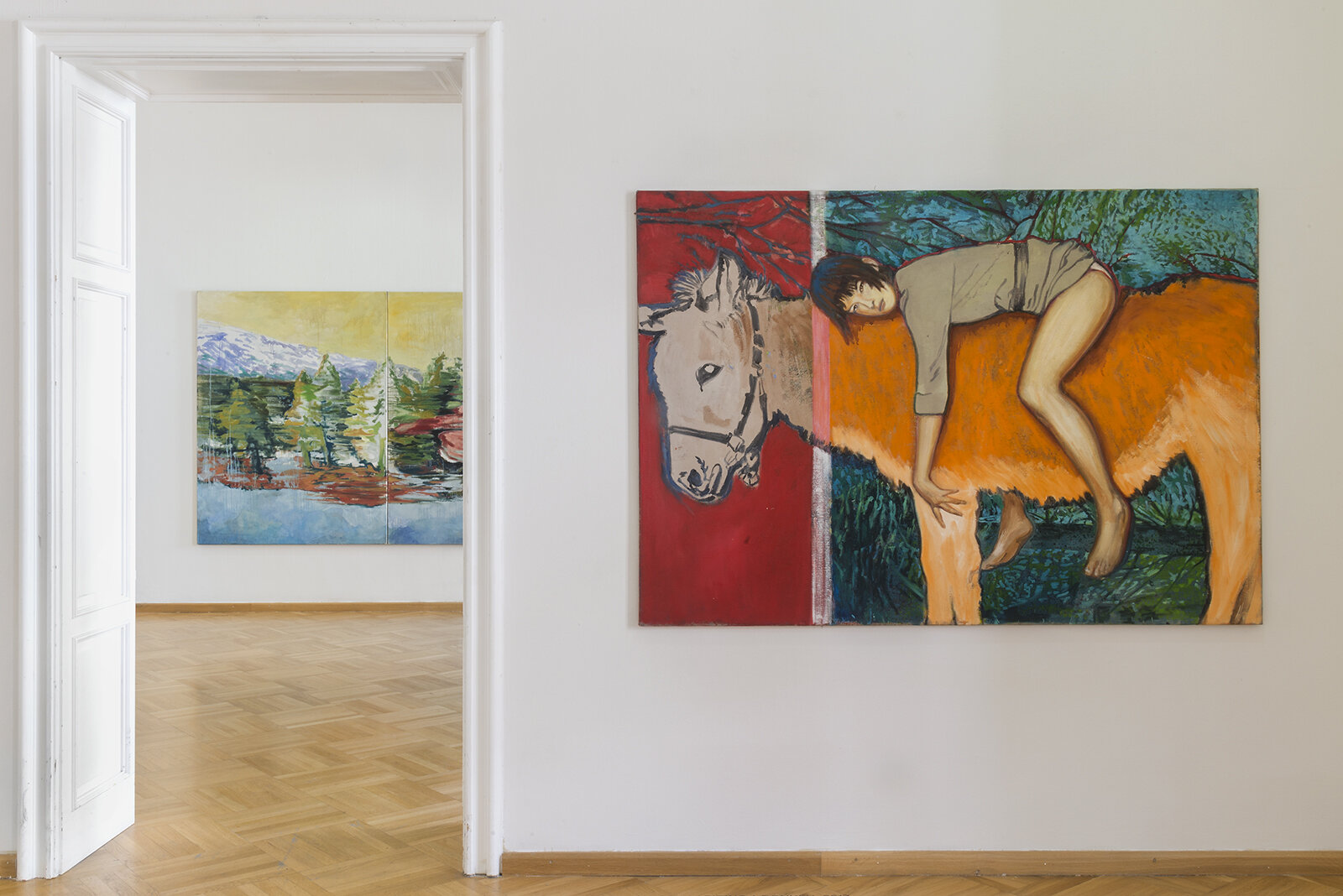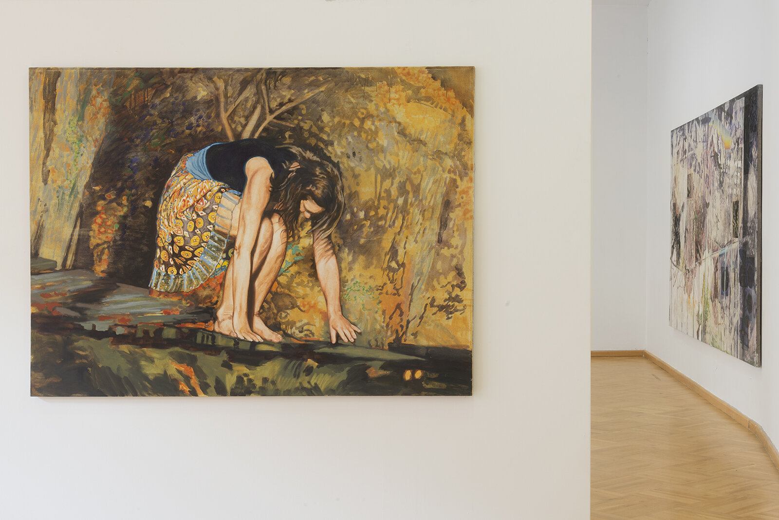 Veselý works in extensive loosely connected cycles which often consist of large paintings on canvas. His creations focus on the visual aspects of contemporary world – he paints cities from bird’s eye perspective, records the fleeting moments of intersecting reflections on glass walls on the streets, captures the sensations of going downhill on a snowy mountain side. The colourist situation in the paintings testifies to his extraordinary ability to concentrate on the qualities of the experienced present. They also betray the artist’s inspiration by Old Masters. Being informed by historical painting is particularly obvious in the cycle of paintings in which he combines random blotches of paint with the construction of the Renaissance pictorial space and figures. Veselý's deep thoughts on the spiritual dimension of our world are conveyed by the cycle generally entitled Energy. It presents the artist’s vision of the bardo phenomenon, a transitional space between life and death described in the Tibetan Book of the Dead. In the most recent paintings by Libor Veselý, called A Girl on a Donkey – An Allegory of Partnership, it is possible to discern details suggesting hidden spiritual content. An encounter with paintings by Libor Veselý is an entry to a strange parallel world disclosing the artist’s inner reality. His works synthesise numerous impulses, exhibit continuity both with European historic painting and modern and contemporary culture. The colouristic approach to painting convinces us of the painter’s unusual ability to concentrate on the perception of the here and now, capturing the sensory experience as well as his sensitivity to colour.