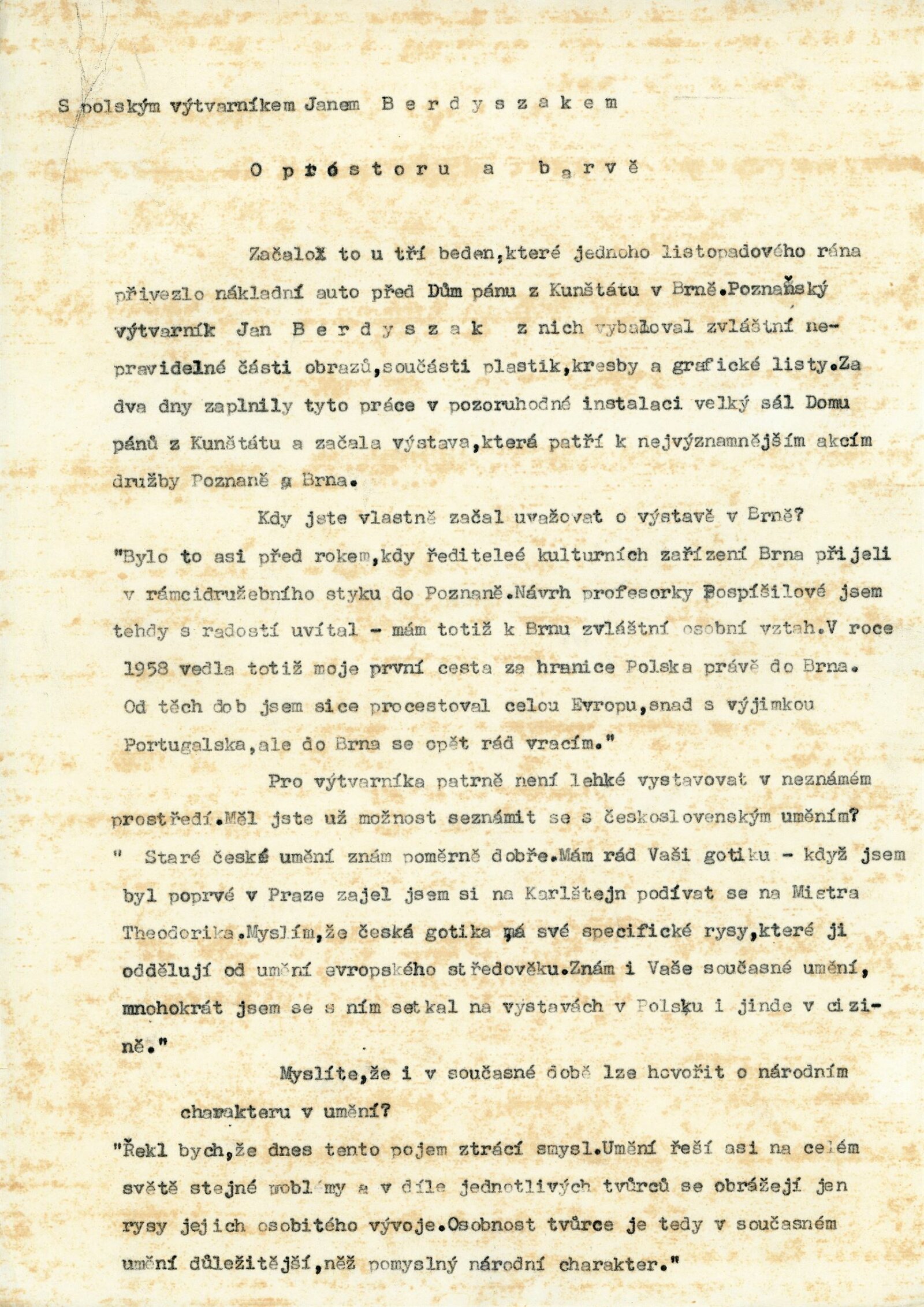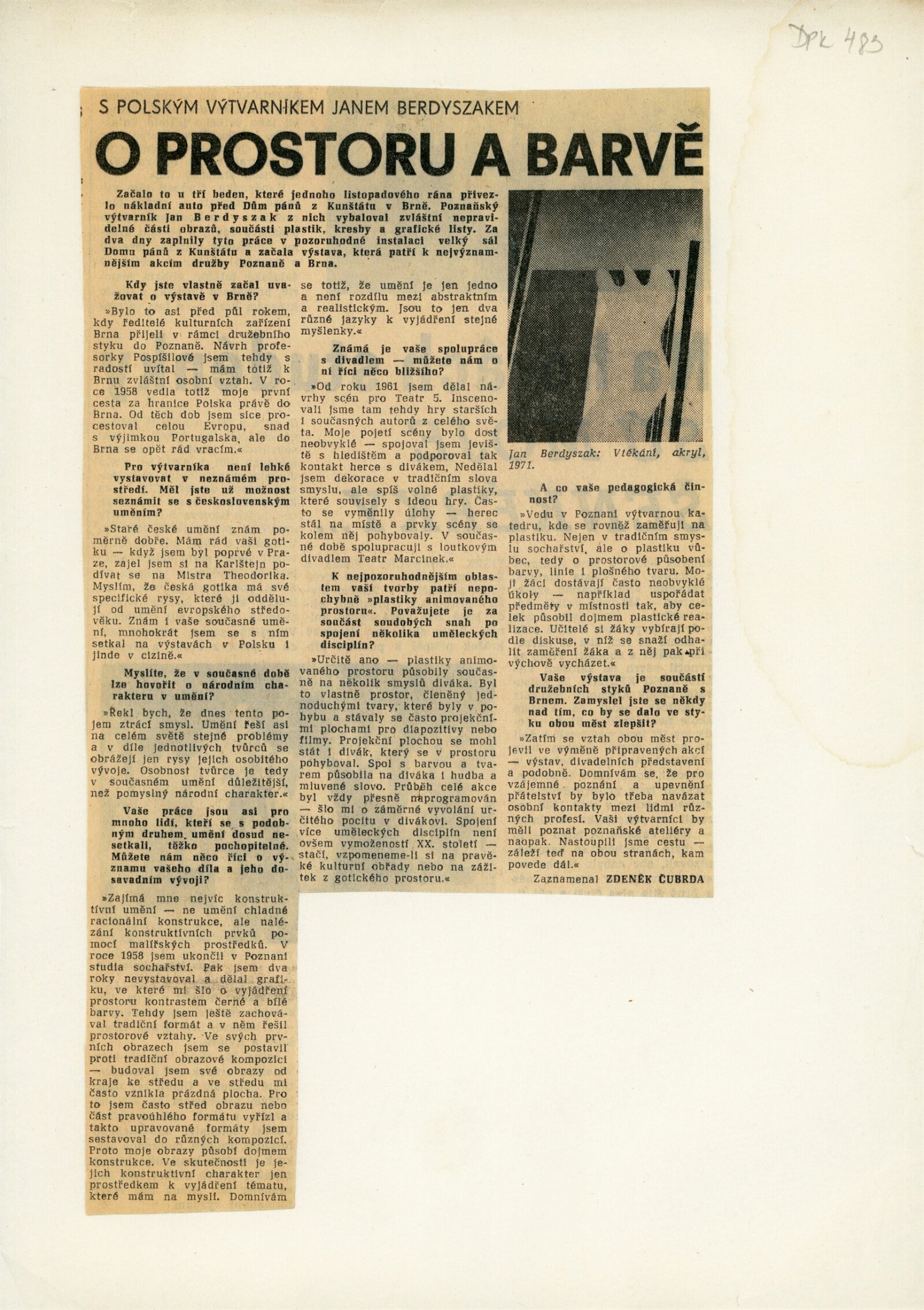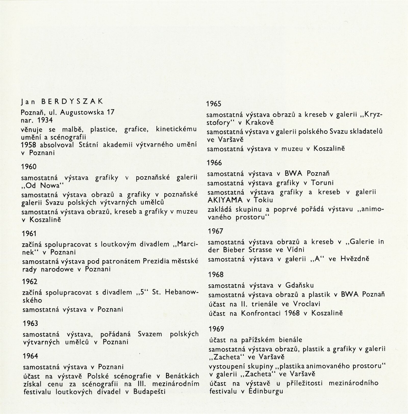 katalog, strojopis úvodního slova k výstavě (Gerta Pospíšilová), strojopis (myšlenky Jana Berdyszaka, rozhovor s Janem Berdyszakem), pozvánka na tiskovou konferenci a vyjádření OK NVmB, seznam vystavených děl včetně cen, biografie, maketa katalogu, fotografie pro katalog, strojopis textu pro katalog (Božena Kowalska), další podklady pro katalog (maketa katalogu), korespondence (Jana Berdyszaka a Gerty Pospíšilové), anotace, provozní korespondence, žádost o povolení výstavy, recenze v tisku, katalogy (Poznaň 1968, Sopot 1970, Londýn 1969), plakát (Poznaň 1968)