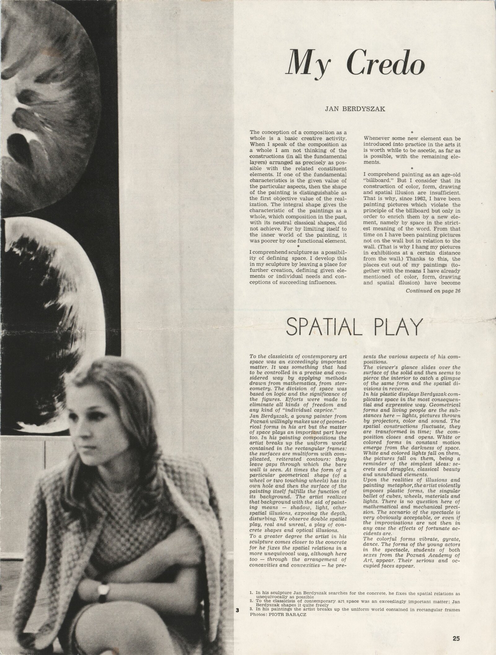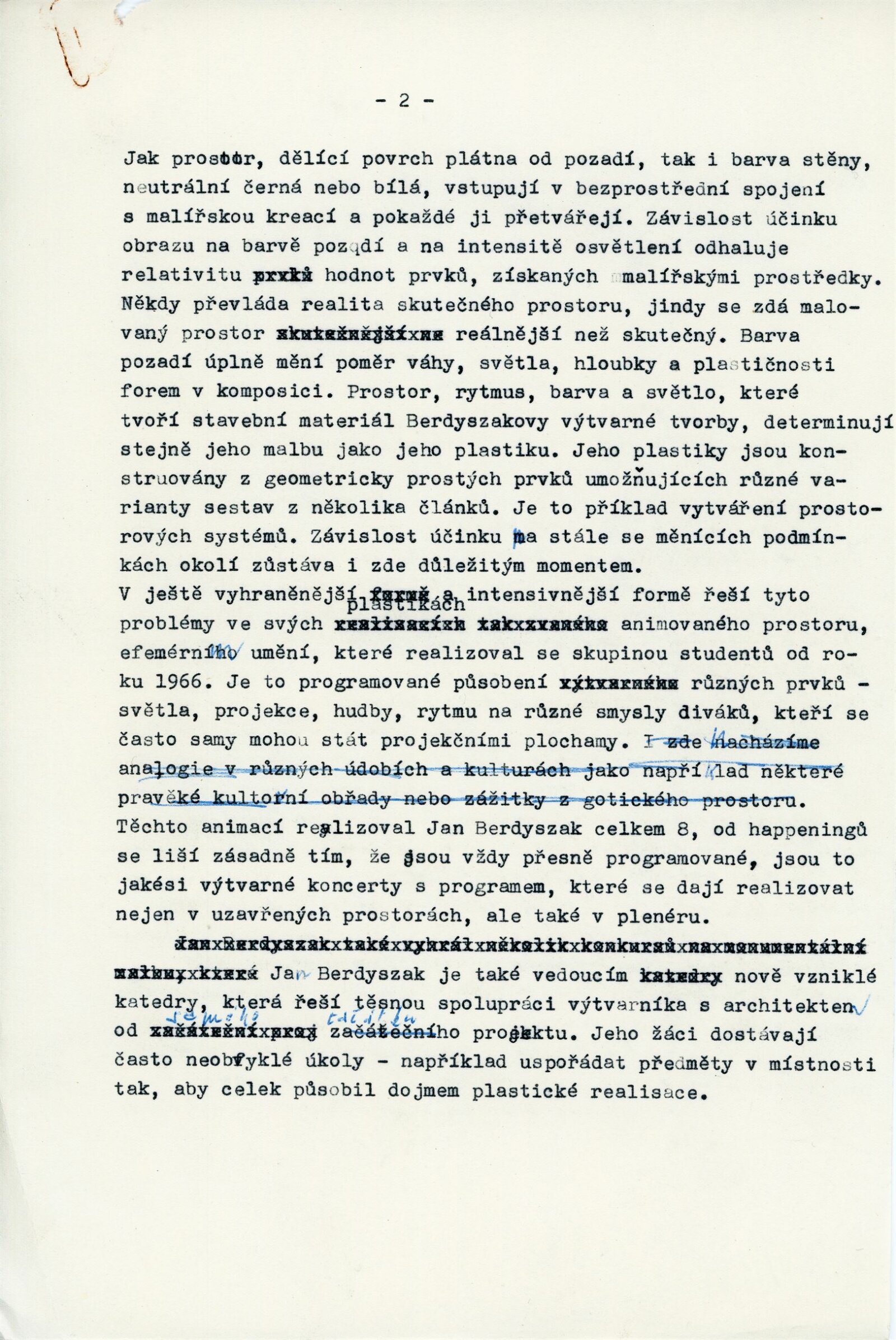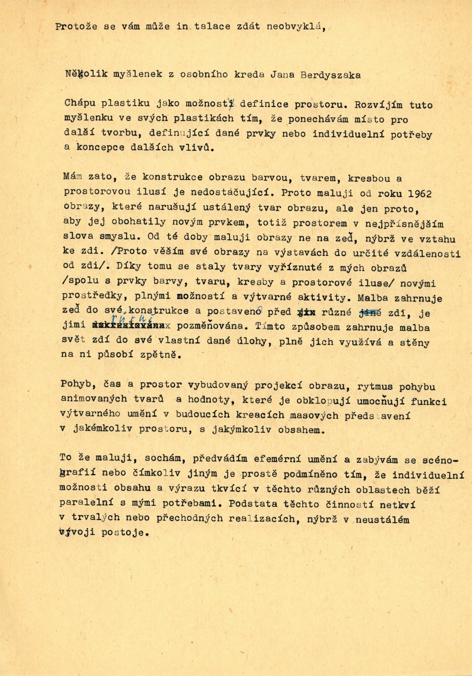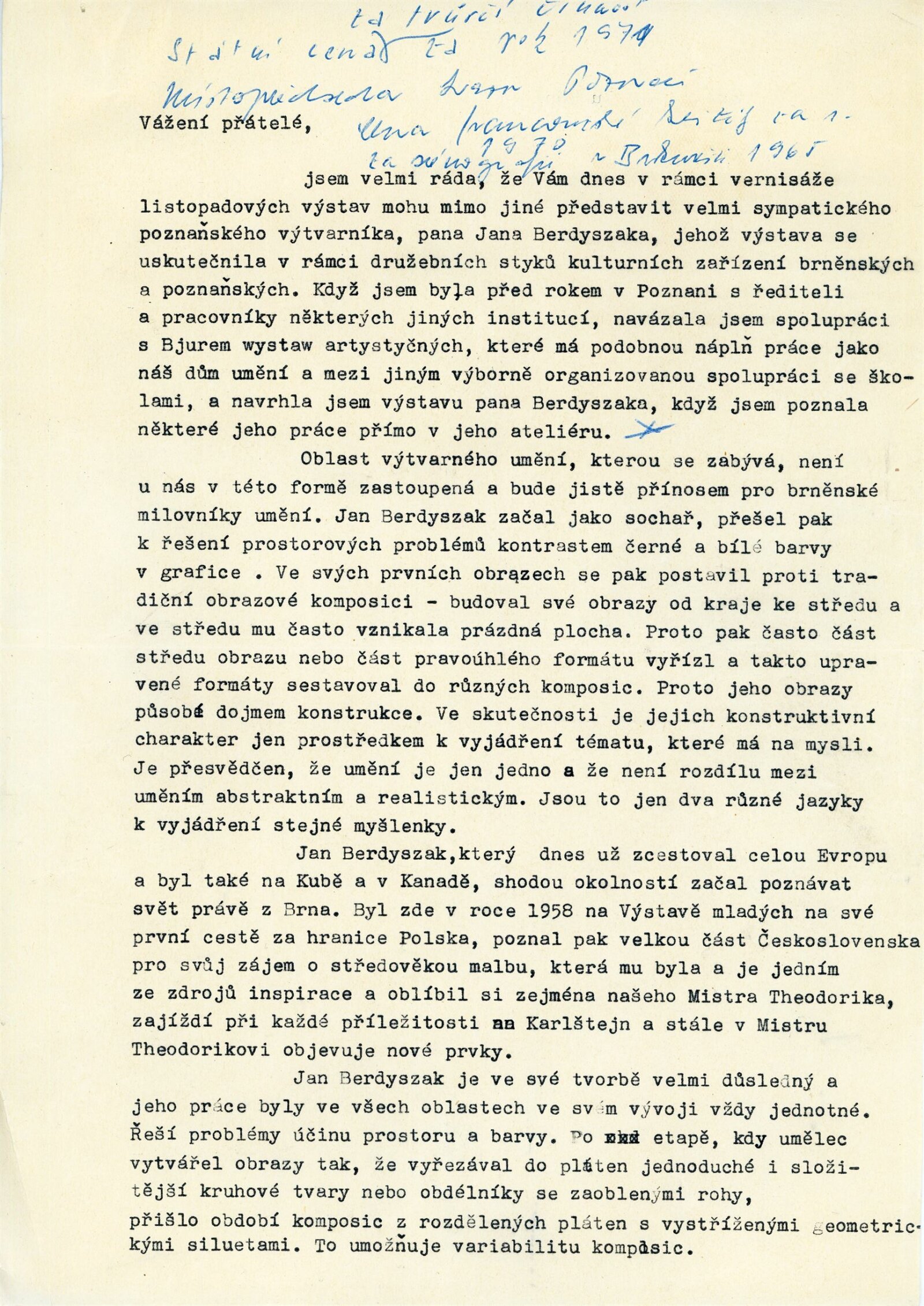 katalog, strojopis úvodního slova k výstavě (Gerta Pospíšilová), strojopis (myšlenky Jana Berdyszaka, rozhovor s Janem Berdyszakem), pozvánka na tiskovou konferenci a vyjádření OK NVmB, seznam vystavených děl včetně cen, biografie, maketa katalogu, fotografie pro katalog, strojopis textu pro katalog (Božena Kowalska), další podklady pro katalog (maketa katalogu), korespondence (Jana Berdyszaka a Gerty Pospíšilové), anotace, provozní korespondence, žádost o povolení výstavy, recenze v tisku, katalogy (Poznaň 1968, Sopot 1970, Londýn 1969), plakát (Poznaň 1968)