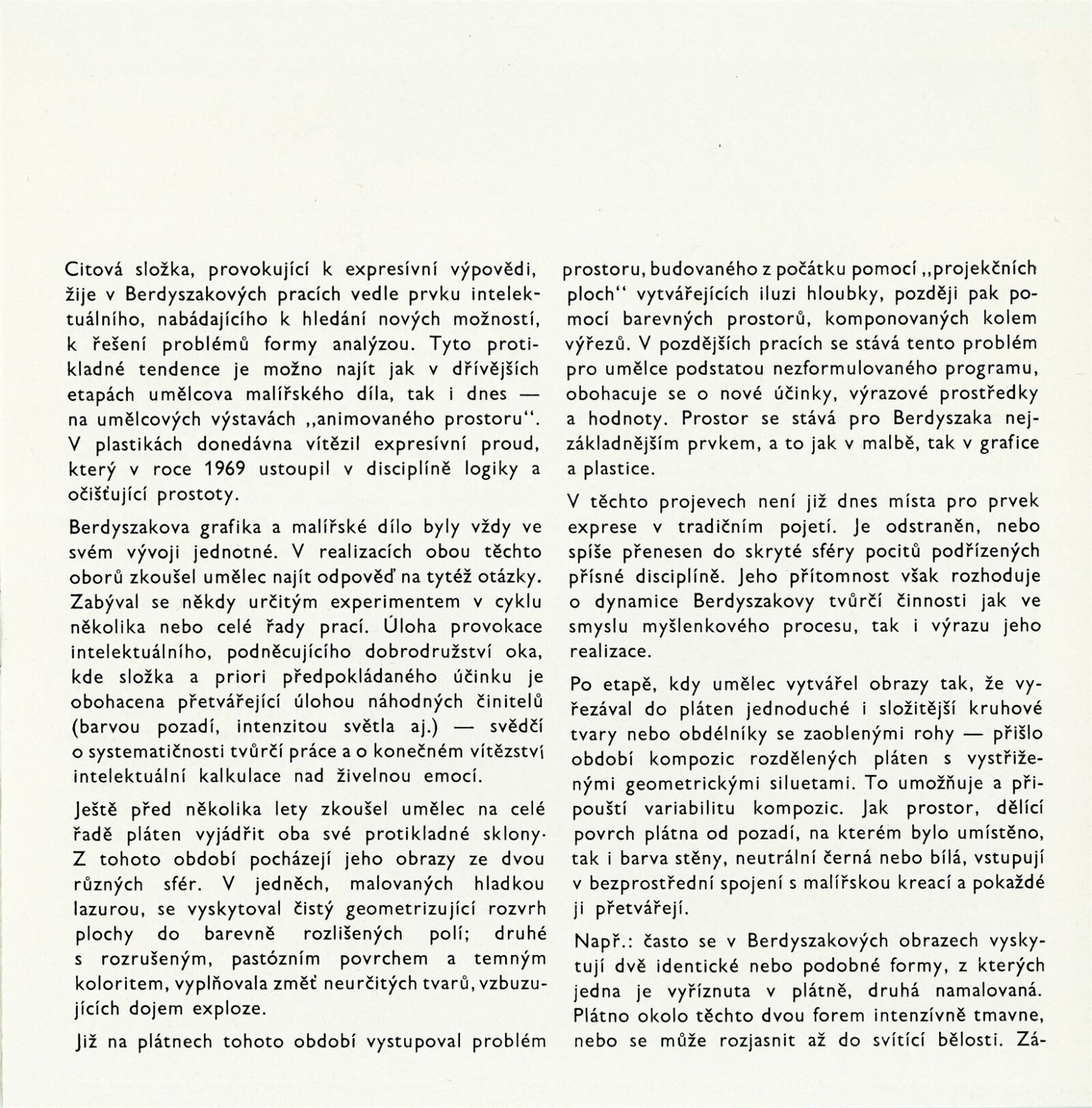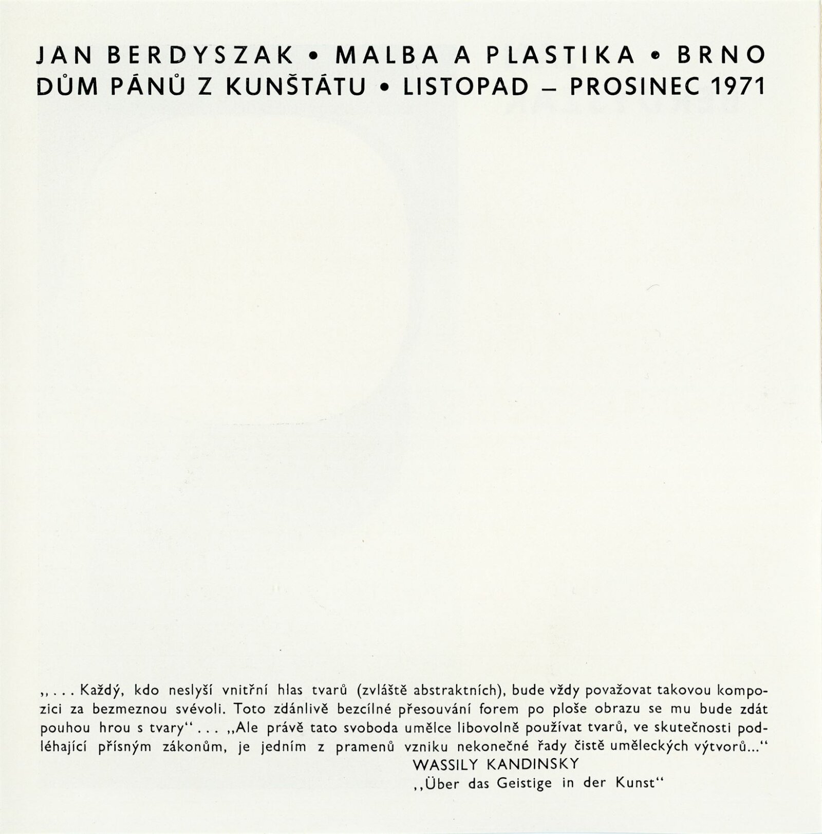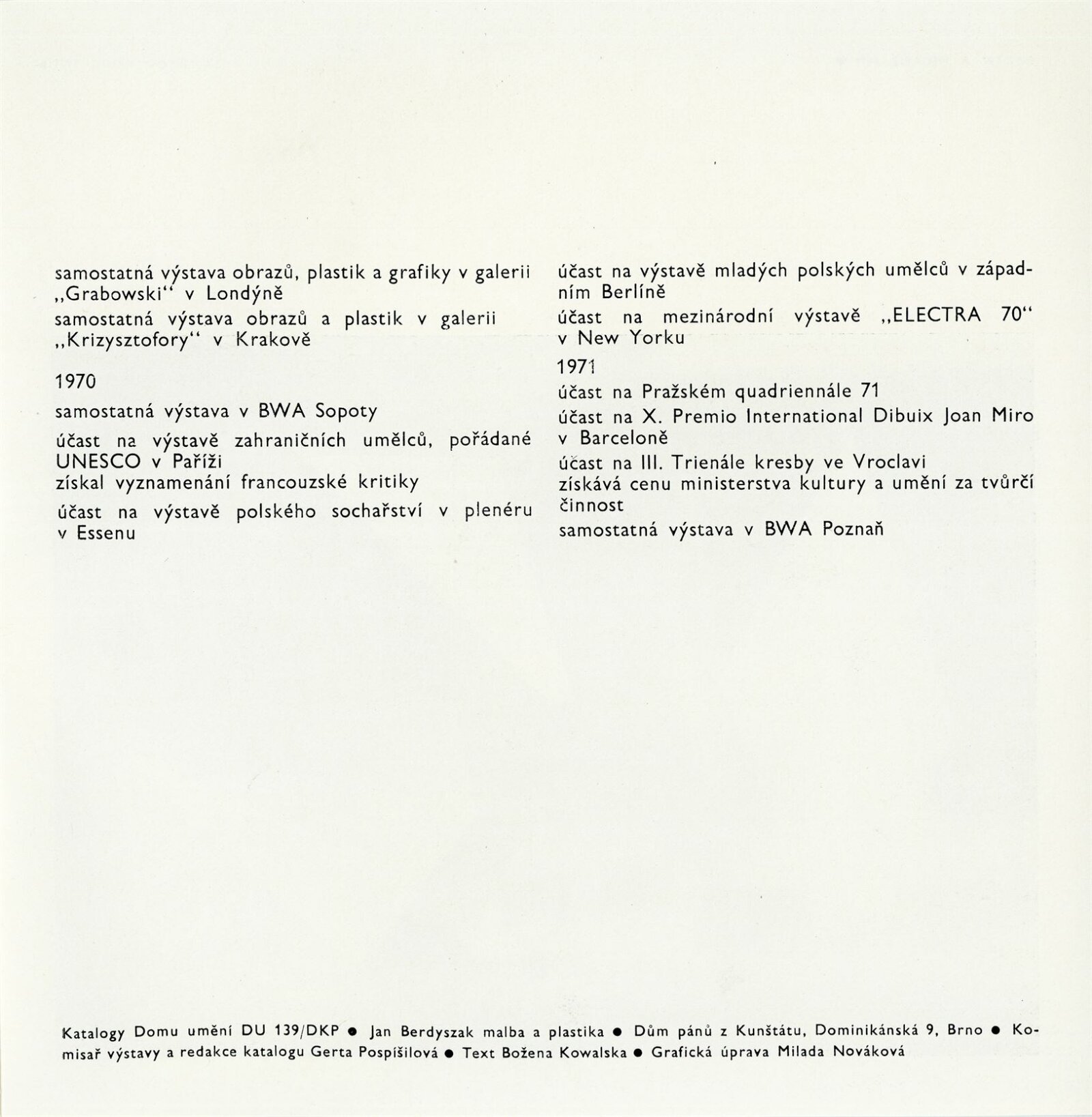 Jan Berdyszak. Malba, plastika: Dům umění města Brna / Dům pánů z Kunštátu, 17. 11. – 5. 12. 1971 / Text: Božena Kowalska. – Brno: DUmB, 1971. – 12 s., obr., životopis, DPK 483. – MZK; MG; MMB