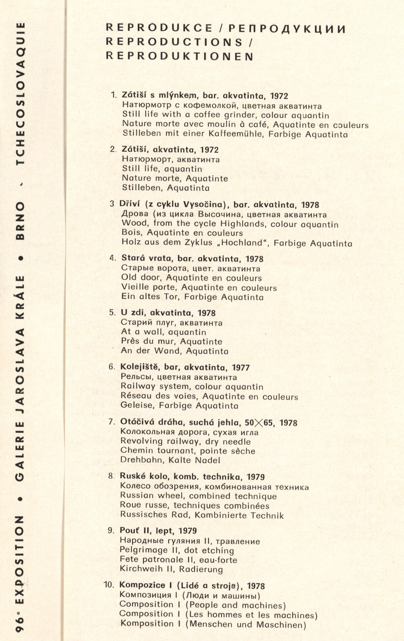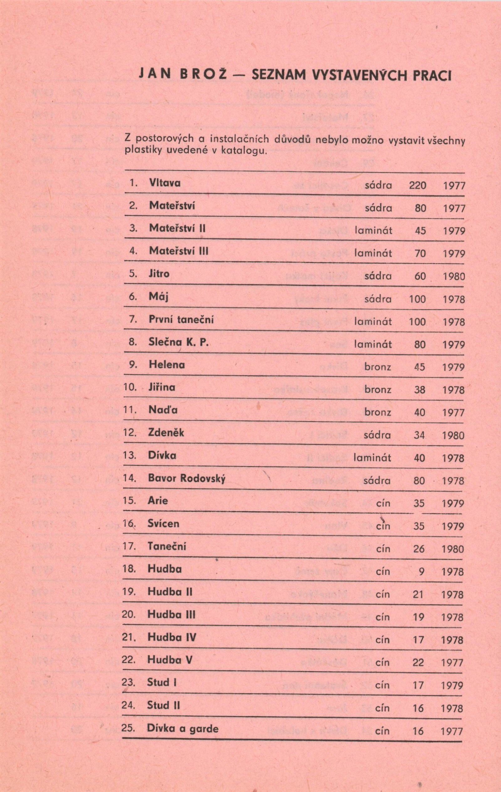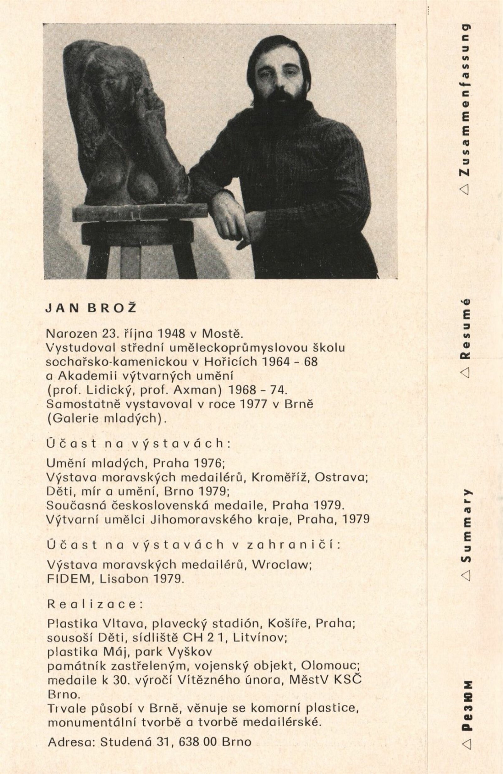 Jan Brož. Sochy: Dům umění, 98. výstava v Galerii Jaroslava Krále, 21. 2. – 23. 3. 1980 / Text: Zdeněk Čubrda. – Brno: ČFVU, 1980. – 10 s., obr., seznam vystavených prací 2 s., portrét, životní data, výstavy, realizace, DU 710. – MZK; MG