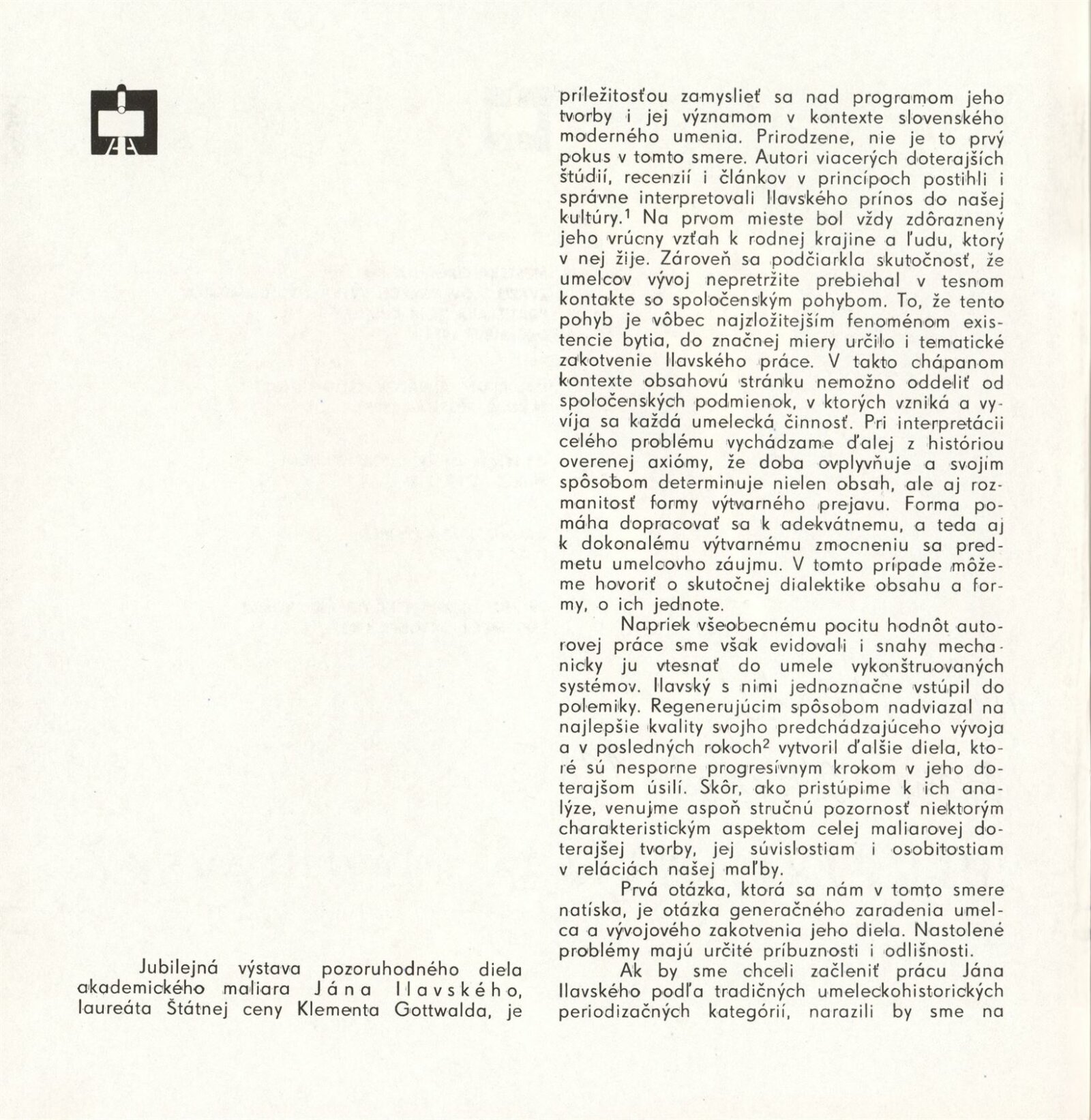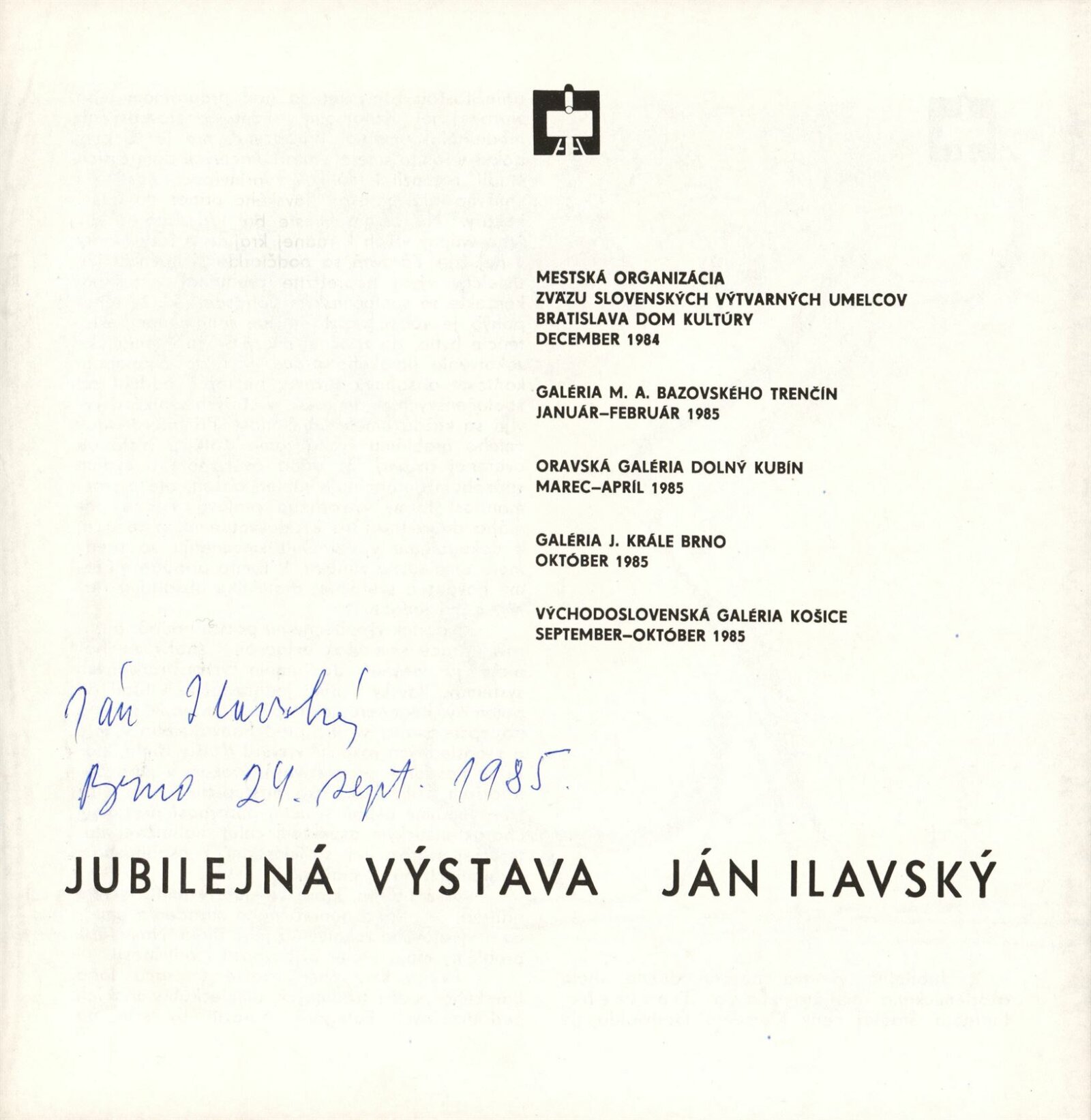 Ján Ilavský. Jubilejná výstava: Dům umění, Galeria Jaroslava Krále, 24. 9. – 13. 10. 1985 / Text: Ľudo Petránsky. – Bratislava: Mozsvu, 1985. – 46 s., obr., portrét, životní data, výstavy, realizace v architektuře, DU 801