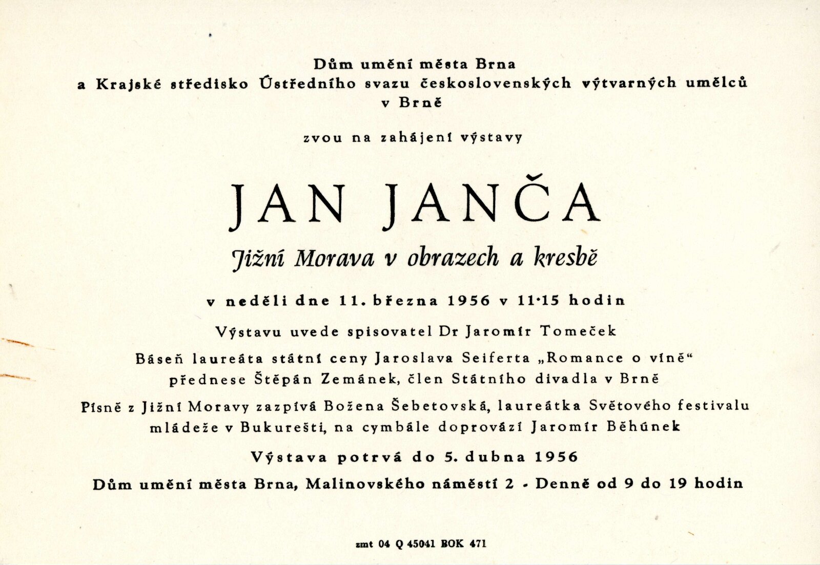 Jan Janča. Jižní Morava v obrazech a kresbách: Dům umění, Malá galerie, 11. 3. – 5. 4. 1956 / Text: Jaromír Tomeček. – Brno: DUmB,1956. – skládačka, 6 s., obr., DU 244. – MG