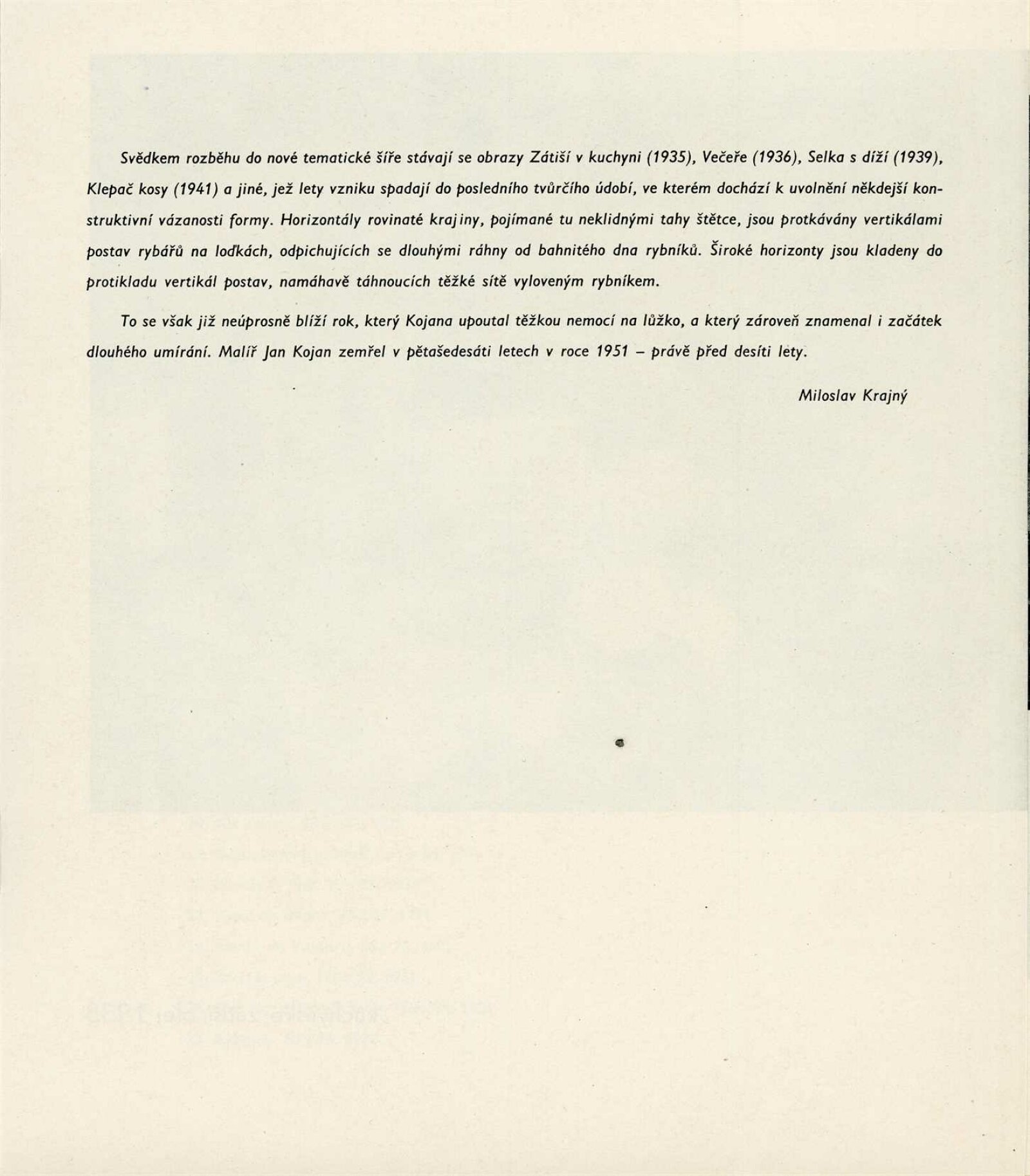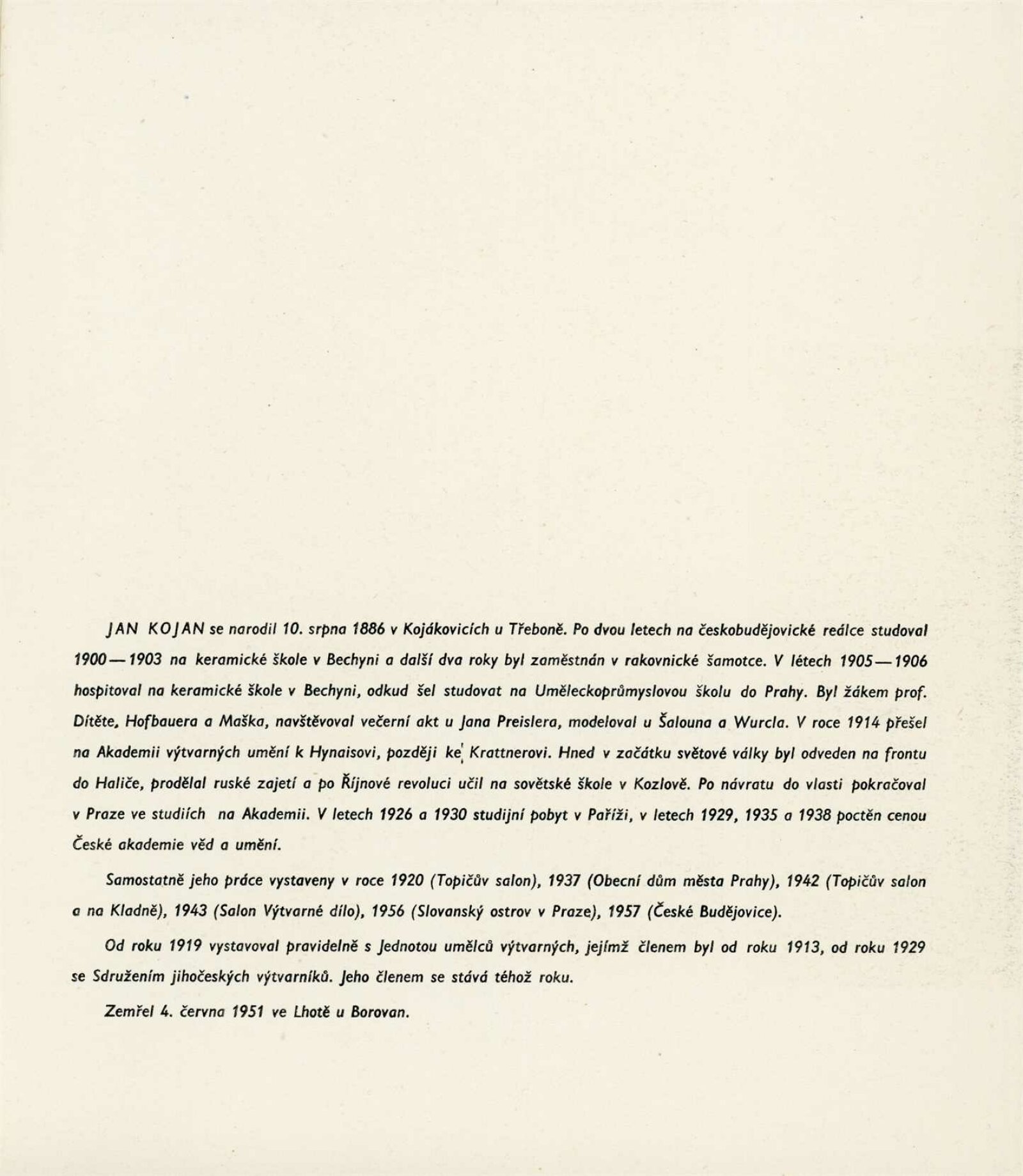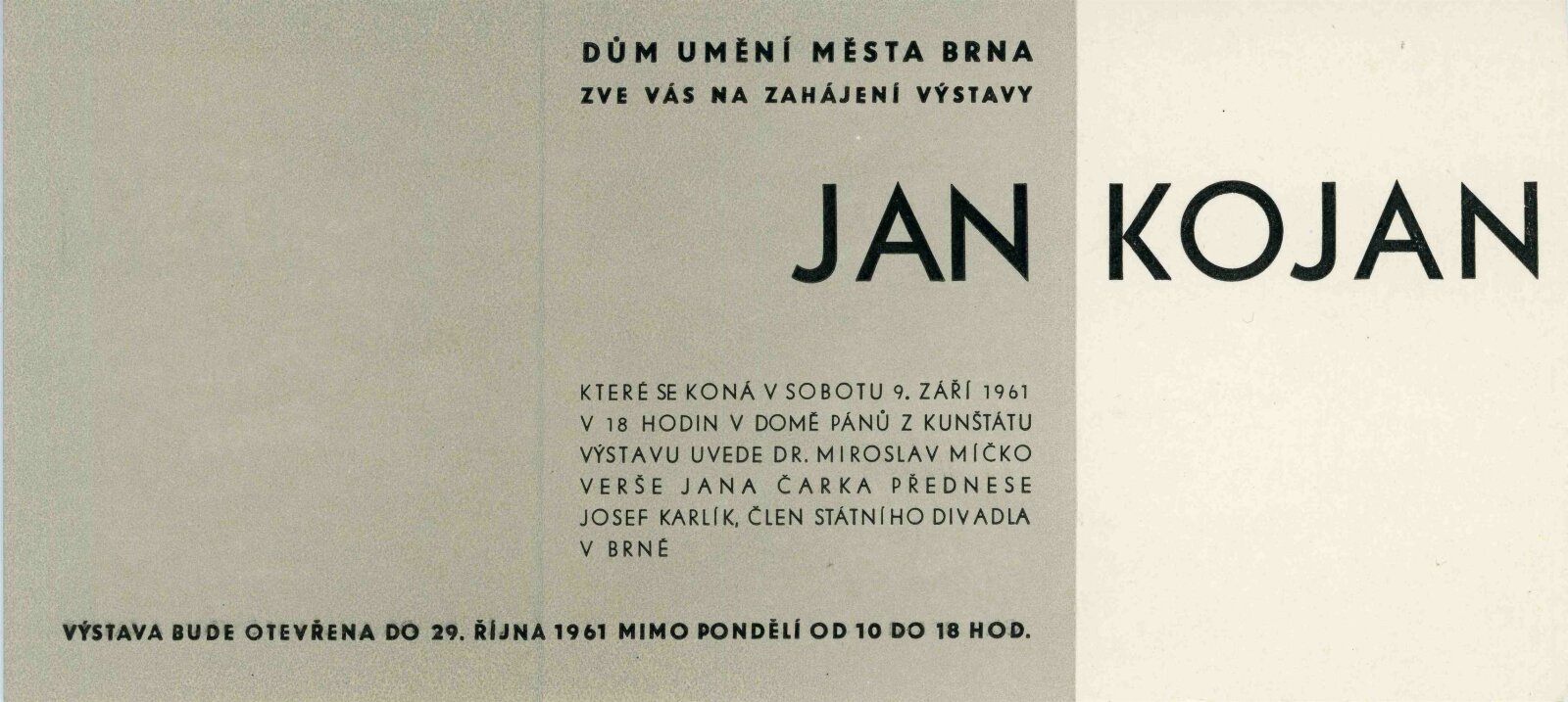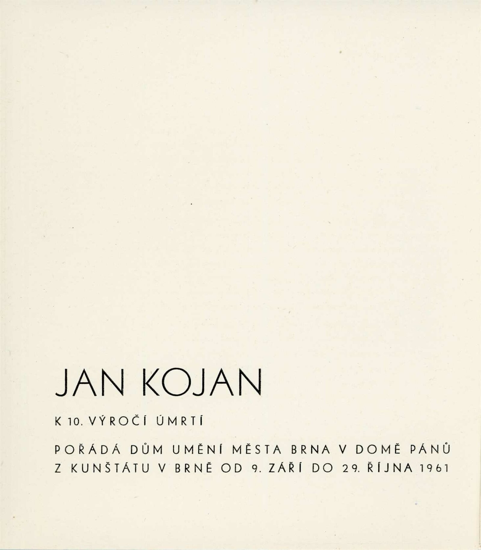 Jan Kojan. K 10. výročí úmrtí: Dům umění města Brna / Dům pánů z Kunštátu, 9. 9. – 29. 10. 1961 / Text: Miloslav Krajný. – Brno: DUmB, 1961. – 14 s., obr., životopis, DPK 120. – MG; MMB