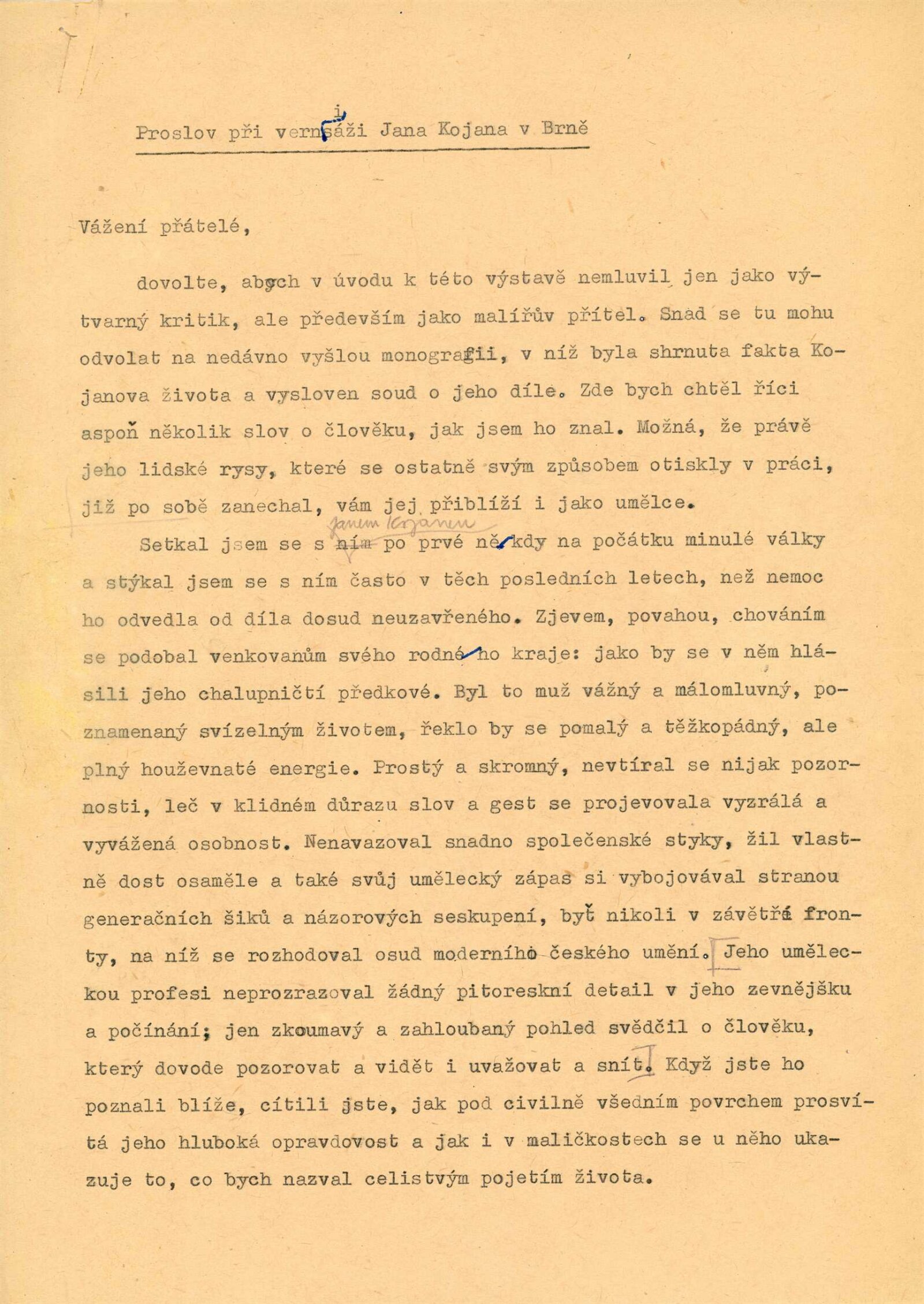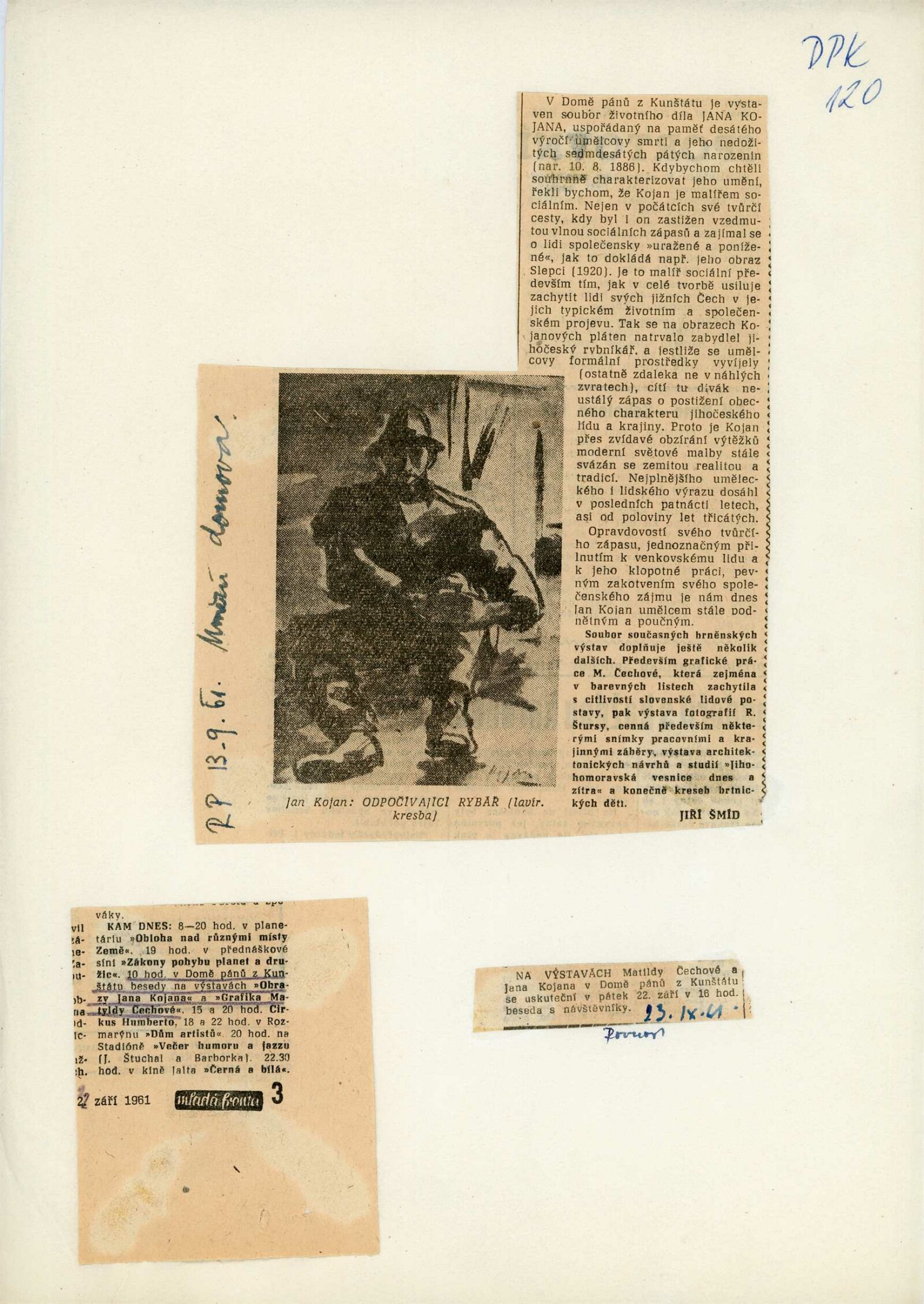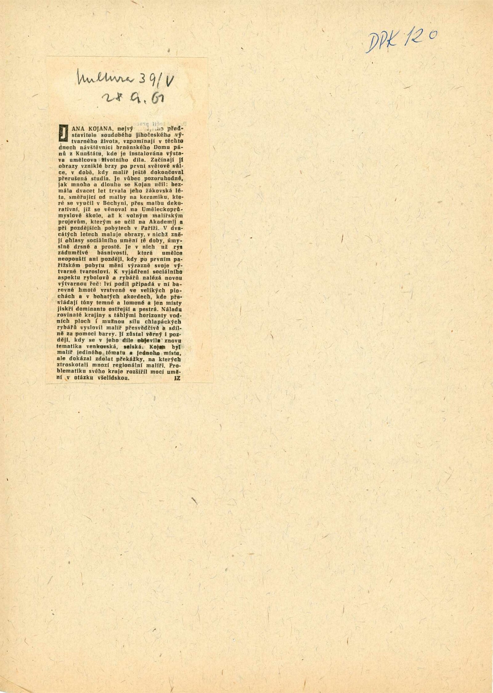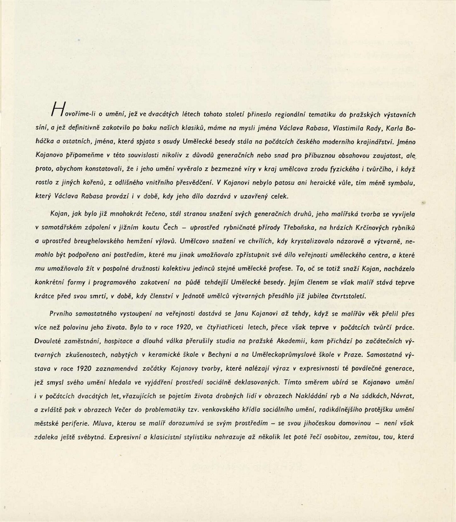 Jan Kojan. K 10. výročí úmrtí: Dům umění města Brna / Dům pánů z Kunštátu, 9. 9. – 29. 10. 1961 / Text: Miloslav Krajný. – Brno: DUmB, 1961. – 14 s., obr., životopis, DPK 120. – MG; MMB
