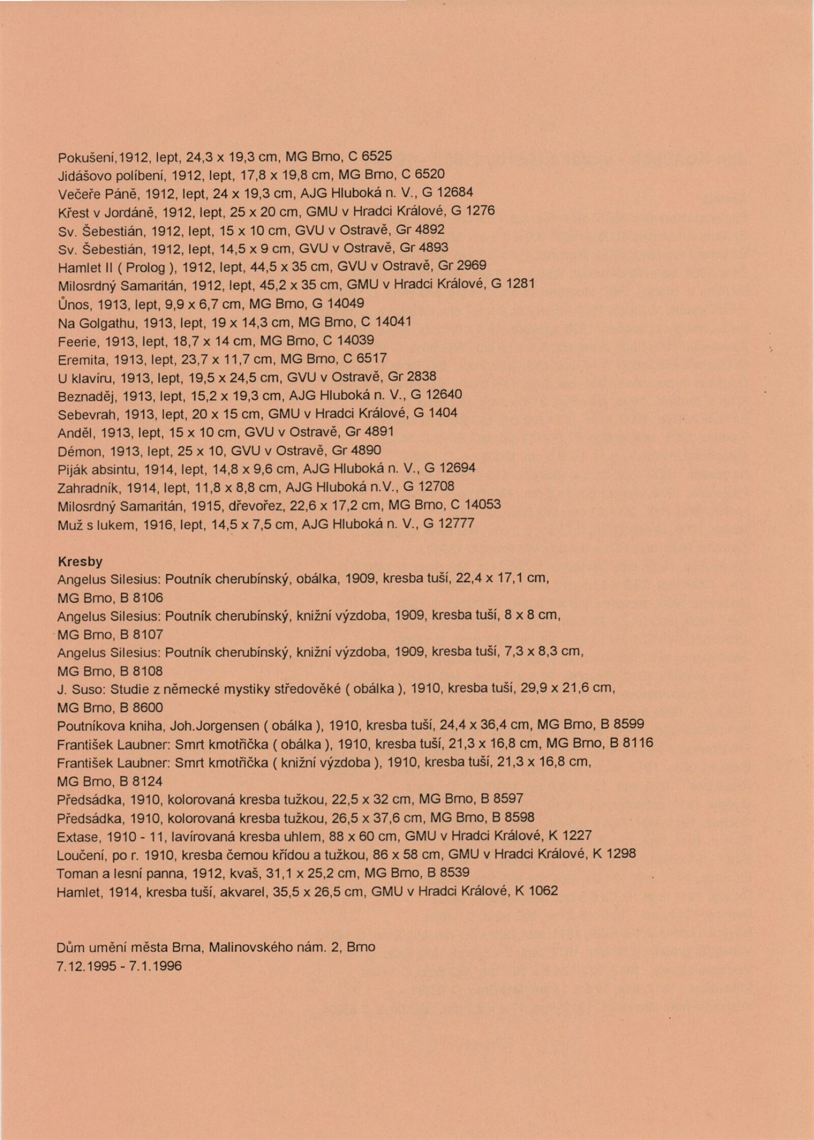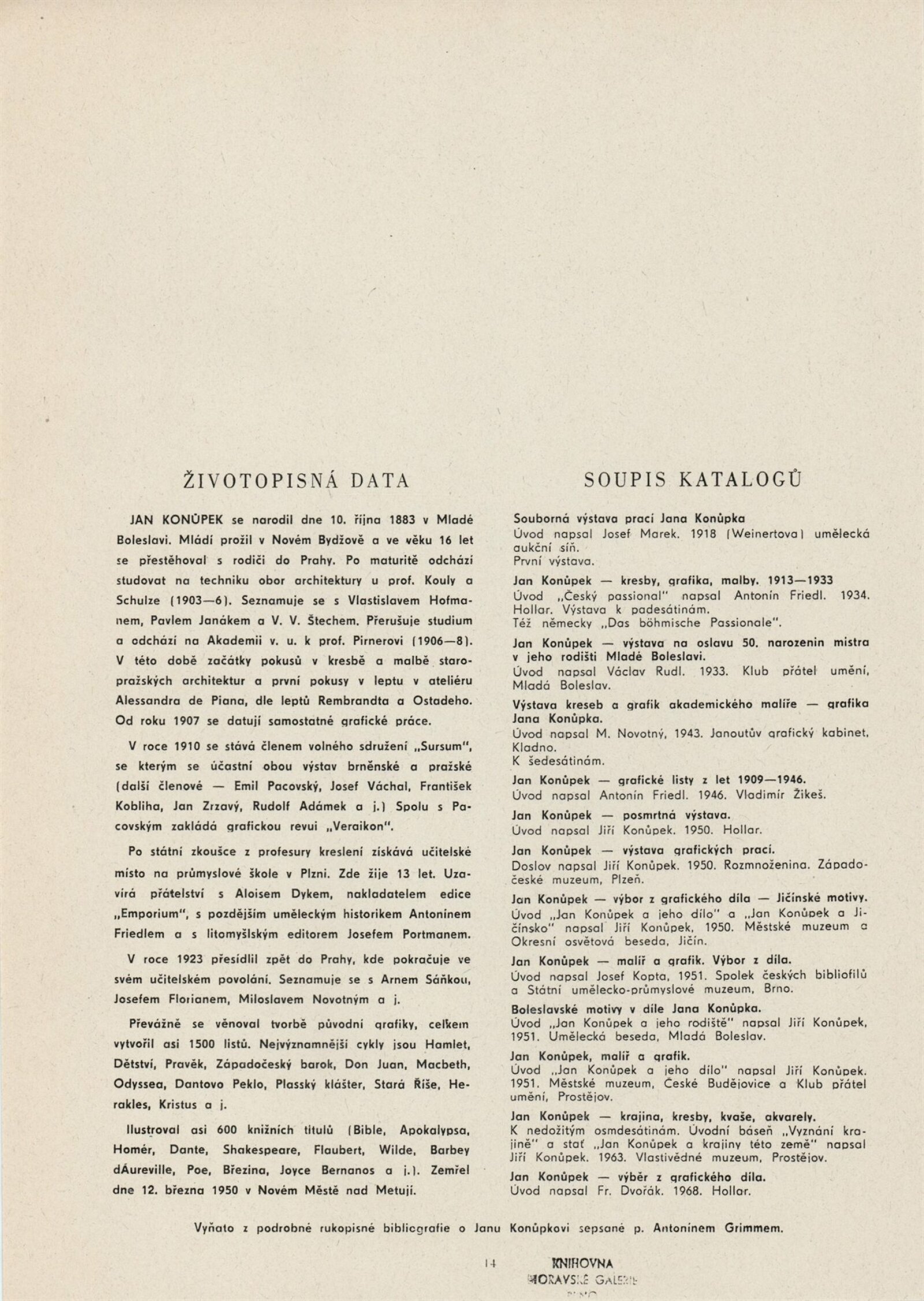 Jan Konůpek. Výběr z tvorby (1905–1915): hala Domu umění 7. 12. 1995 – 7. 1. 1996 / Text Jiřina Hockeová. - Brno: DUmB, - [4] s., obr.+ Výběr z tvorby [2] s. Životní data, výstavy DU 1010