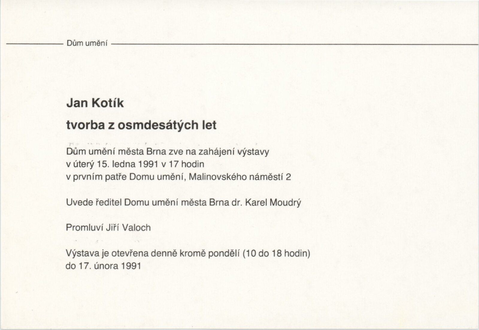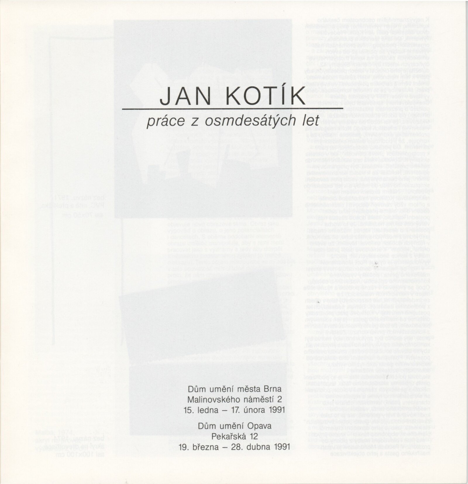 Jan Kotík. Práce z osmdesátých let: Dům umění města Brna, 1. patro, 15. 1. – 17. 2. 1991 / Text: Jiří Valoch. – Brno: DUmB, 1991. – [24] s., obr., životní data, výstavy, DU 893. – MZK; MG