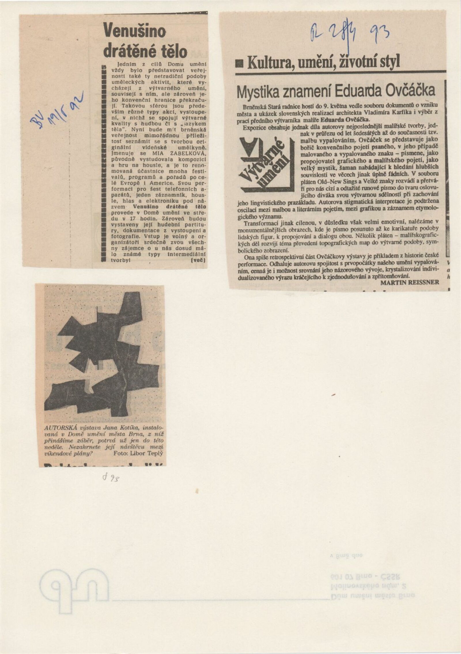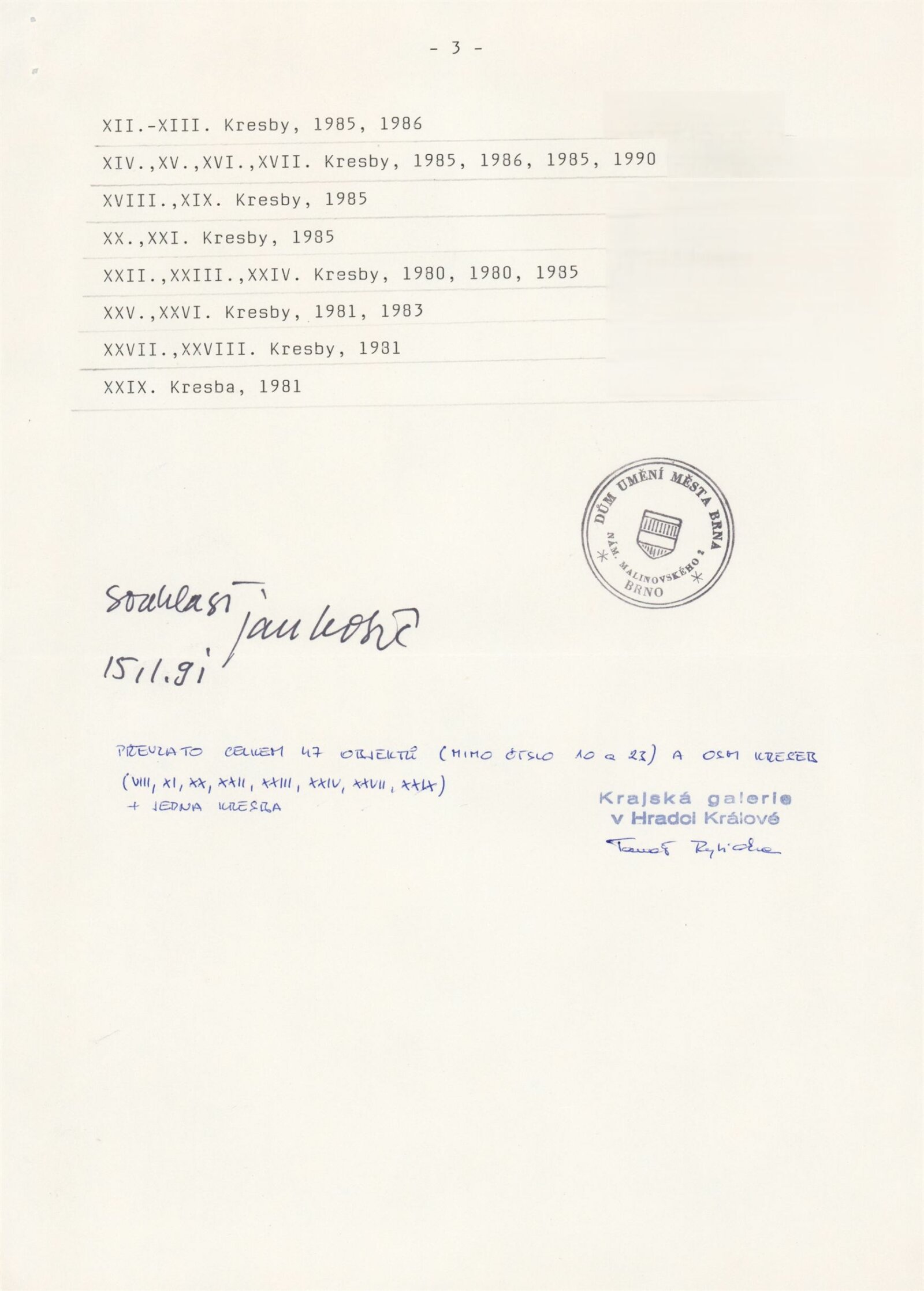 pozvánka, katalog, strojopis podkladů pro katalog, seznam vystavených děl, provozní korespondence, recenze v tisku, poznámky, pozvánky a plakát k výstavě v Hradci Králové (repríza brněnské výstavy)