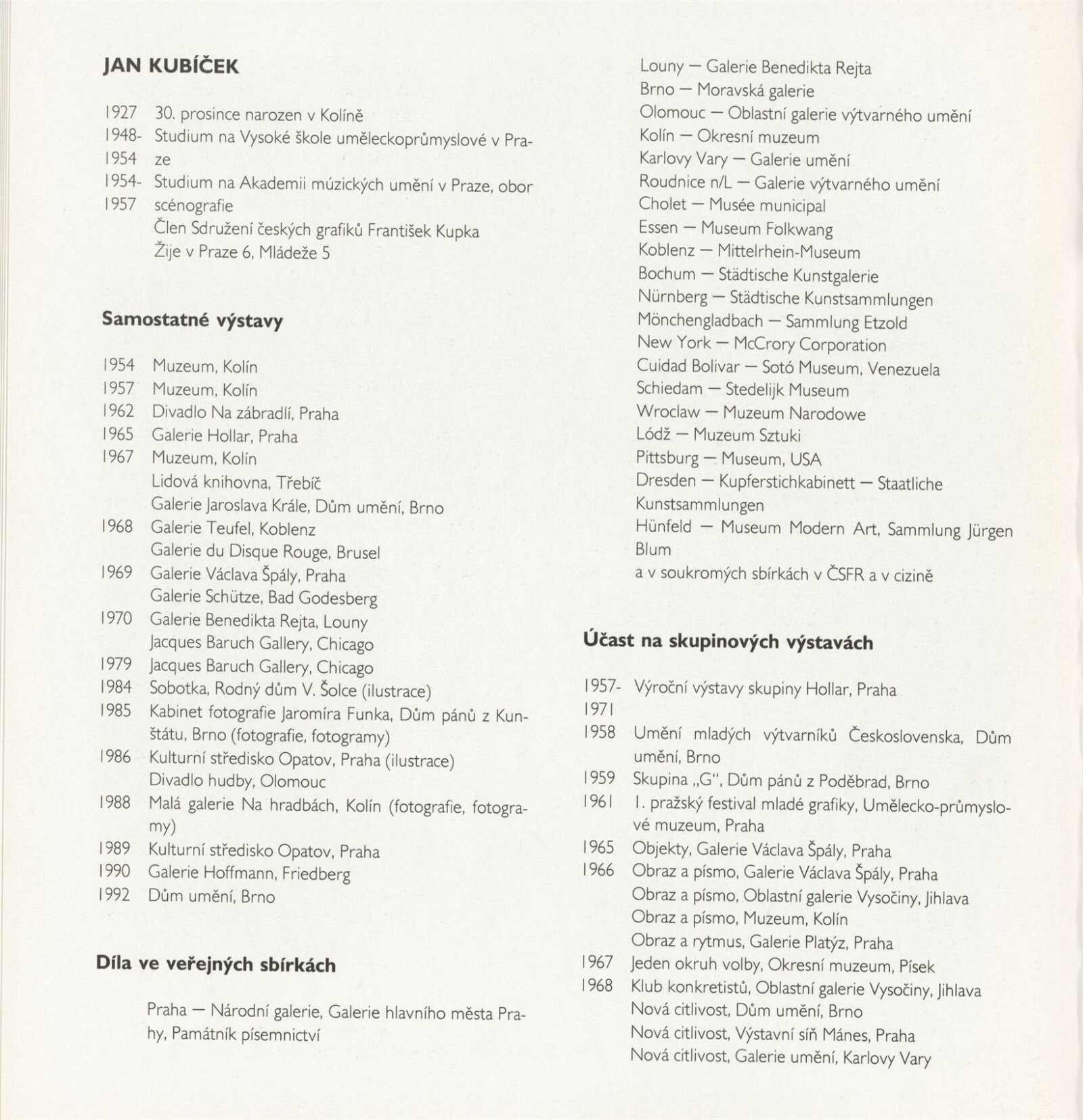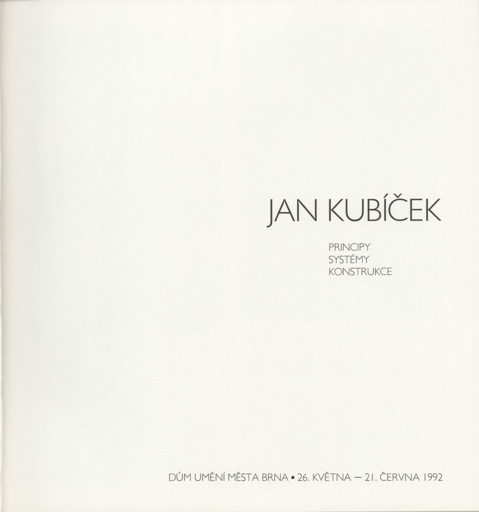 Jan Kubíček. Principy, systémy, konstrukce: Dům umění města Brna, 26. 5. – 21. 6. 1992 / Text: Jiří Valoch. – Brno: DUmB, 1992. – [30] s., obr., životní data, výstavy, díla ve sbírkách, DU 925