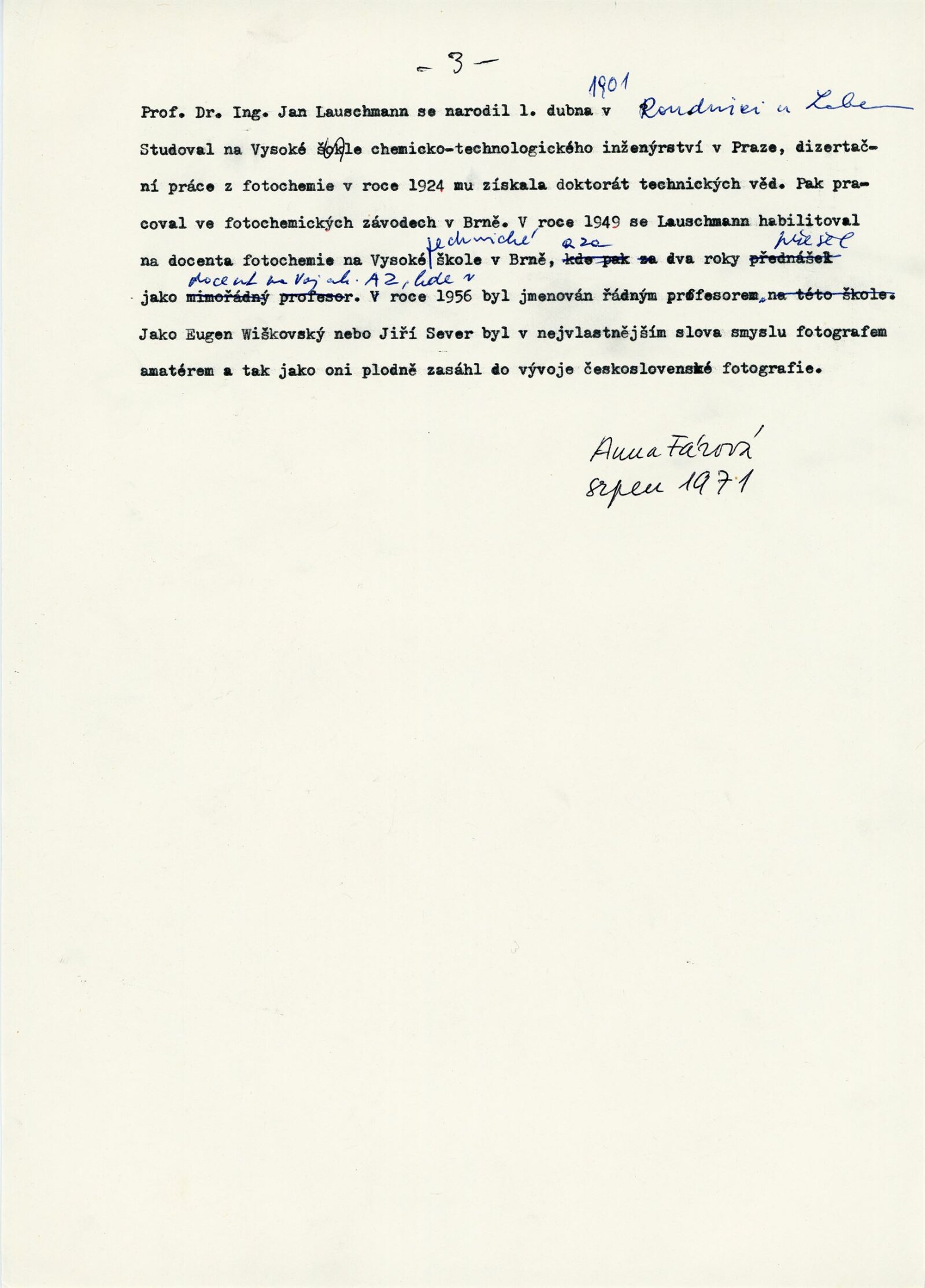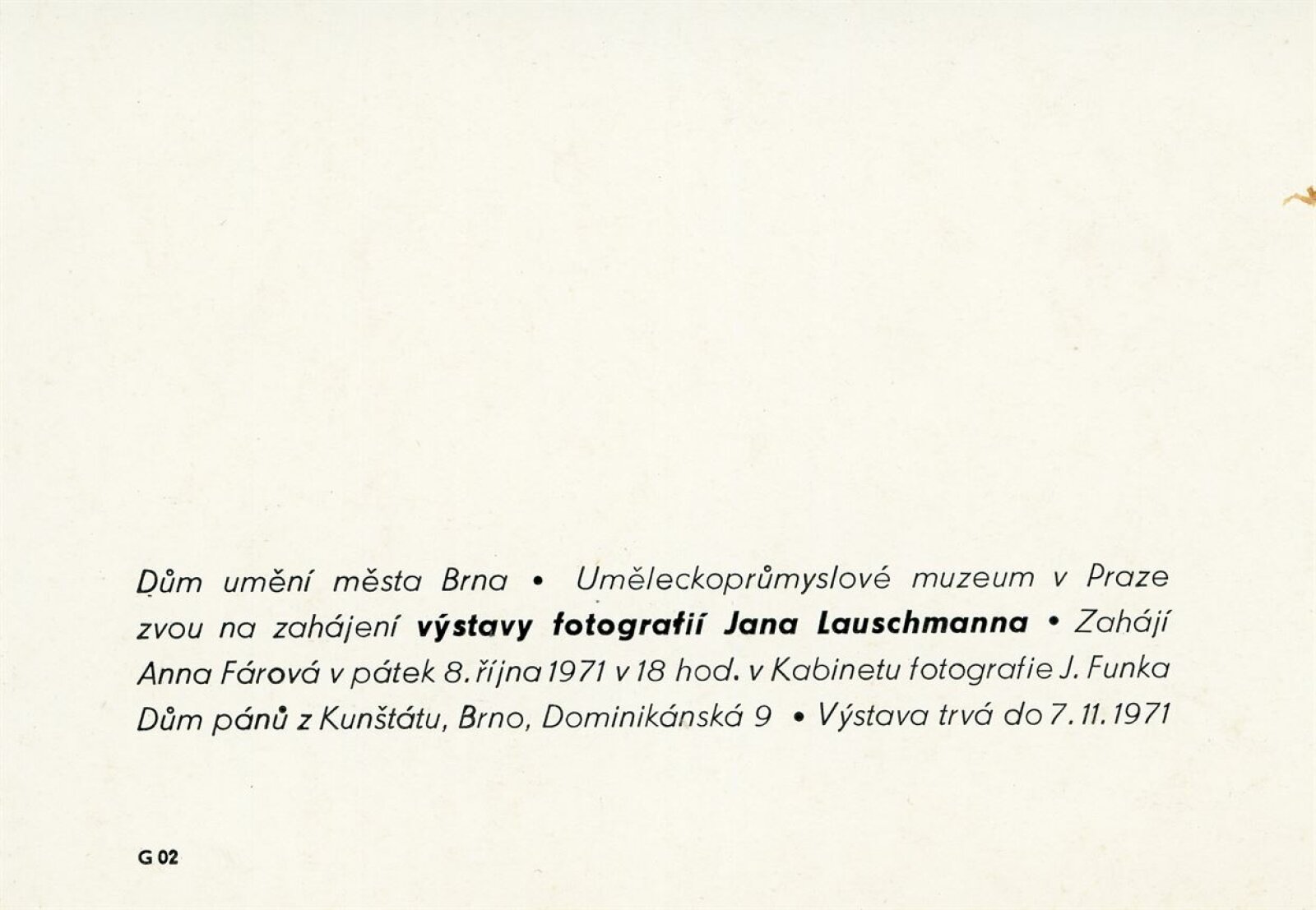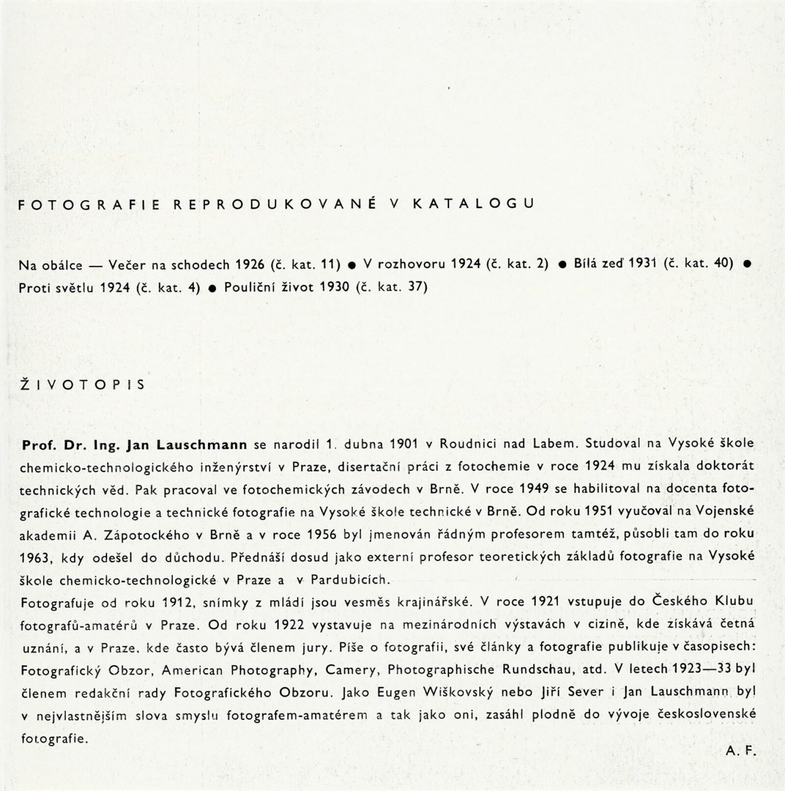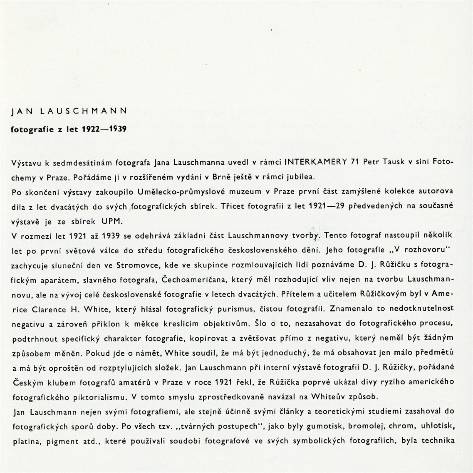 Jan Lauschmann. Fotografie z let 1922–1939: Dům umění města Brna / Dům pánů z Kunštátu, Kabinet fotografie Jaromíra Funka, 8. 10. – 7. 11. 1971 / Text: Anna Fárová. – Brno: DUmB, 1971. – 12 s., obr., životopis, DPK 482. – MZK; MMB