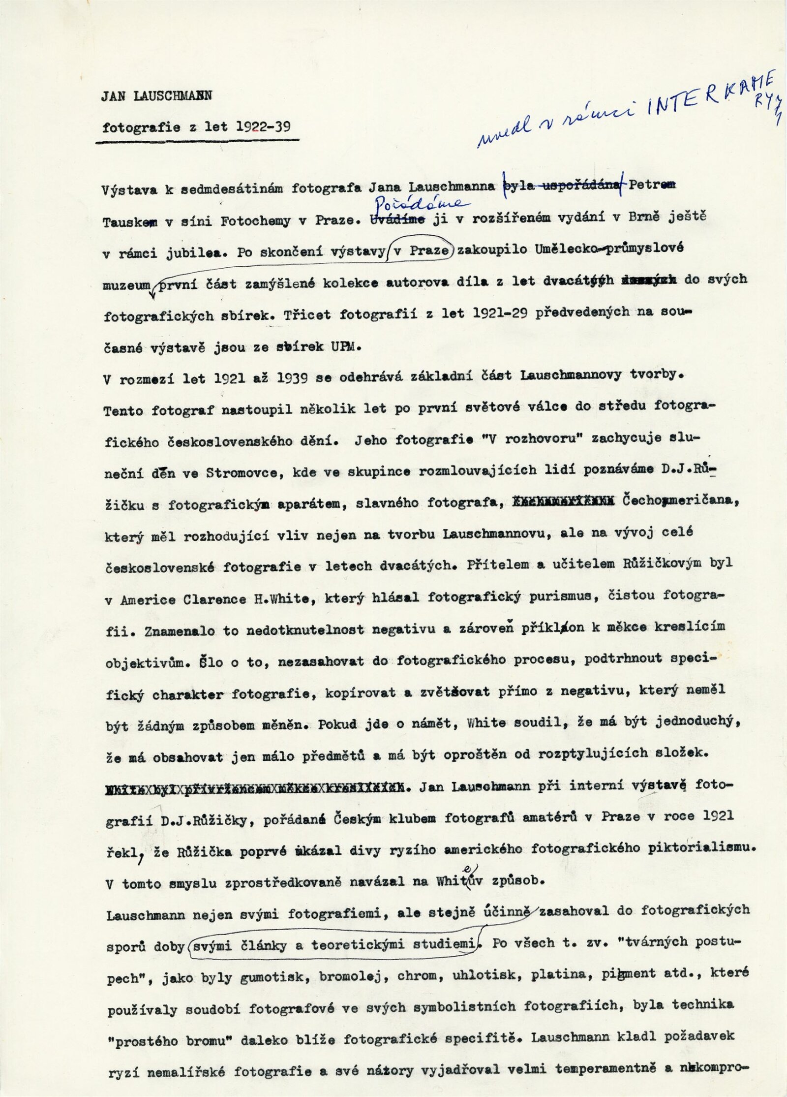 pozvánky, katalog, seznam vystavených děl, text o díle Jana Lauschmanna (Petr Tausk), strojopis textu k výstavě (Anna Fárová), seznam fotografií Jana Lauschmanna ze sbírek UPM a archivu autora, adresy pro speciální pozvánky, korespondence, dopis Jana Lauschmanna, dopisy Anny Fárové, provozní korespondence, žádost o povolení výstavy, recenze v tisku