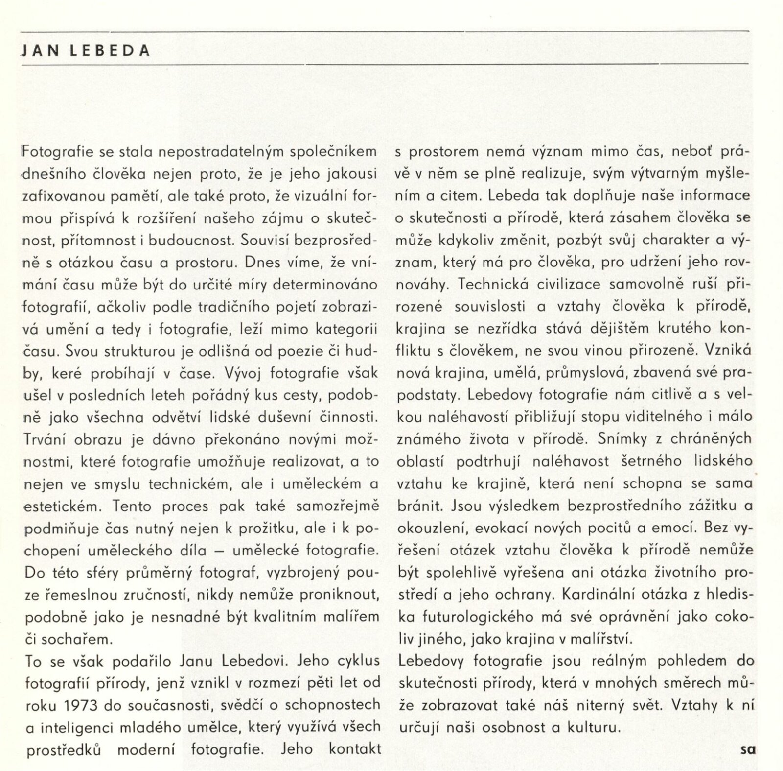 Jan Lebeda. Fotografie: Kabinet fotografie J. Funka, 169. výstava, Dům pánů z Kunštátu 2. 3. – 1. 4. 1979 / Text Josef Sůva. - Brno: DUmB, - 13 s., obr. Životní data, výstavy DPK 697; MZK; MG