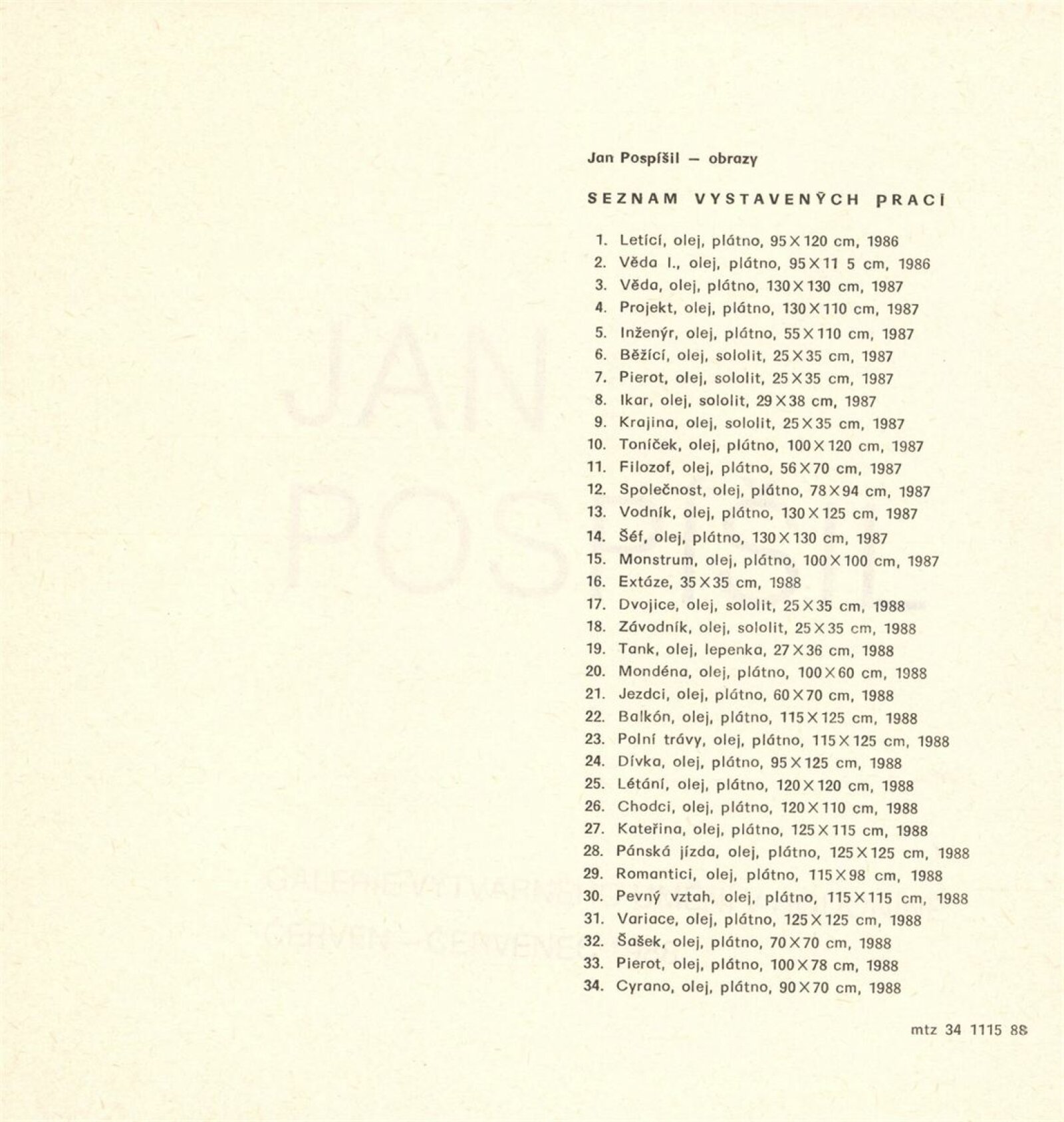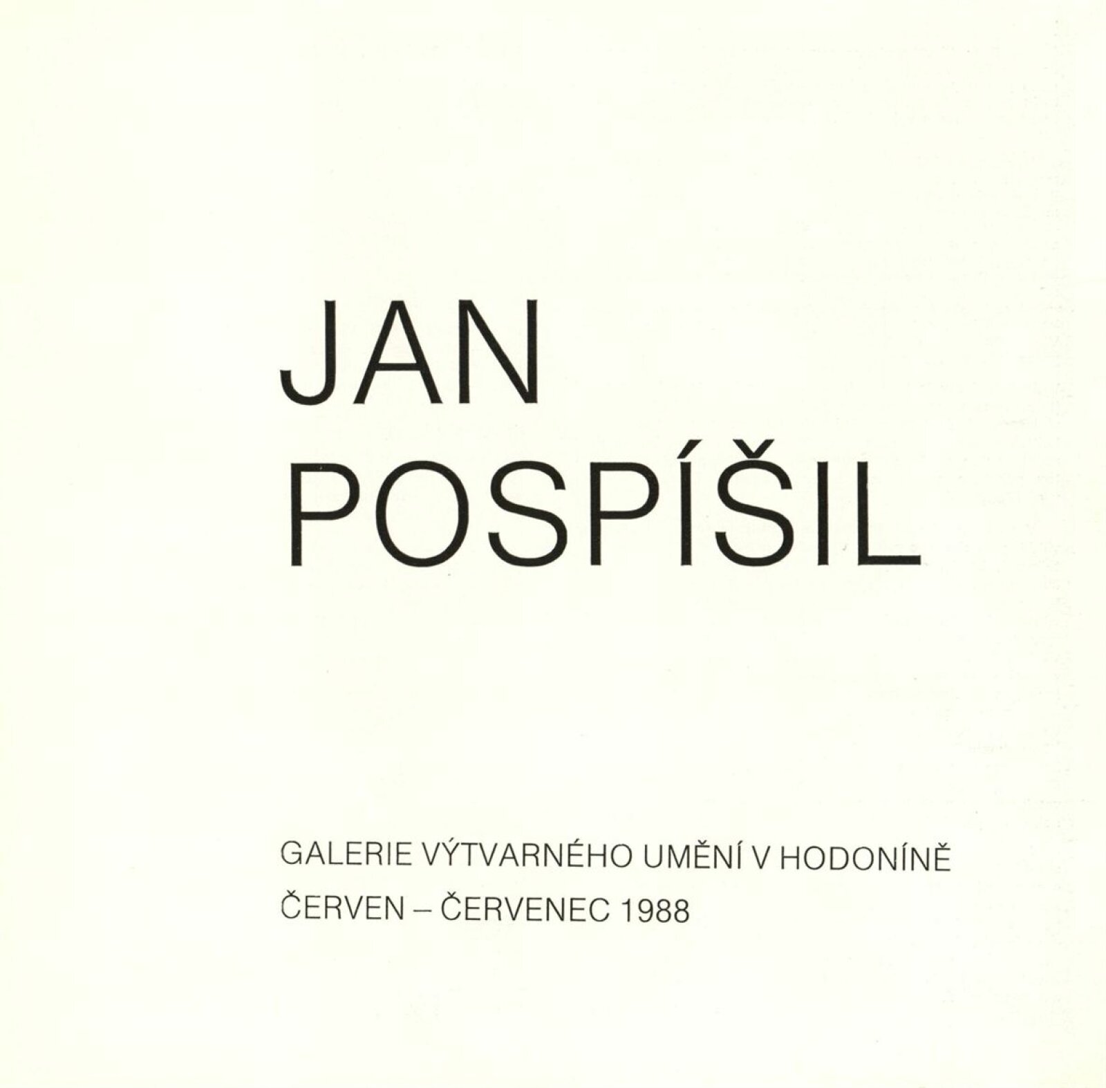 Jan Pospíšil. Obrazy: Dům umění, Galerie Jaroslava Krále 13. 10. – 13. 11. 1988 / Převzatý katalog. Jan Pospíšil. Malba: Galerie výtvarného umění v Hodoníně, červen–červenec 1988 / Text Josef Fantura. – Hodonín: Galerie výtvarného umění, 1988. – [10] s., obr., seznam vystavených prací [1] s., DU 85. – MZK; MG