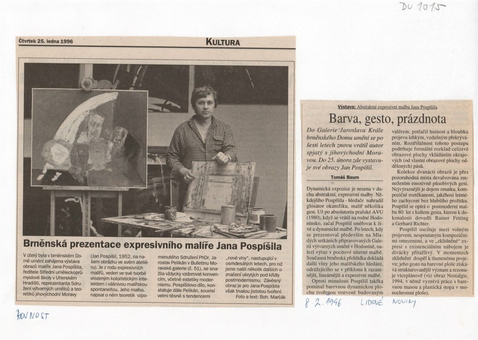 Jan Pospíšil: Galerie Jaroslava Krále, 198. výstava 23. 1. – 18. 2. 1996 ... . - Brno: UVU ČR, - [4] s., obr. Životní data, výstavy DU 1015; MZK; MG