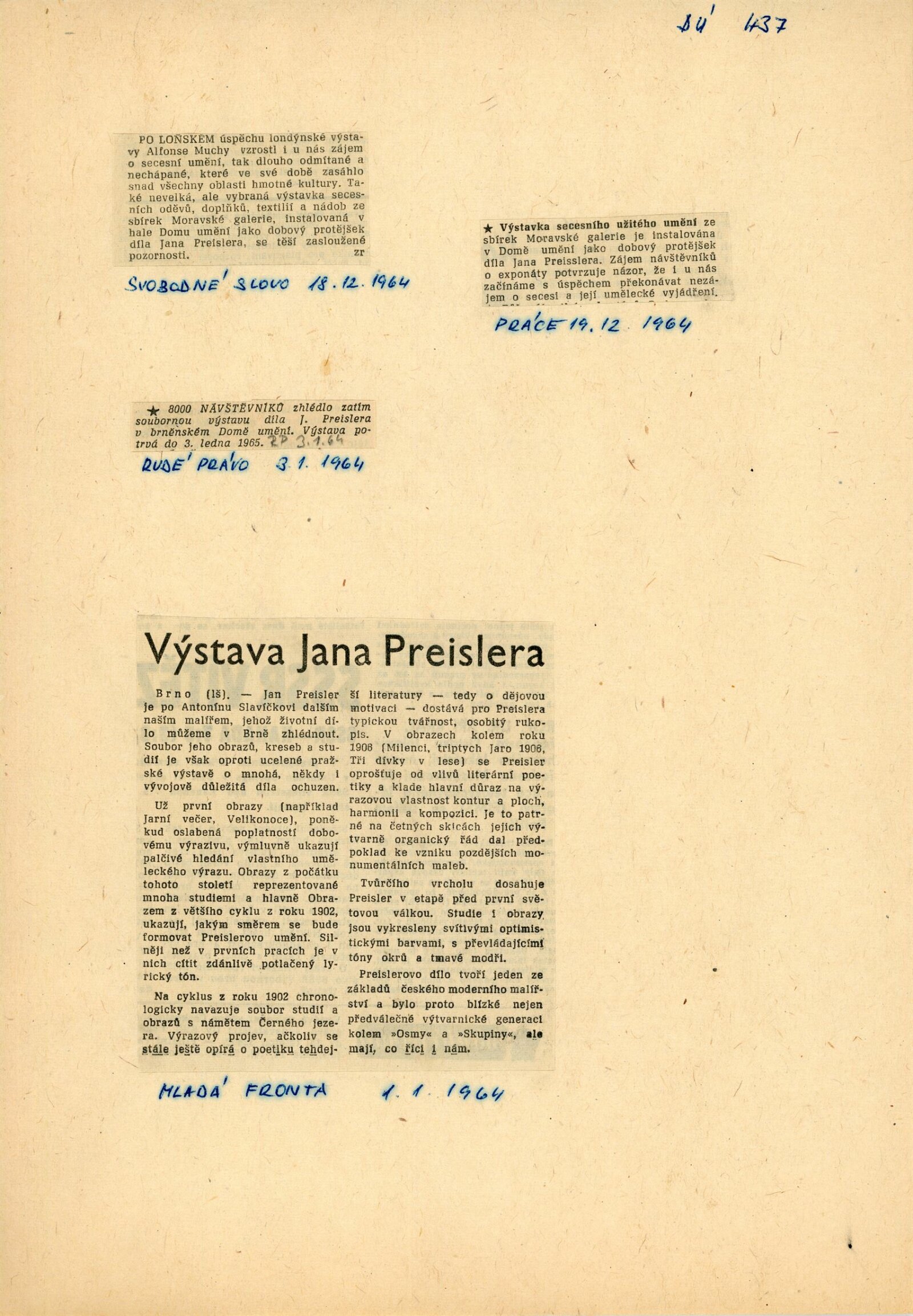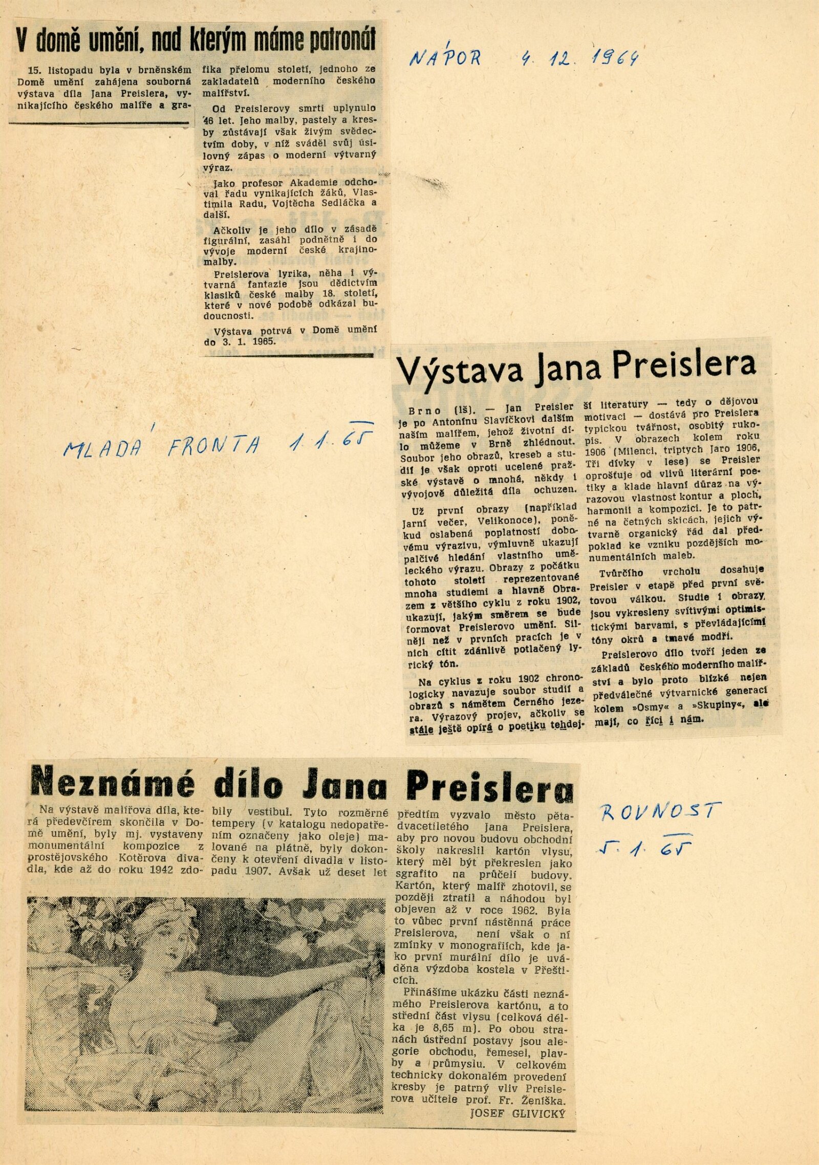 Jan Preisler: Dům umění města Brna, 15. 11. 1964 – 3. 1. 1965 / Převzatý katalog. Jan Preisler 1872–1918: Jízdárna Pražského hradu, Praha, 1964 / Text: Jiří Kotalík. – Praha: Národní galerie, 1964. – 93 s., obr., životní data, výstavy, bibliografie, DU 437. – MZK; MG
