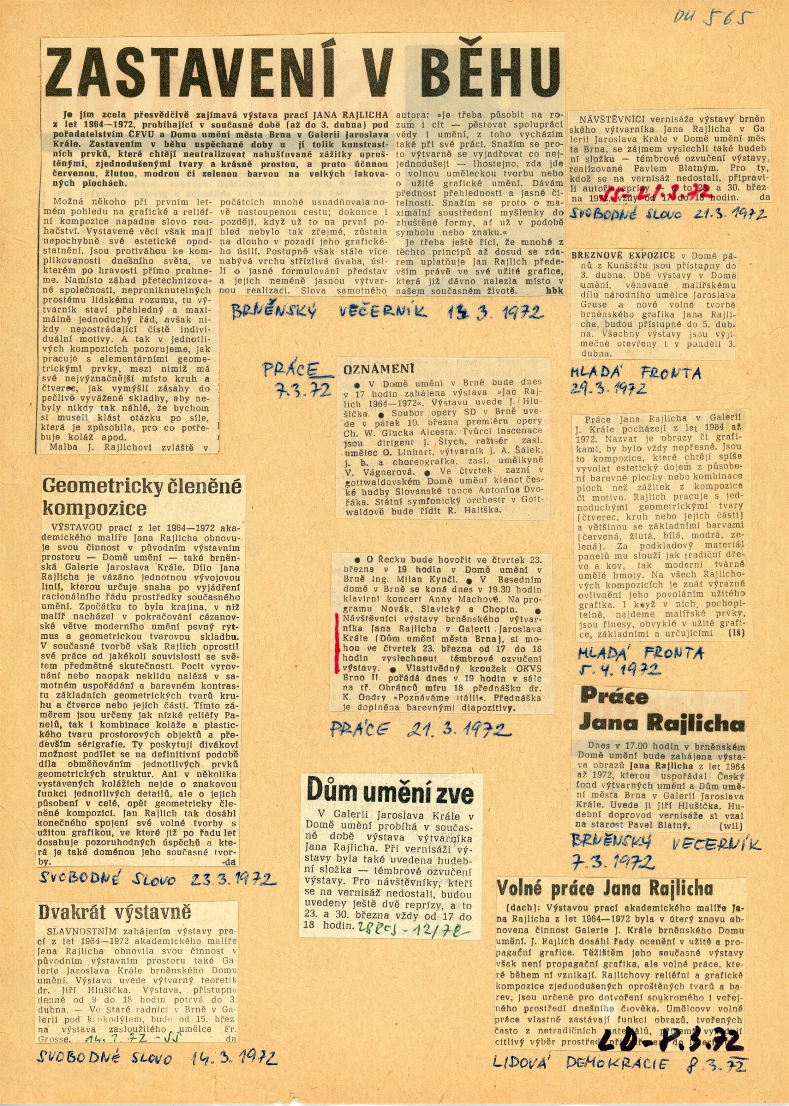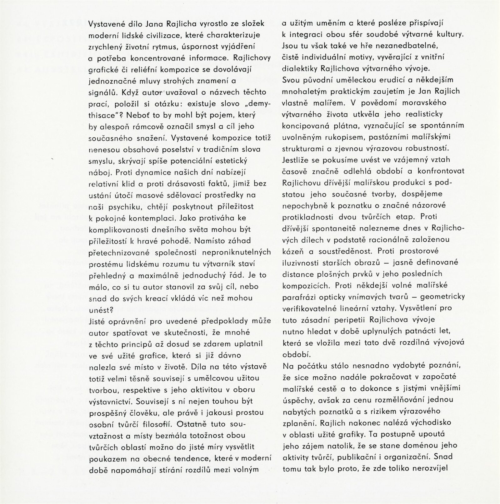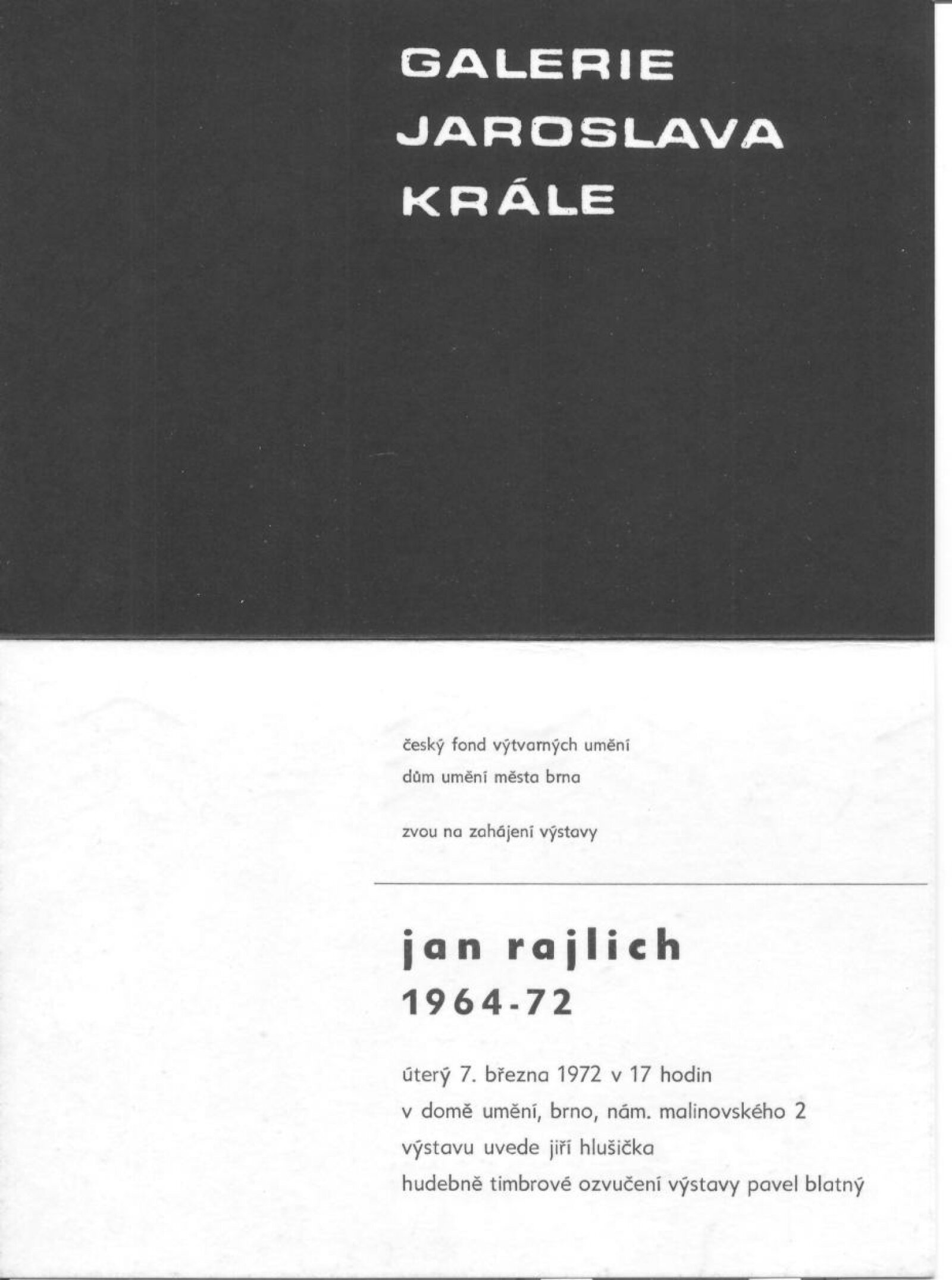 Jan Rajlich. 1964–1972: Dům umění, 44. výstava Galerie Jaroslava Krále, 7. 3. – 3. 4.1972 / Text: Jiří Hlušička. – Brno: ČFVU, 1972. – 12 s., obr., portrét, životní data, výstavy, ceny, práce pro architekturu, DU 565. – MZK; MG
