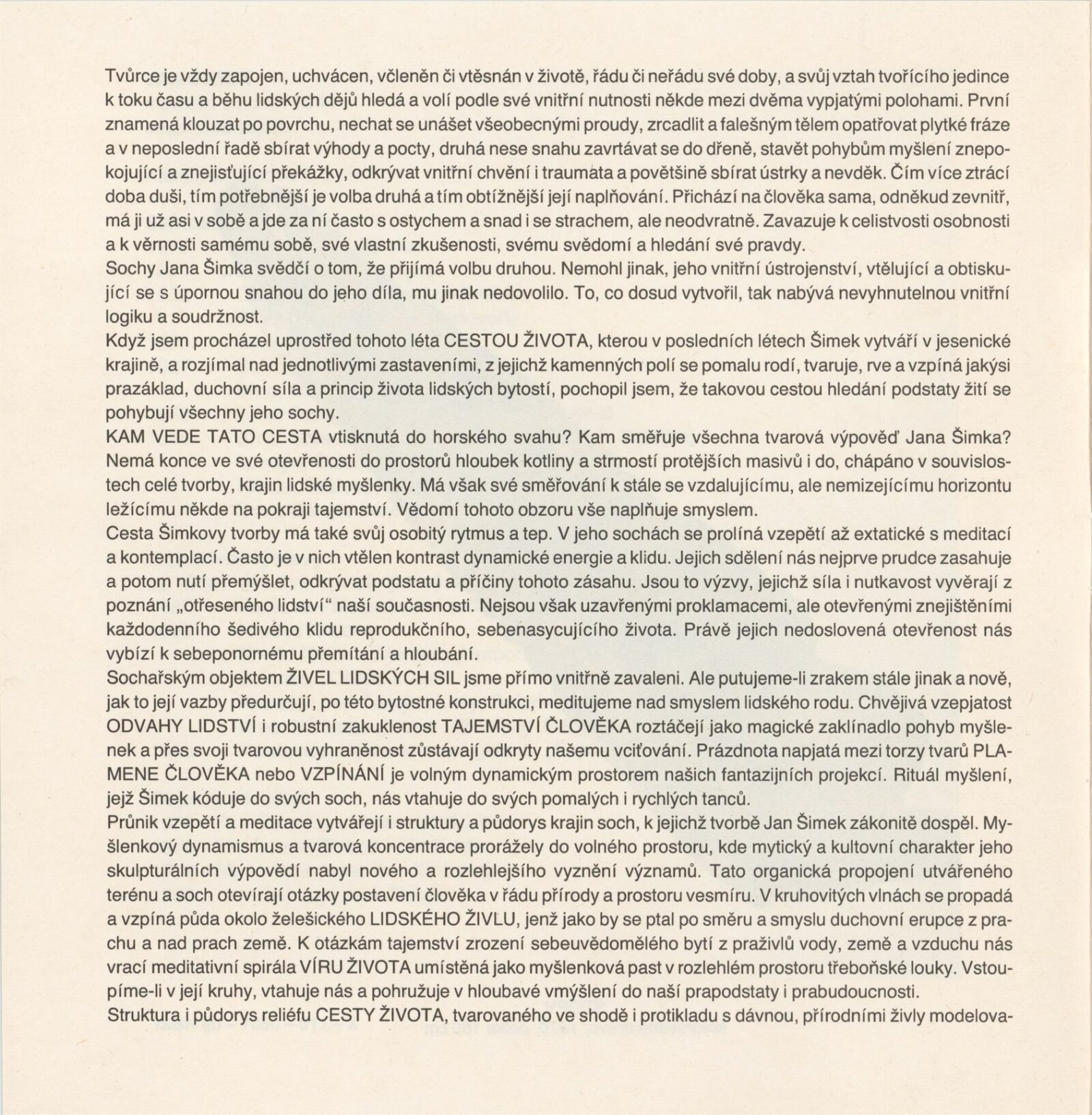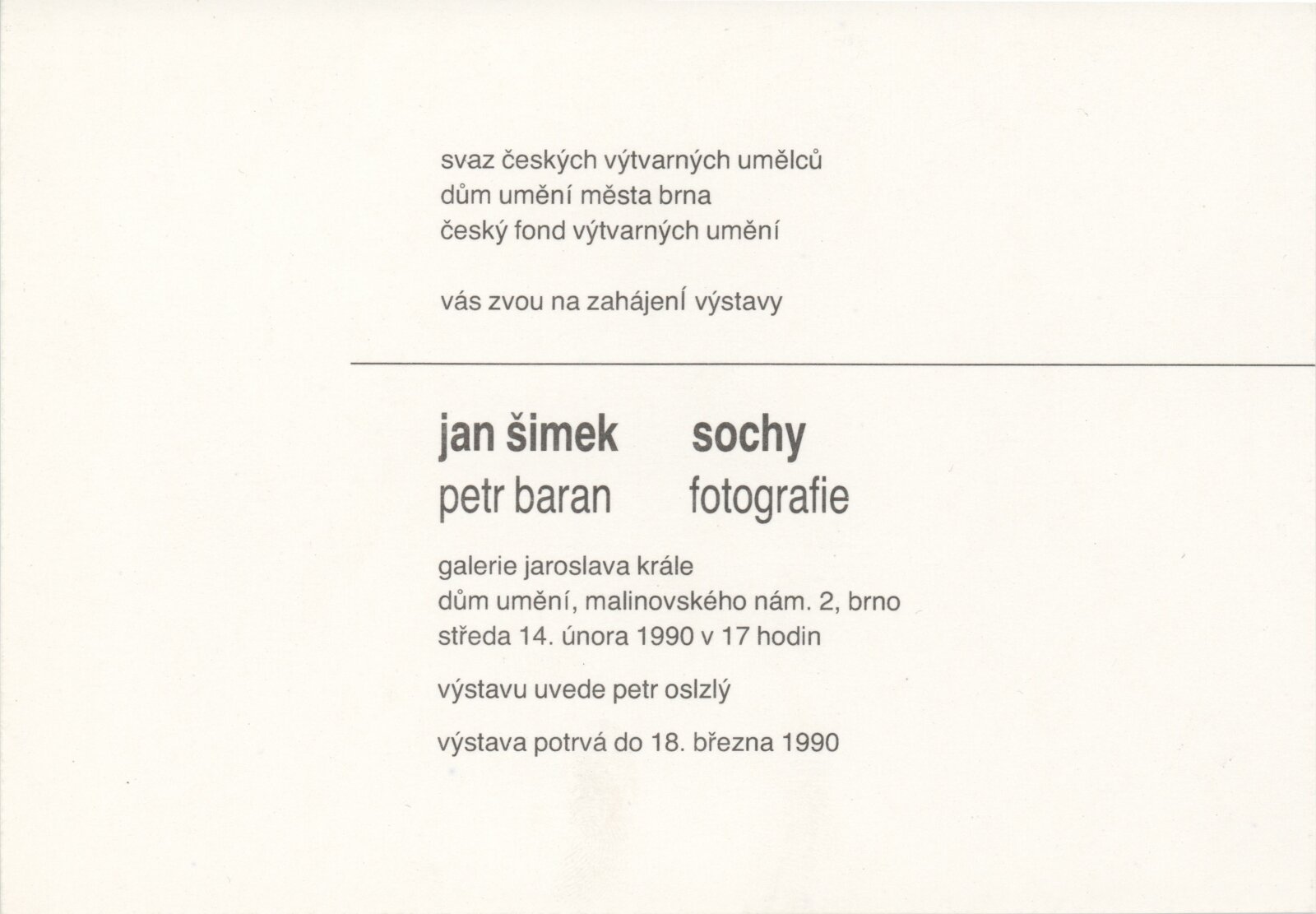 pozvánka, katalog + strojopis, korespondence (1990), katalogy Jana Šimka a Petra Barana (Lidský živel, Lázně Jeseník, Jižní svah…), digitalizovaný videozáznam z výstavy (VHS)