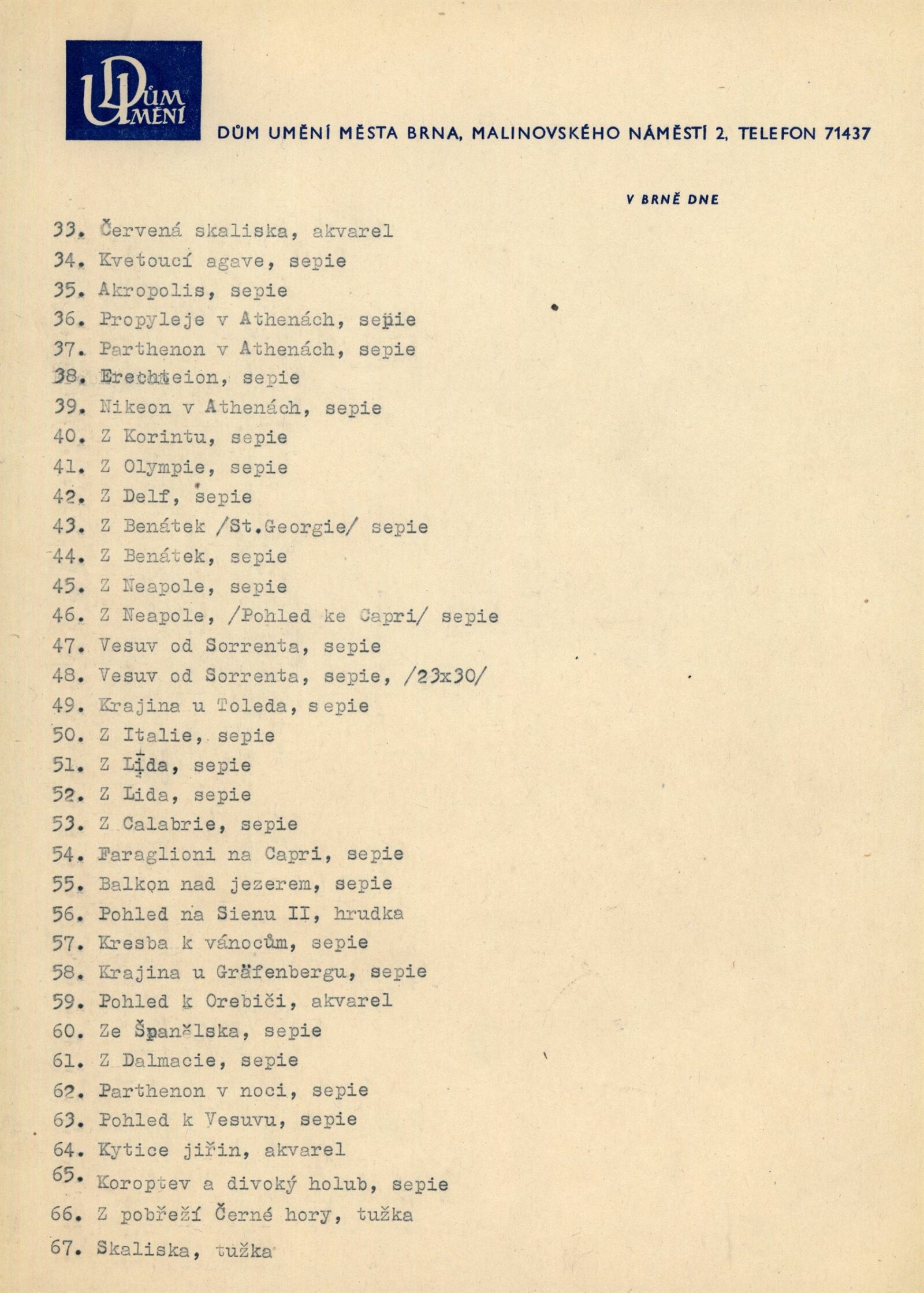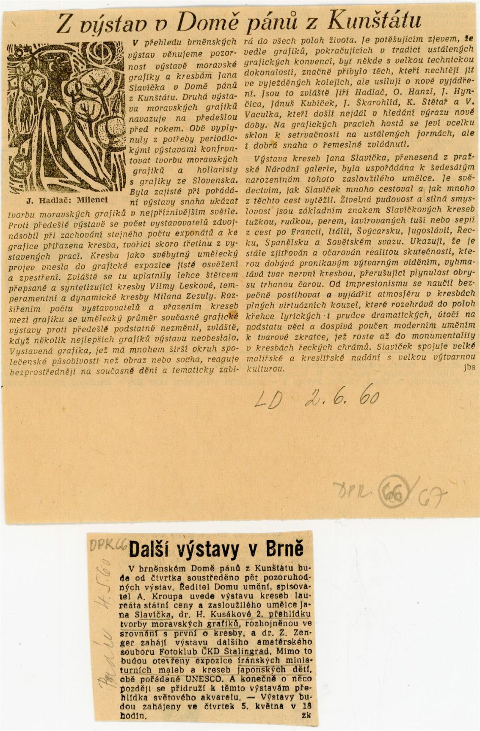 Zasloužilý umělec a laureát státní ceny Jan Slavíček. Kresby z cest: Dům umění města Brna / Dům pánů z Kunštátu, 2. 5. – 5. 6. 1960 / Převzatý katalog. Jan Slavíček. Kresby z cest: Národní galerie v Praze, leden–únor 1960 / Text: Rudolf Rouček. – Praha: Národní galerie, 1960. – skládačka, 6 s., DPK 66. – MG