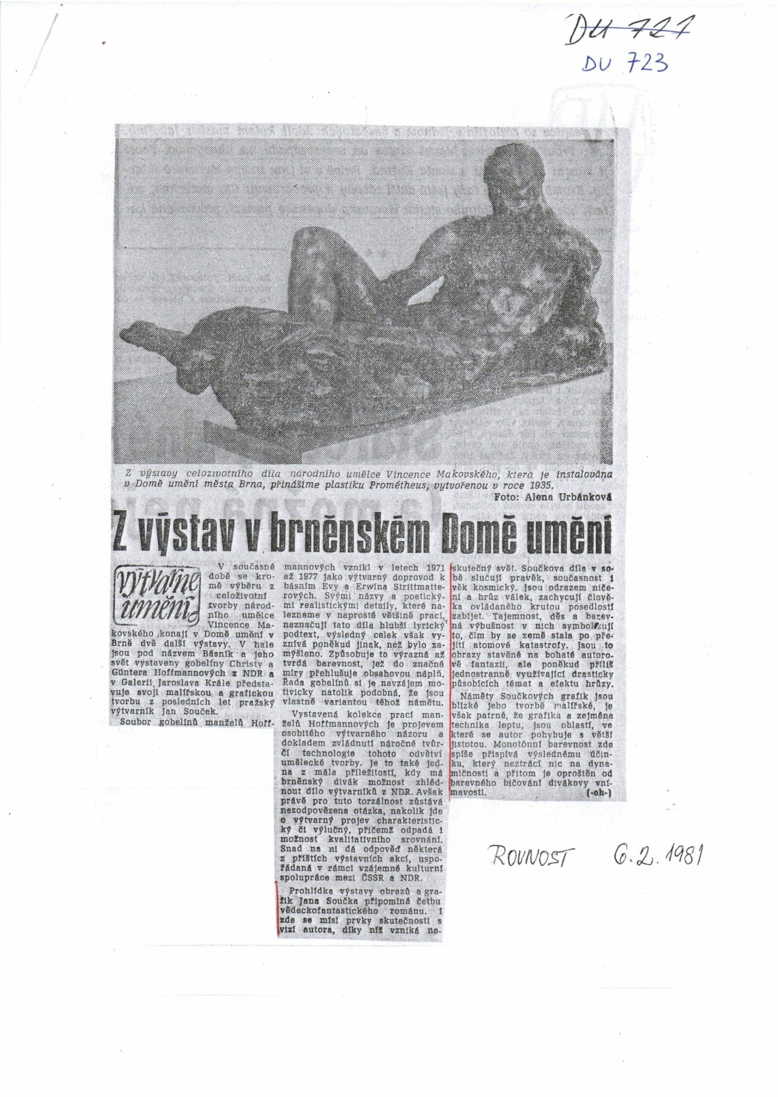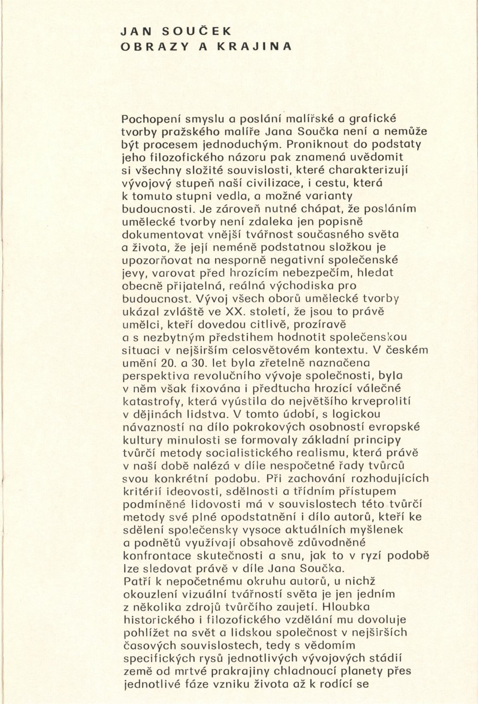 Jan Souček. Obrazy a krajina: Dům umění, 102. výstava v Galerii Jaroslava Krále, 13. 1. – 15. 2. 1981 / Text: Zdeněk Čubrda. – Brno: ČFVU, 1981. – 10 s., obr., portrét, životní data, výstavy, DU 723