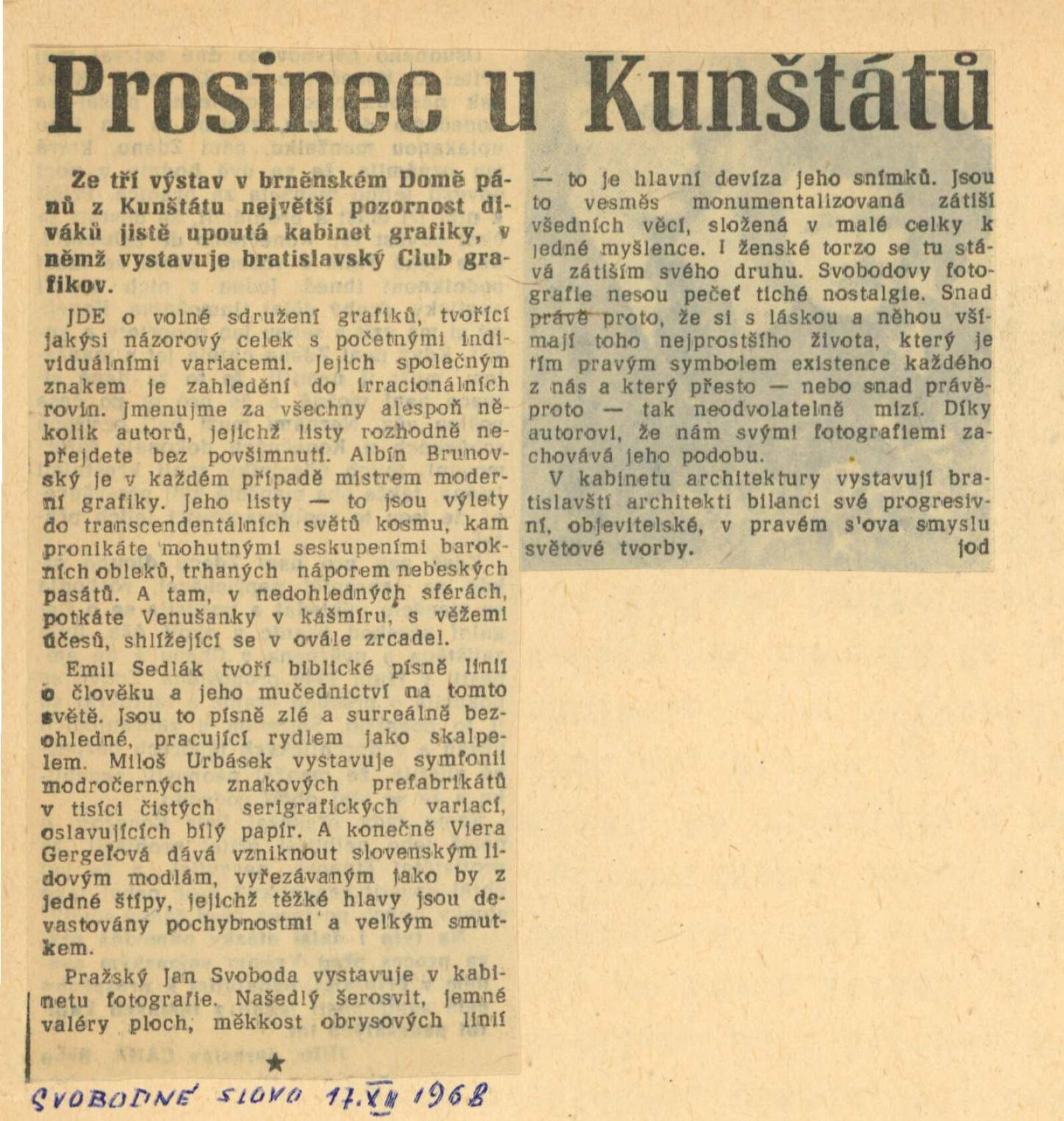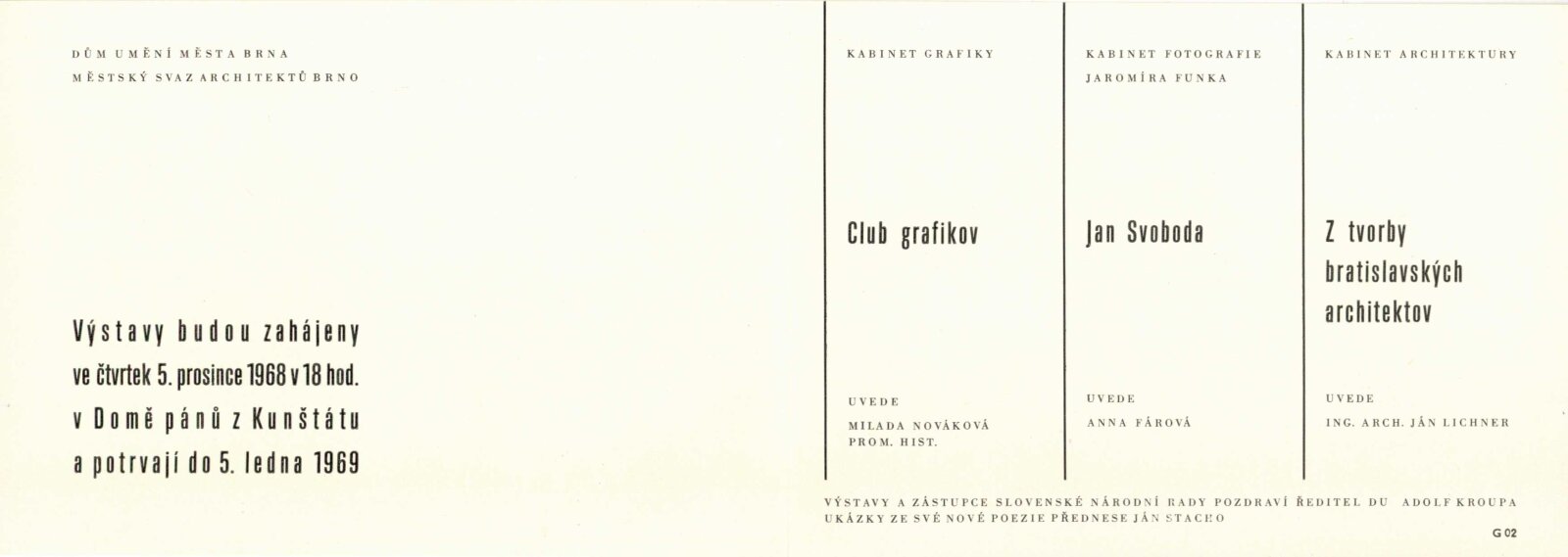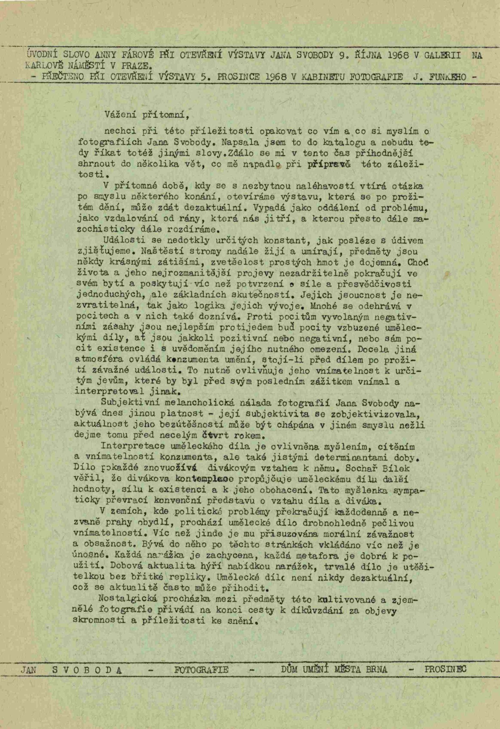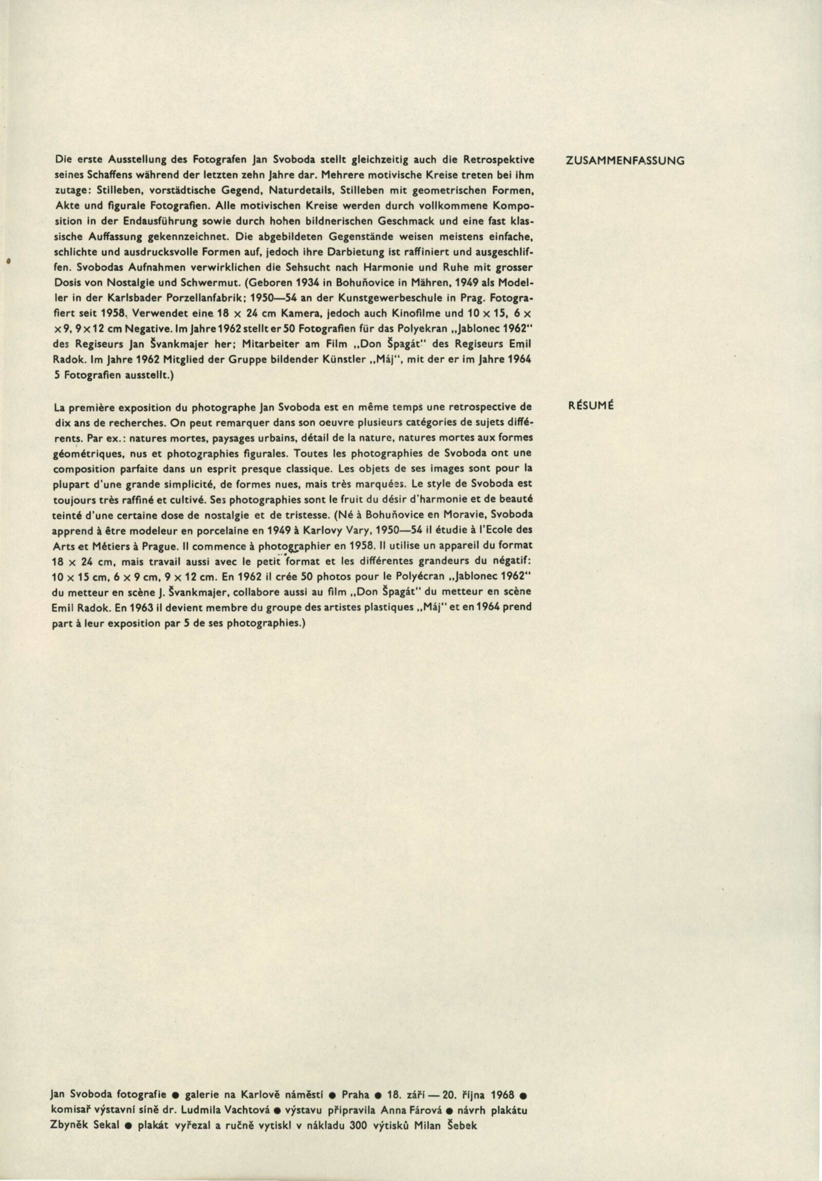 Jan Svoboda. Fotografie: Dům umění města Brna / Dům pánů z Kunštátu, 96. výstava Kabinetu fotografie Jaromíra Funka, 6. 12. 1968 – 5. 1. 1969 / Převzatý katalog. Jan Svoboda. Fotografie: Galerie na Karlově náměstí, Praha, 18. 9. – 20. 10. 1968 / Text: Anna Fárová. – Praha: Galerie na Karlově náměstí, 1968. – 7 s., 8 s. obr. příl., DPK 398. – MG