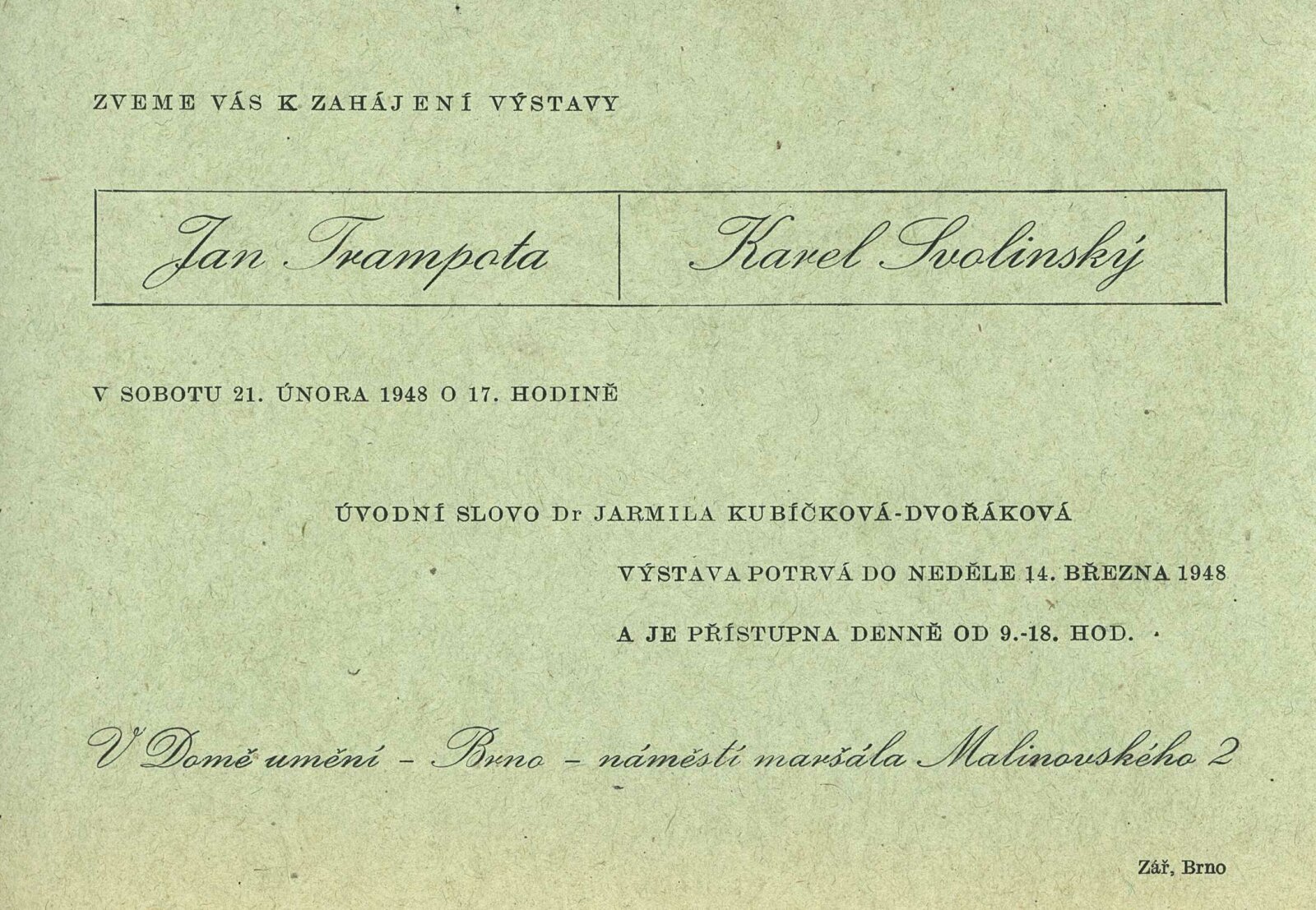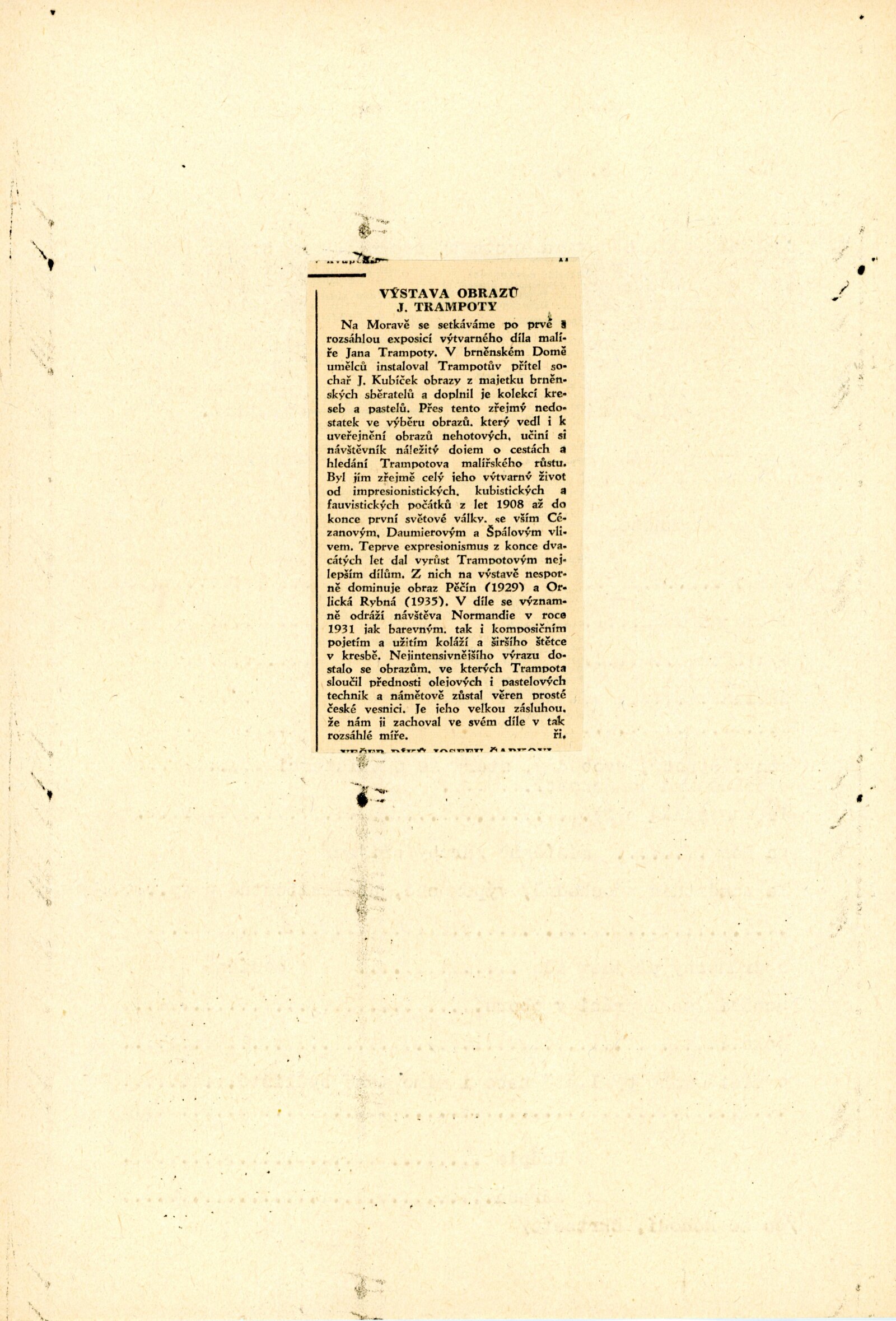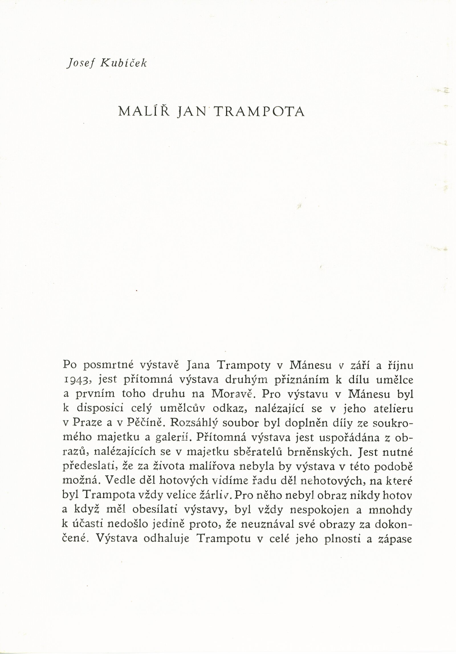 Katalog výstav Domu umění, pořádaných 18. 2. – 7. 3. 1948 / Obsahuje výstavy: Jan Trampota, Karel Svolinský, Ruské lidové tisky z XIX. století, Marc Chagall. – Brno: SVU Aleš, 1948. – 8 s., životopisná data vystavujících, DU 64–67. – AMB Jan Trampota. 1889–1942. 65. výstava: Dům umění, 21. 2. – 14. 3. 1948 / Text: Josef Kubíček. – Brno: SVU Aleš, 1948. – 12 s., DU 66. – Kubíček 7993; MZK; MG; AMB; MMB