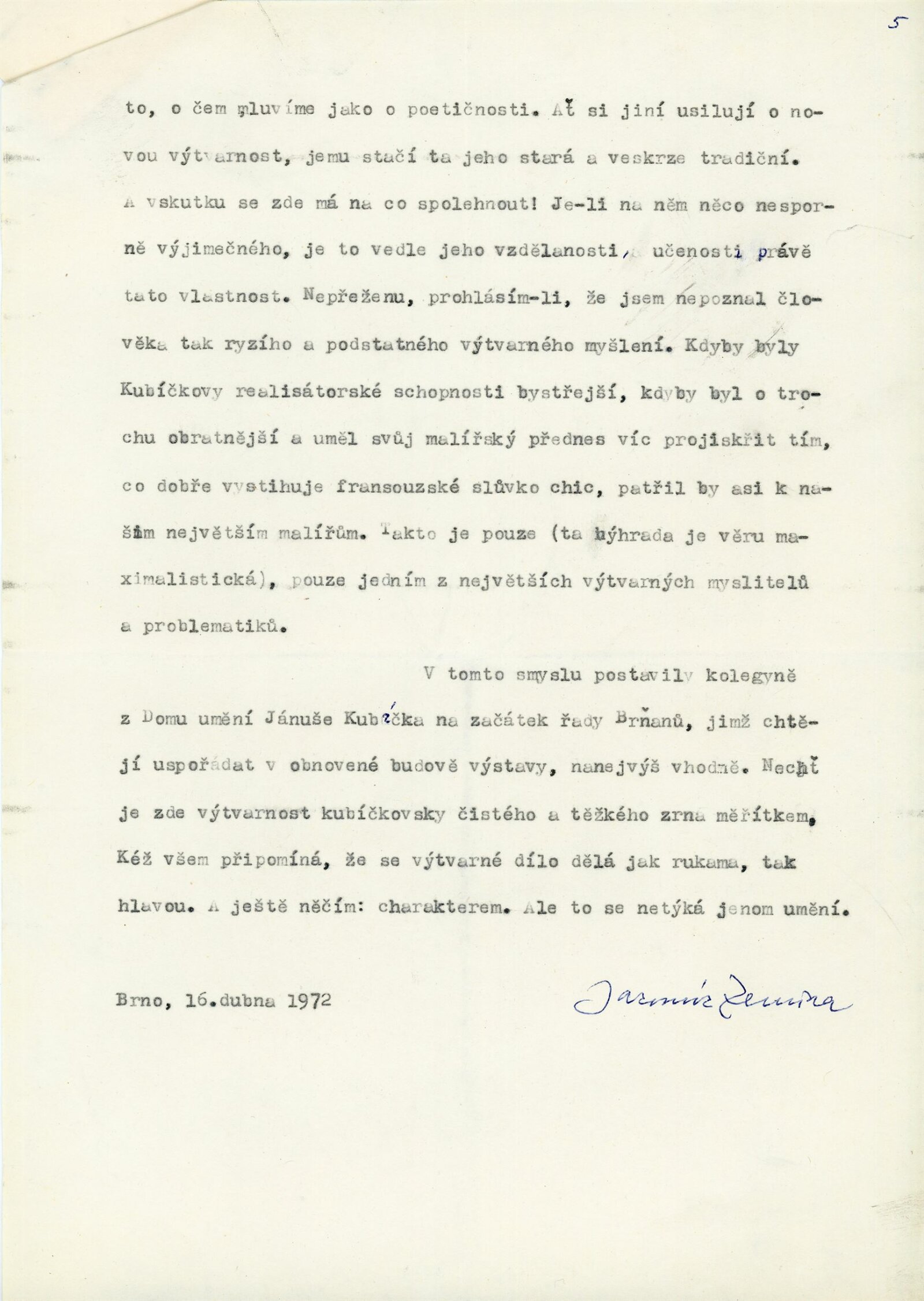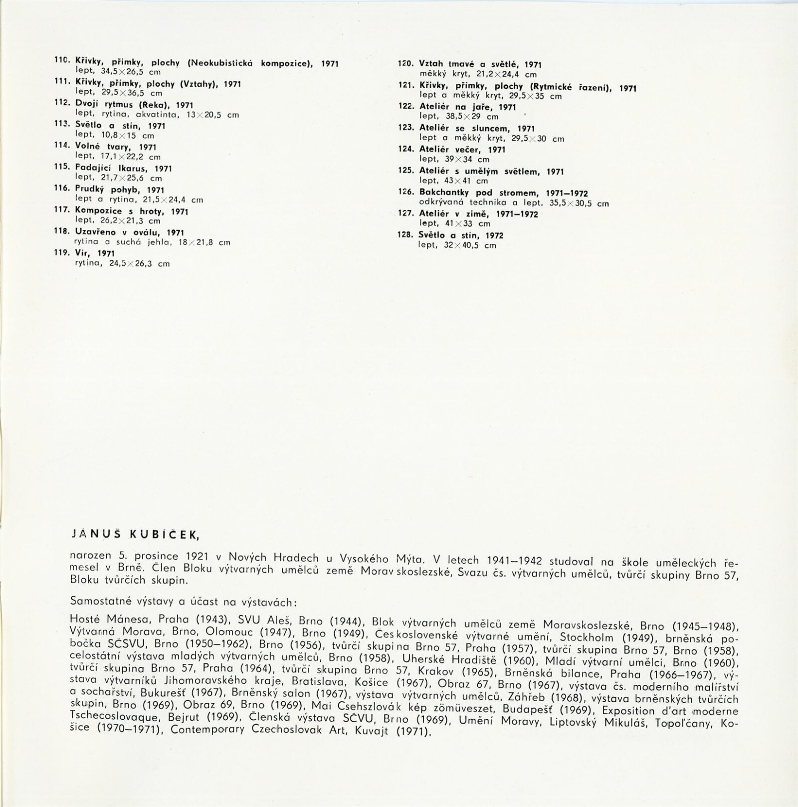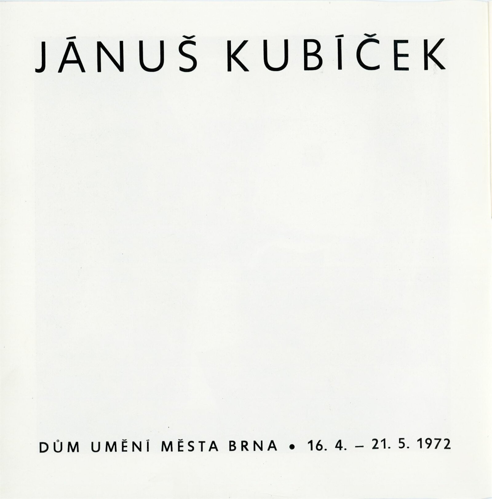 Jánuš Kubíček. Obrazy, kresby, grafika: Dům umění města Brna, 16. 4. – 21. 5. 1972 / Text: Jiří Kratochvíl. – Brno: DUmB, 1972. – 16 s., obr., životní data, výstavy, DU 566. – MZK; MG; MMB