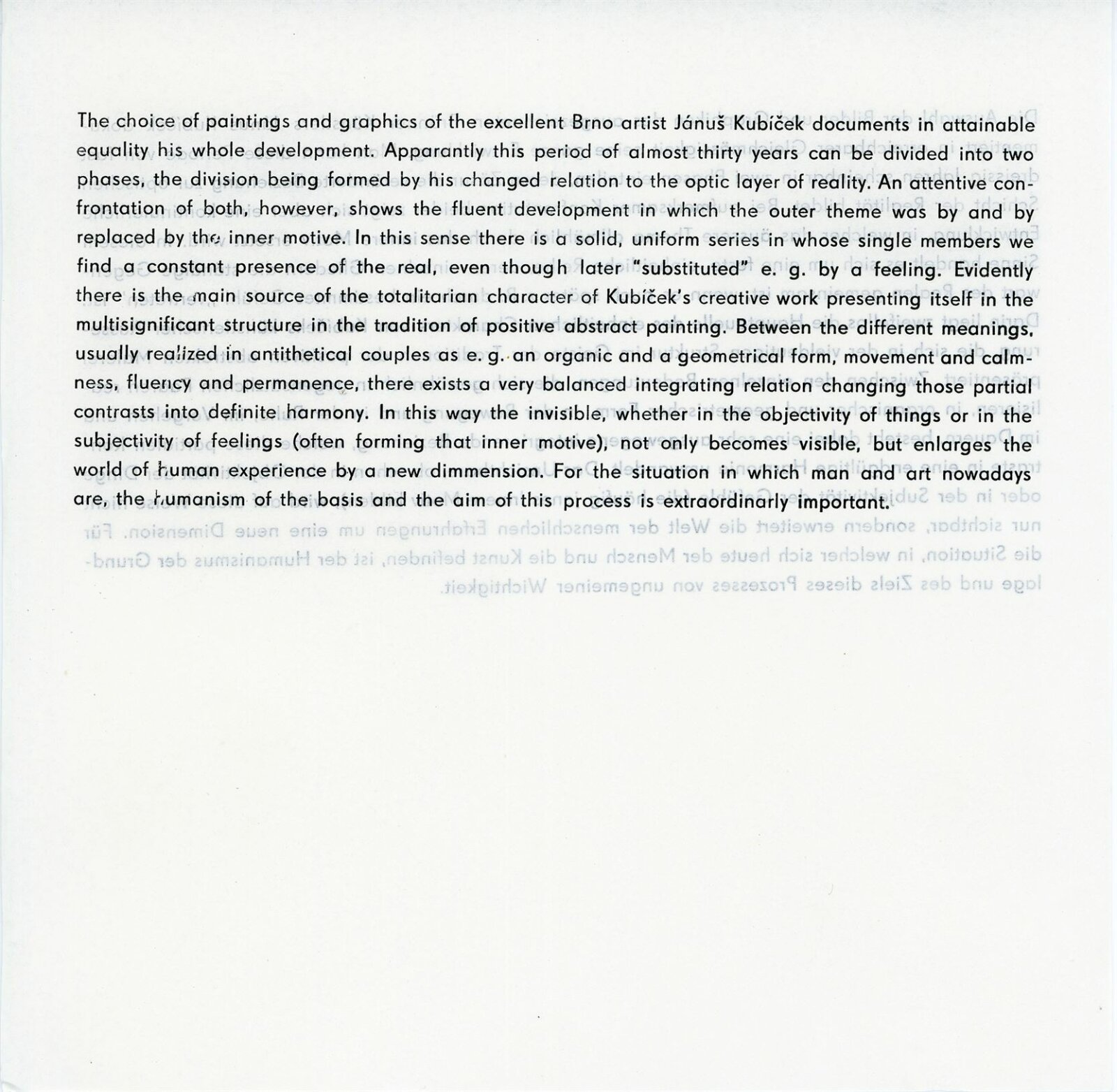 pozvánka, katalog, katalog Kubíčkovy výstavy v GJK (DU 520), katalog výstavy “Contemporary Czechoslovak Art“ (Kuwait 1971), fotografie vernisáže a výstavy, úvodní slovo vernisáže (Jaromír Zemina, Kamil Bochořák), seznam vystavených děl, podklady pro katalog, reversy, žádost o povolení výstavy, provozní korespondence