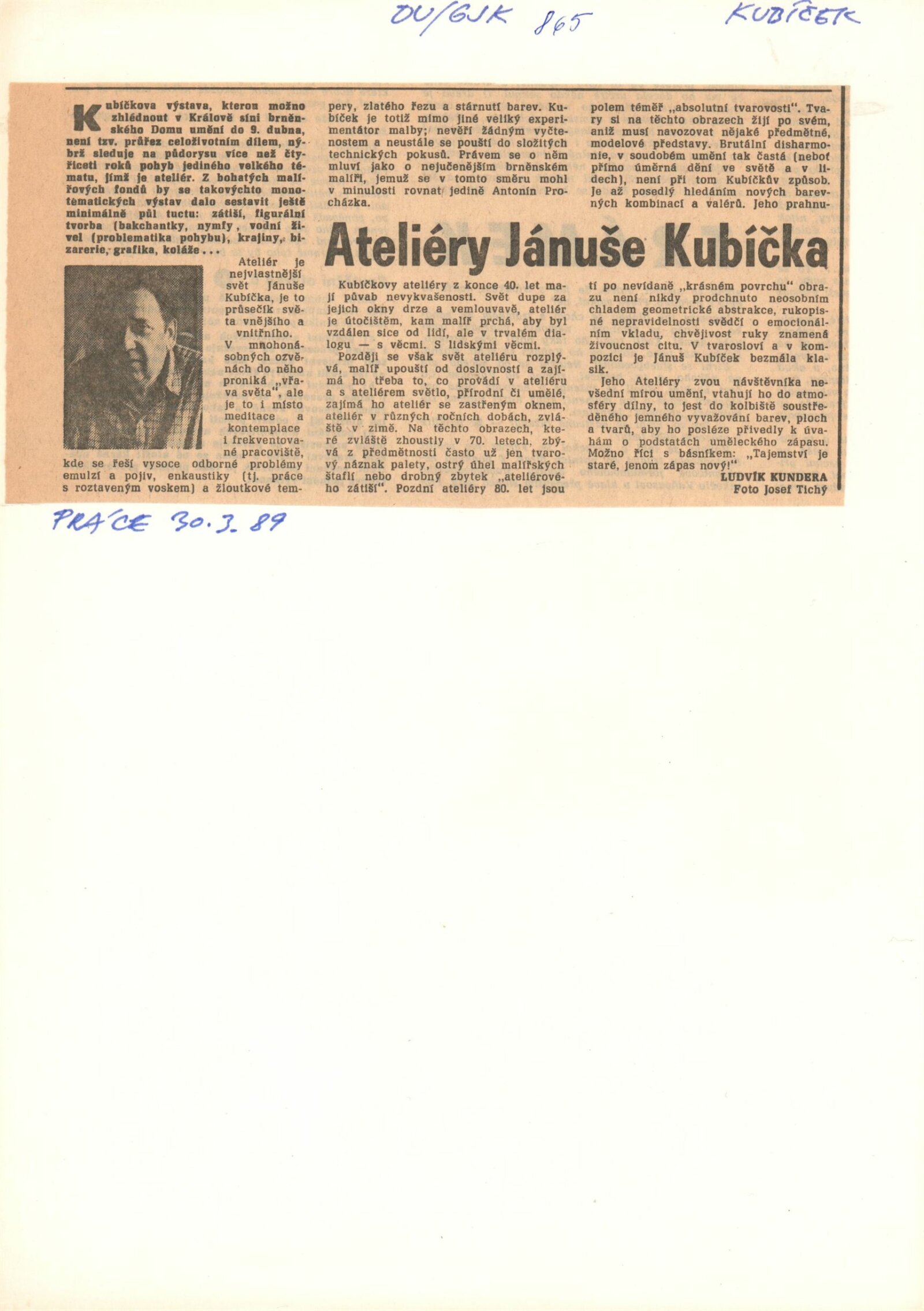 Jánuš Kubíček. Obrazy: Dům umění, 150. výstava v Galerii Jaroslava Krále, 28. 2. – 9. 4. 1989 / Text: Ludvík Kundera. – Brno: ČFVU-Dílo, 1989. – [16] s., obr., životní data, výstavy, realizace, ceny, DU 865. – MZK; MG; MMB