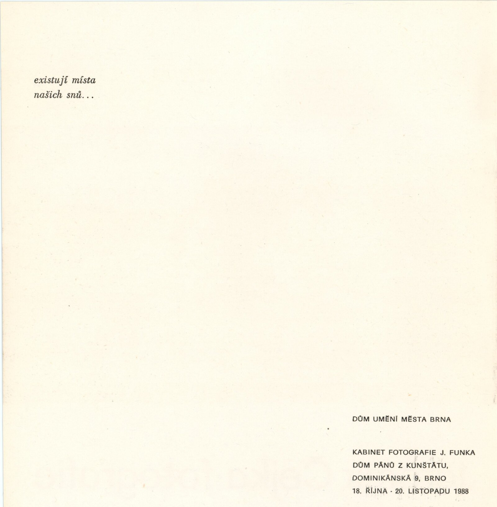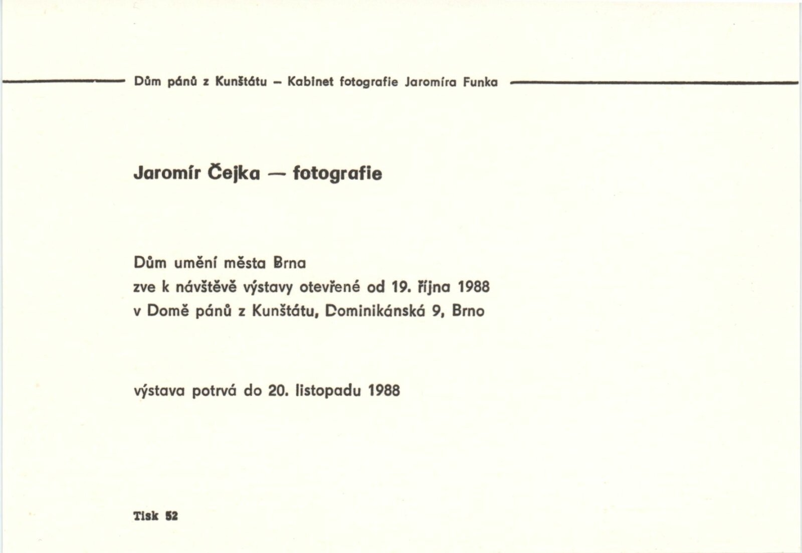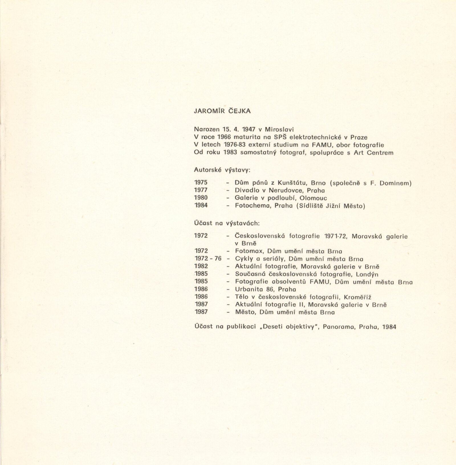 Jaromír Čejka. Fotografie: Dům umění / Dům pánů z Kunštátu, Kabinet fotografie Jaromíra Funka, 18. 10. – 20. 11. 1988 / Text: Bohuslav Blažek. – Brno: DUmB, 1988. – 13 s., obr., životní data, výstavy, DPK 911. – MZK; MG