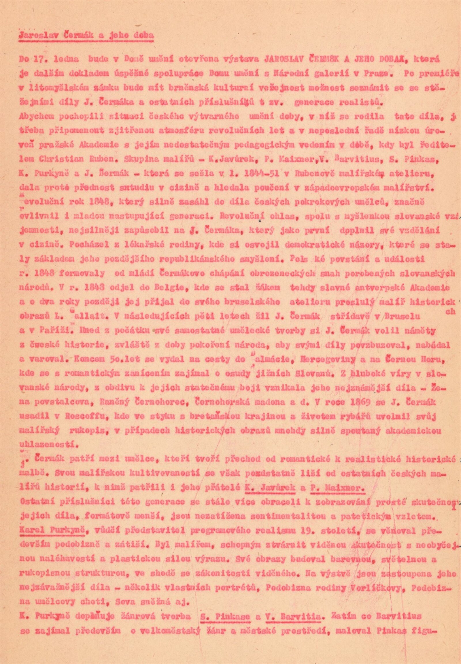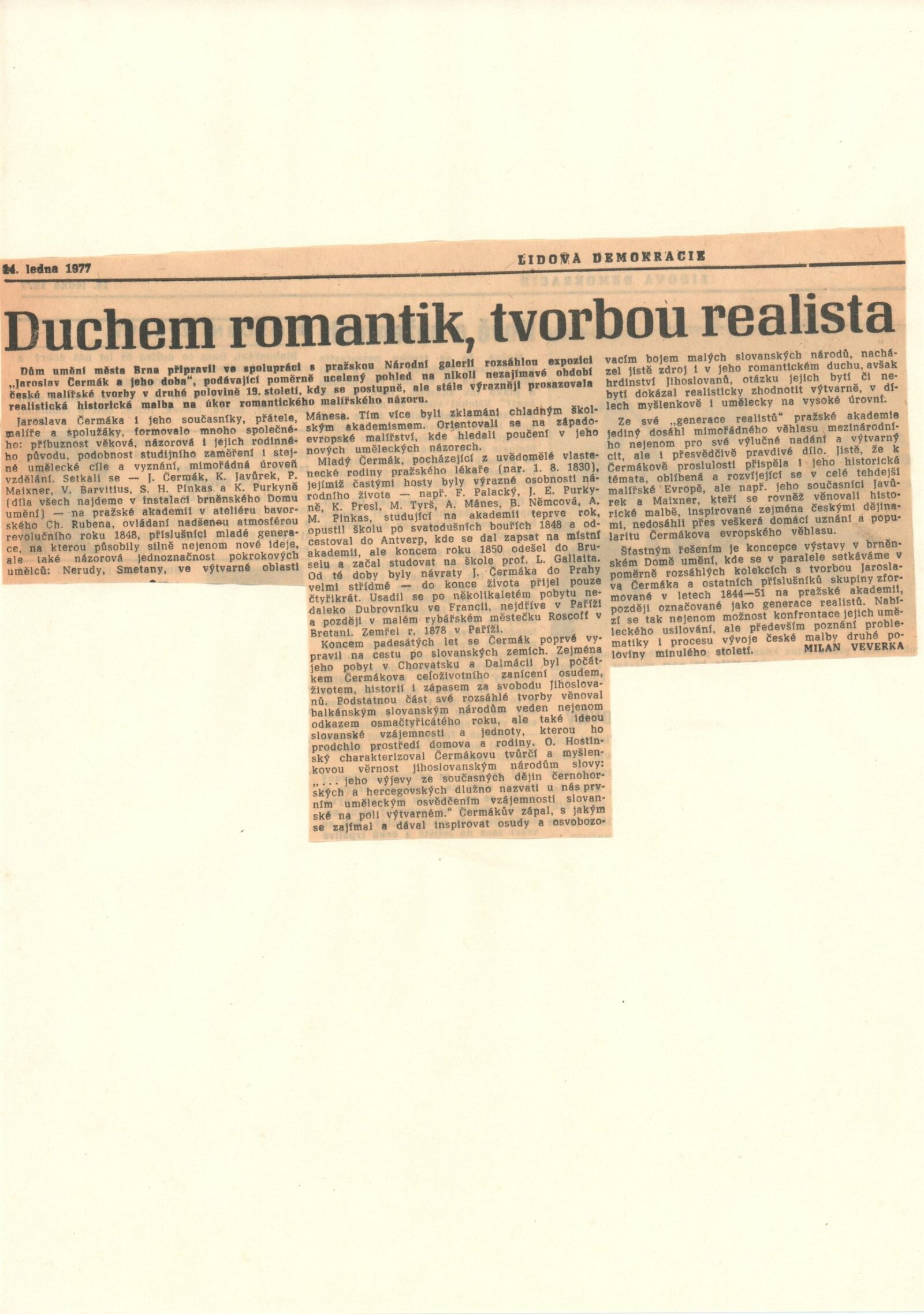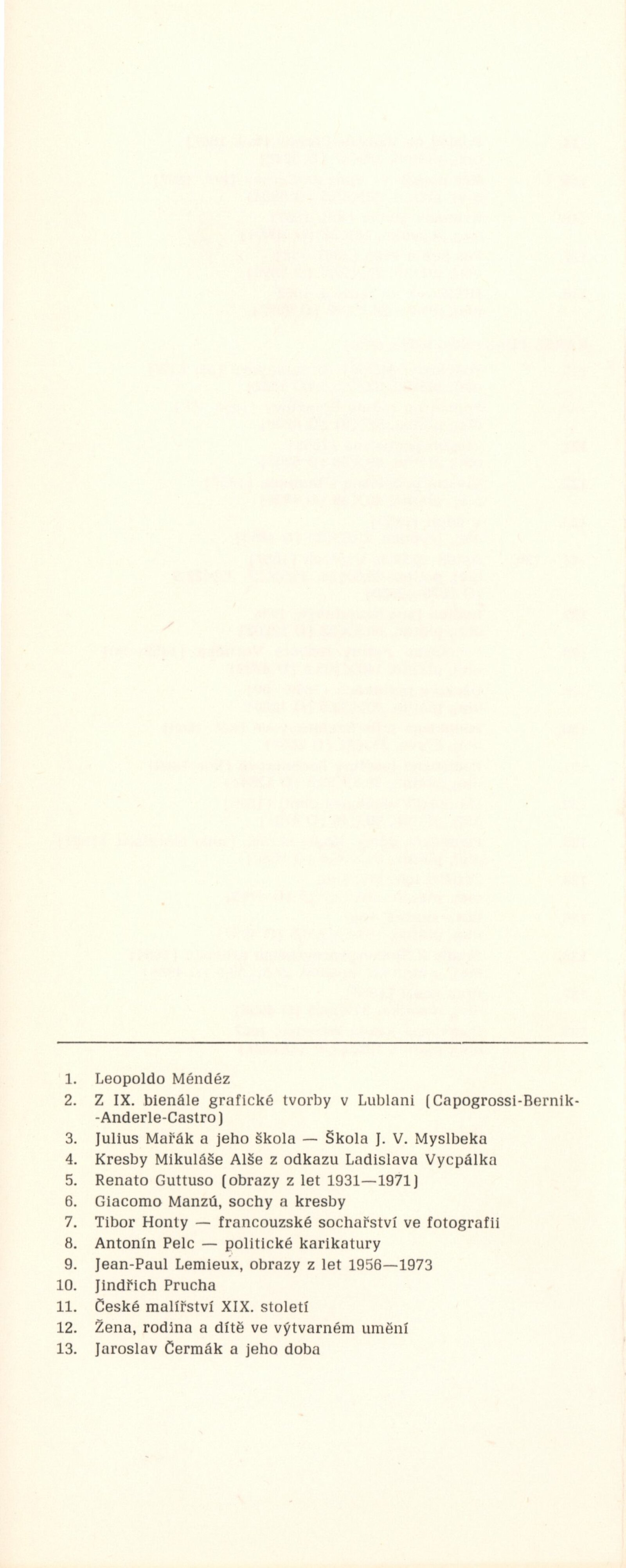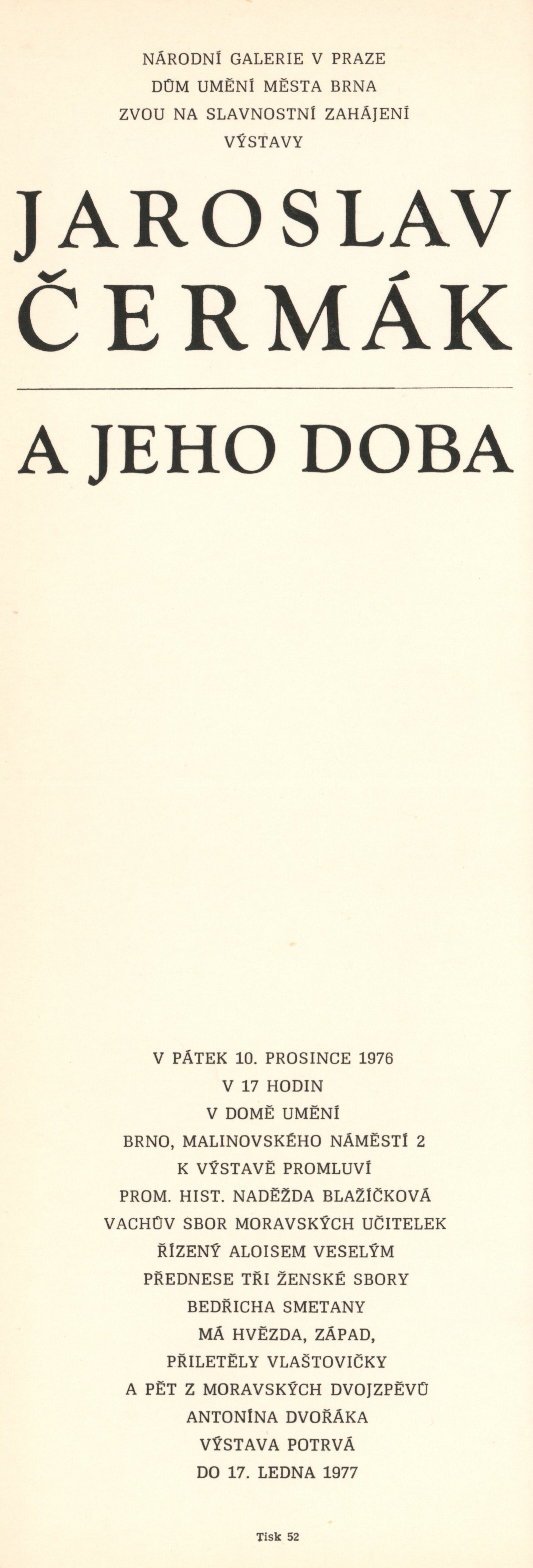 Jaroslav Čermák a jeho doba: Dům umění města Brna, 10. 12. 1976 – 17. 1. 1976 / Text: Naděžda Blažíková. – Brno: DUmB, 1976. – skládačka 10 s., DU 647. – MZK; MMB