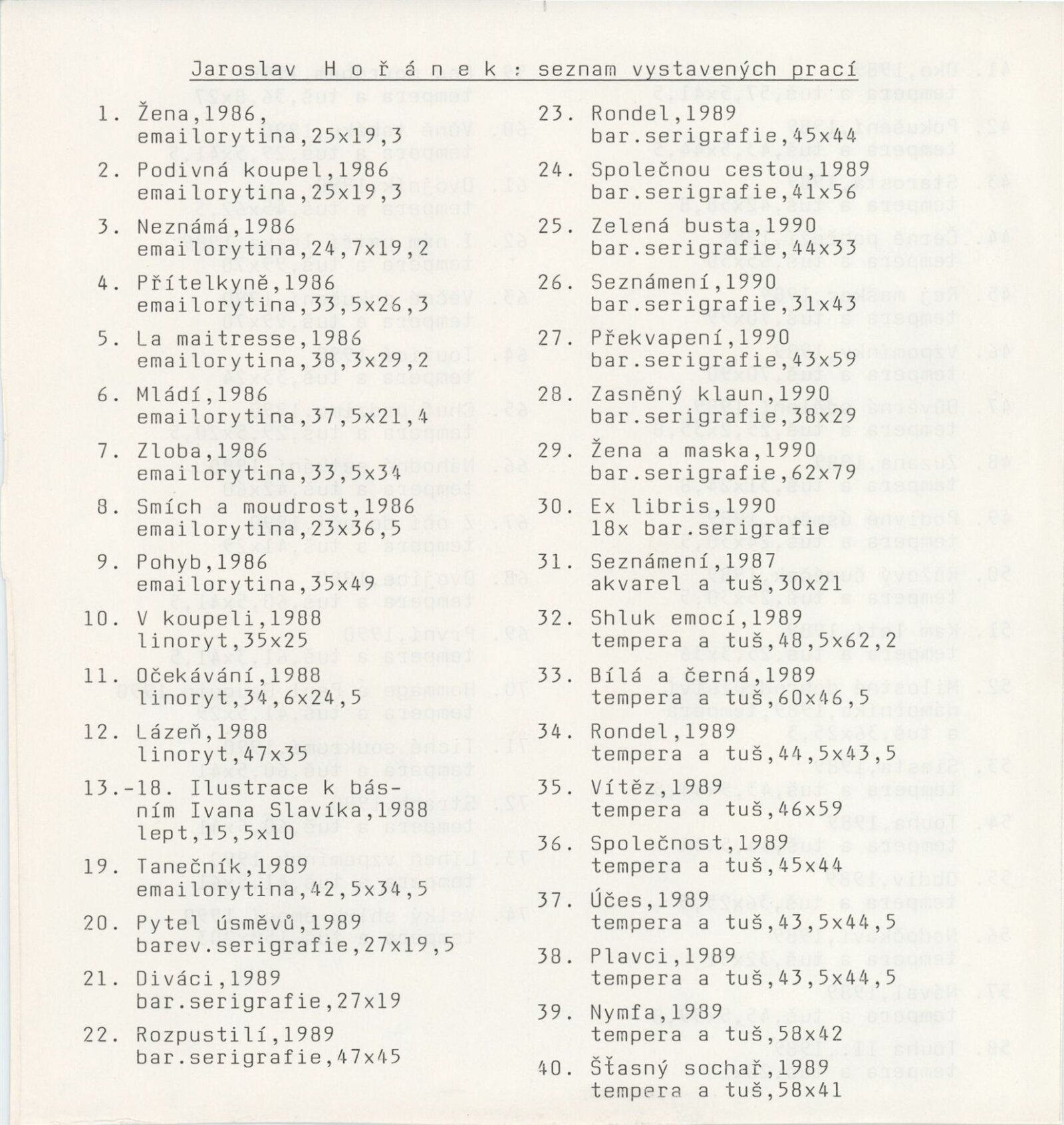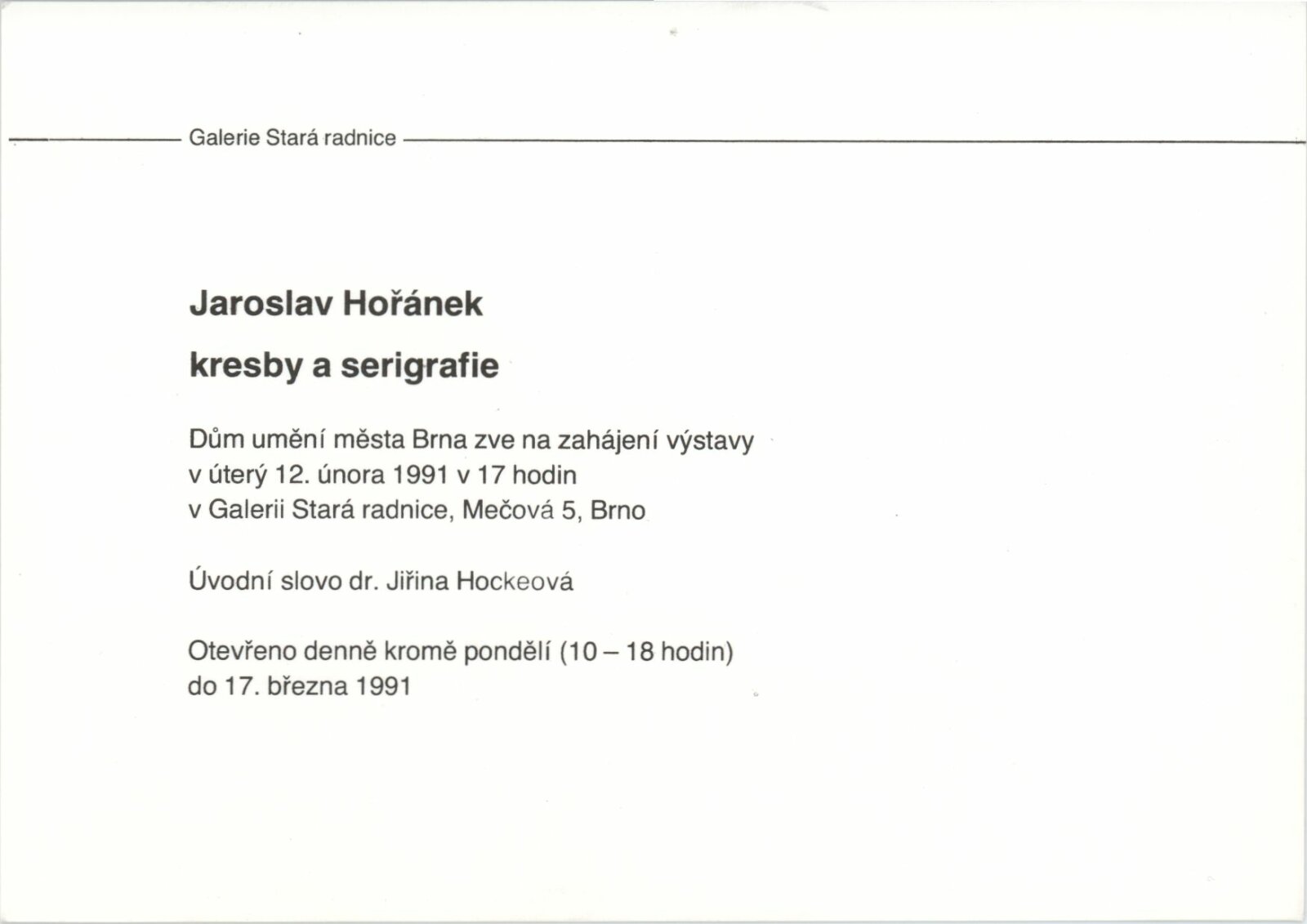Jaroslav Hořánek. Kresby a serigrafie: Galerie Stará radnice, Síň Vincence Makovského, přízemí, 12. 2. – 17. 3. 1991 / Text: Jiřina Hockeová. – Brno: DUmB, 1991. – skládačka (6 s., obr.), životopis, portrét, GSR 92. – MZK; MG