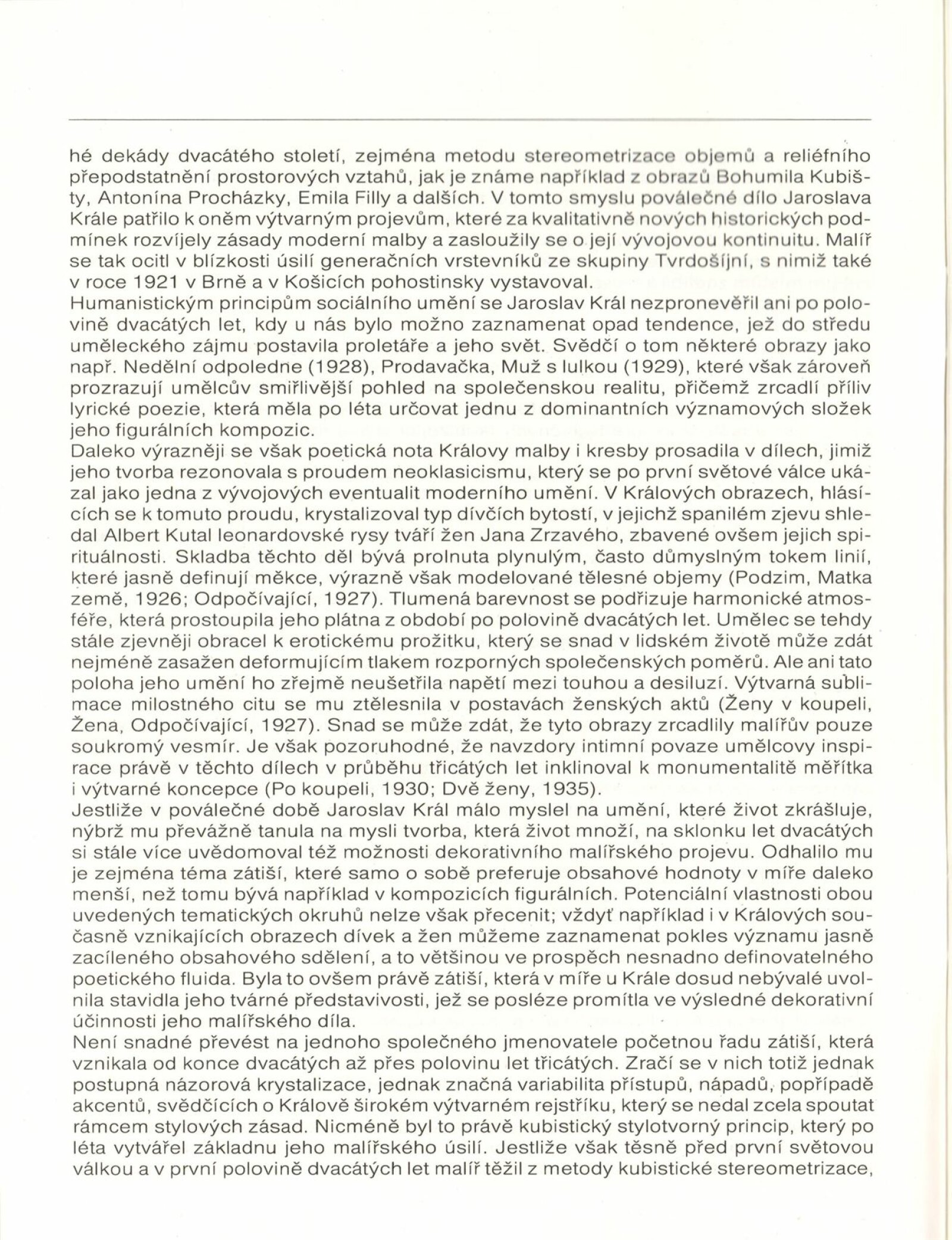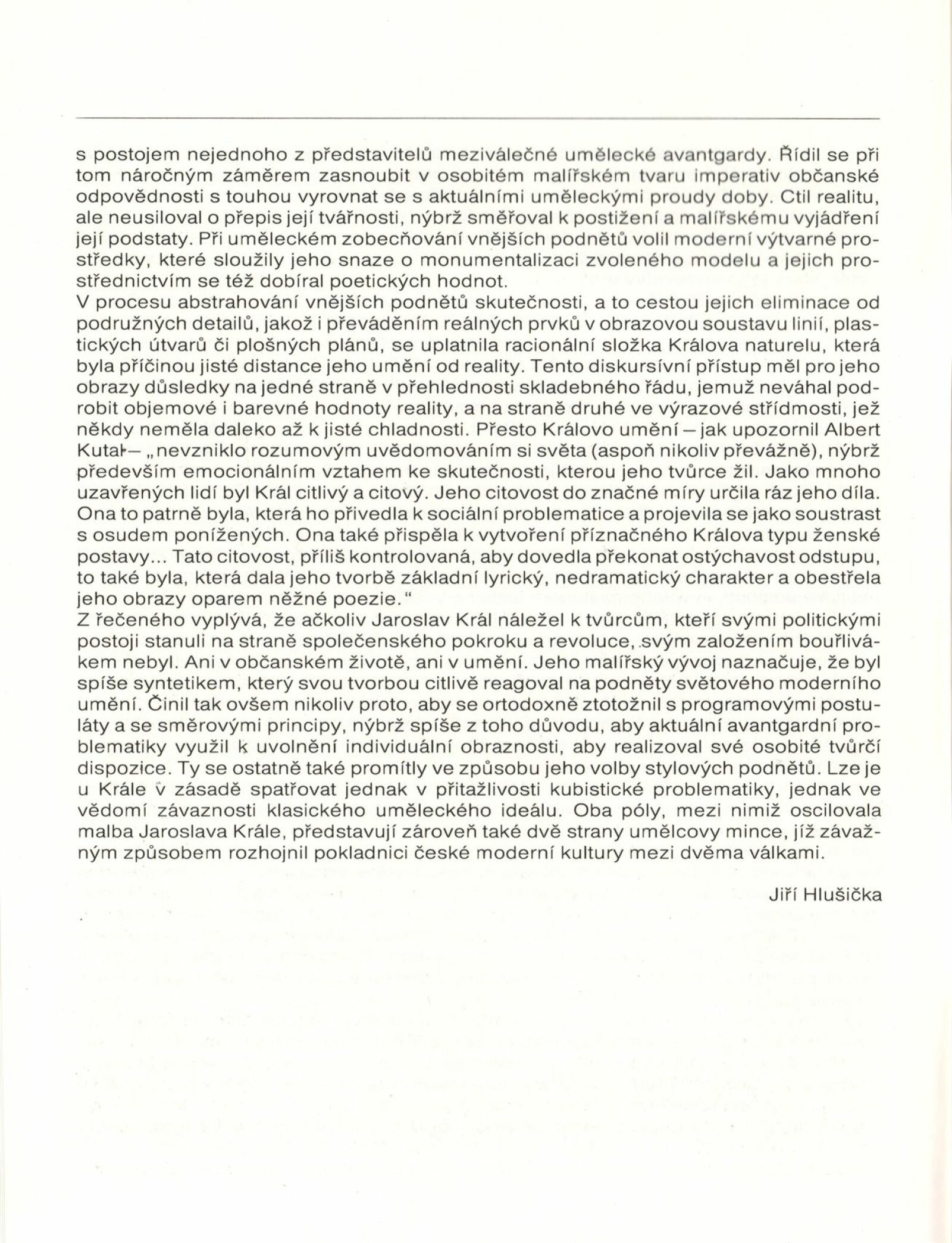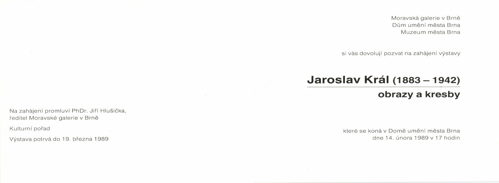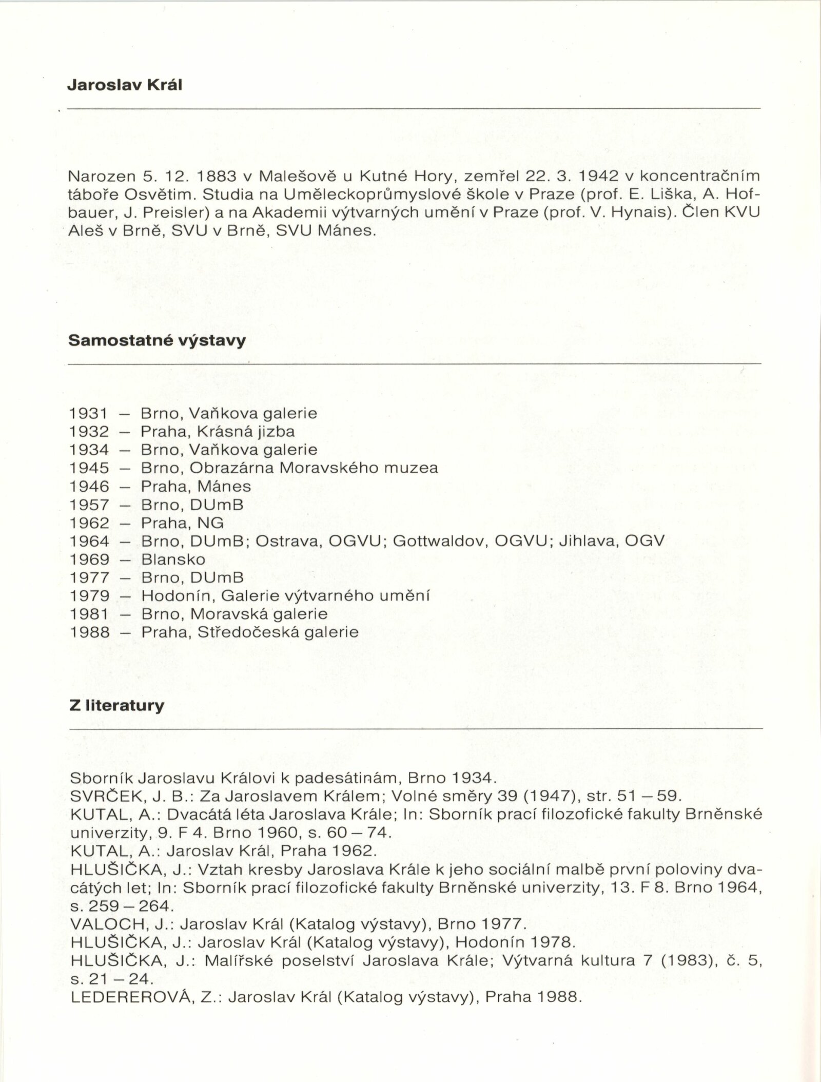 Jaroslav Král (1883–1942). Obrazy a kresby: Dům umění města Brna, 1. patro, 14. 2. – 19. 3. 1989 / Text: Jiří Hlušička. – Brno: Moravská galerie, 1989. – [38] s., obr., životní data, výstavy, bibliografie, DU 863. – MZK; MG; MMB