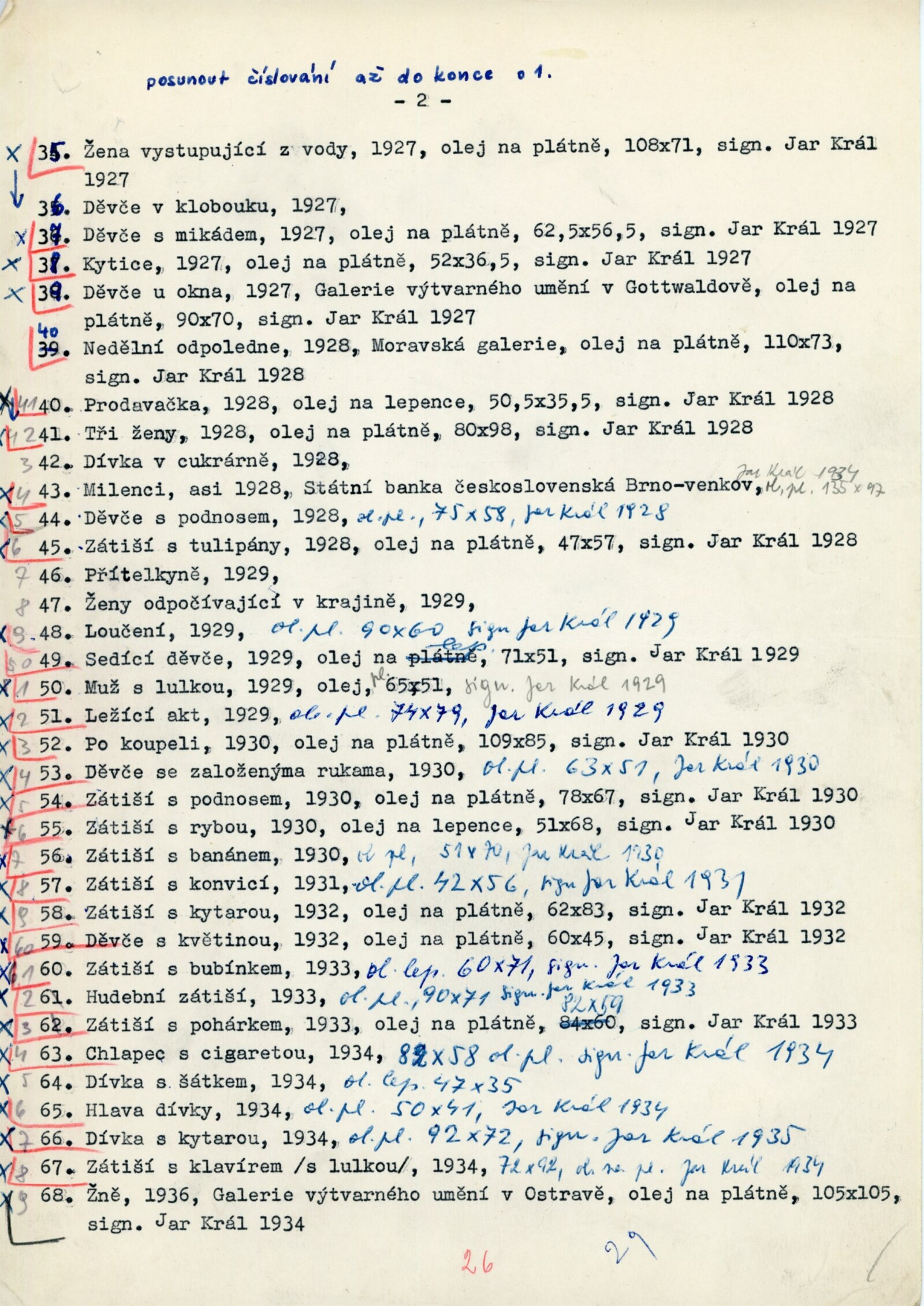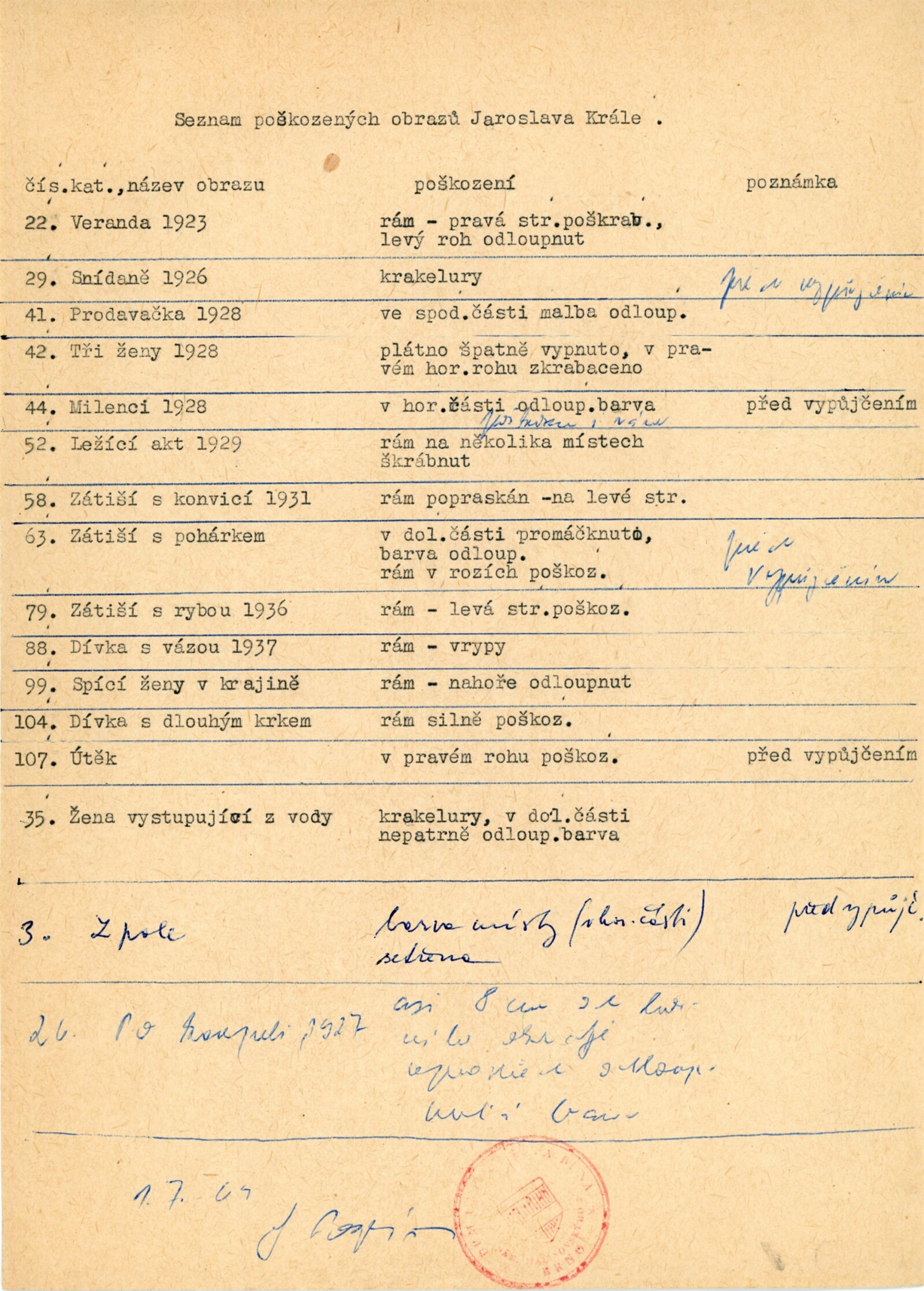 pozvánka (NG, Brno), katalog, seznam prací a majitelů, seznam poškozených obrazů, text katalogu, plakát výstavy v Ostravě, reverzy, korespondence o reprízách a poškození obrazů, recenze v tisku, digitalizovaný videozáznam ČT - záběry z výstav 1963-1969