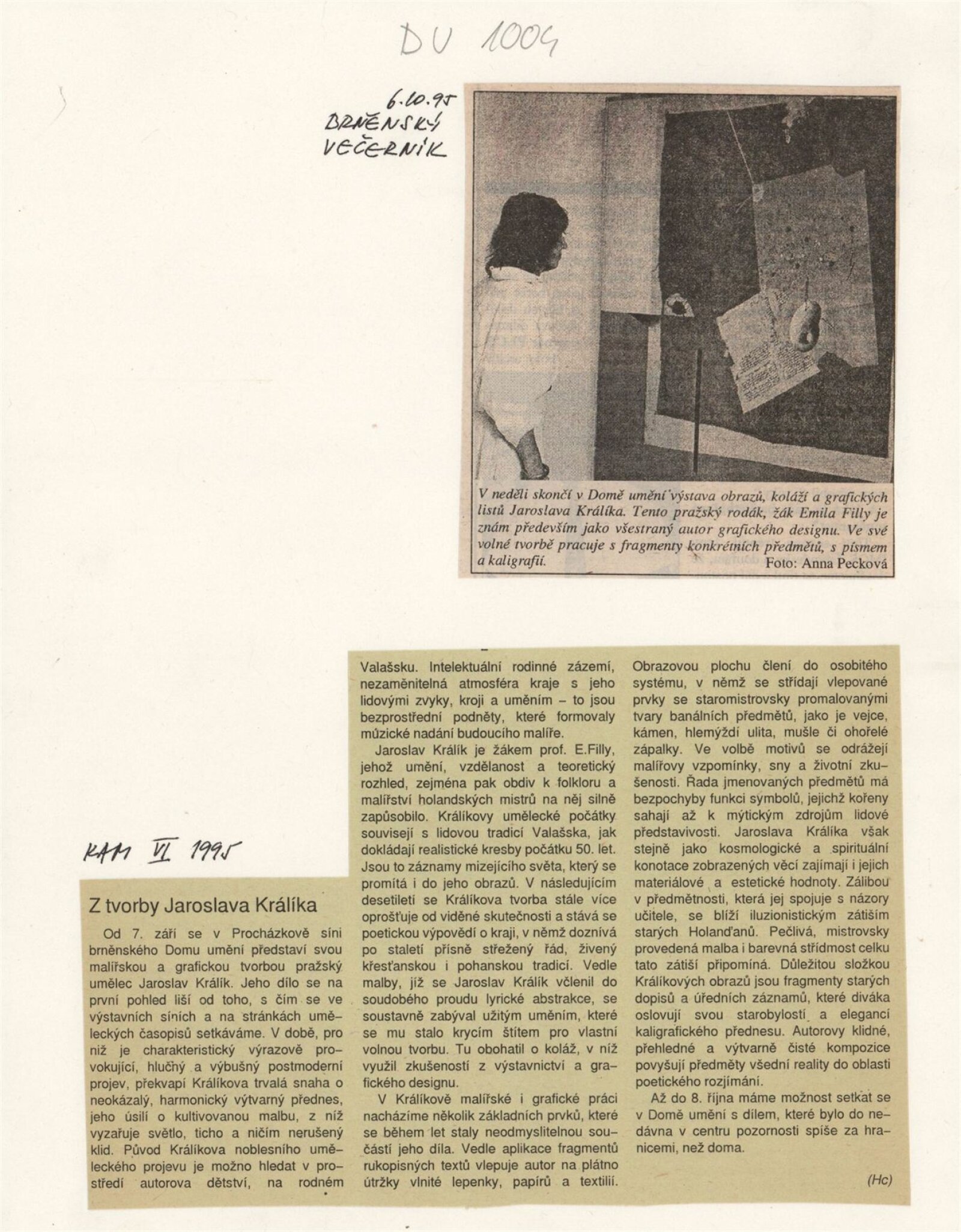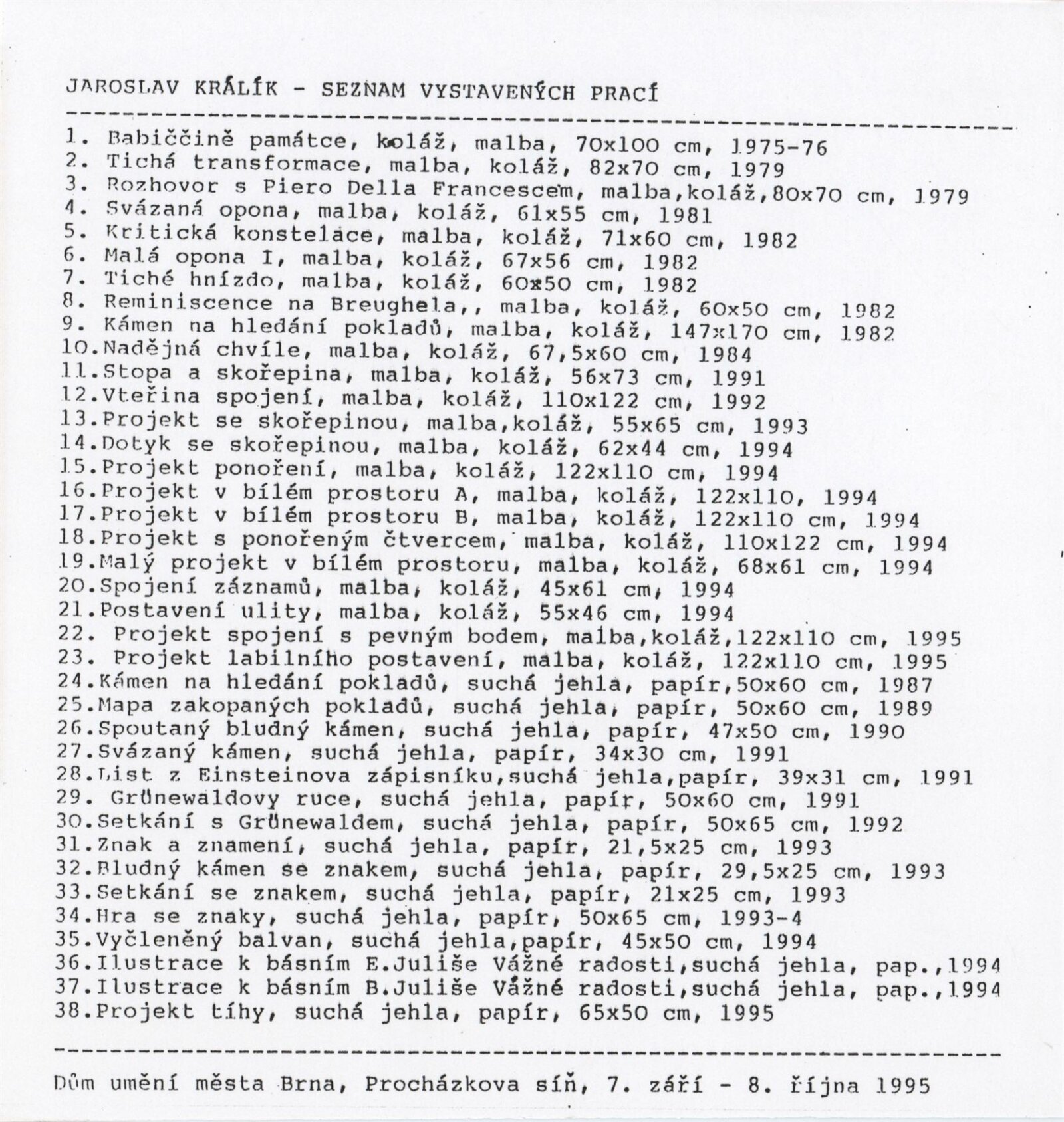 Jaroslav Králík: Procházkova síň Domu umění 7. 9. – 8. 10. 1995 / Text Jiřina Hockeová. - Brno: DUmB, - 1 skládačka (6 s., obr.) + Seznam vystavených prací [1] s. DU 1004