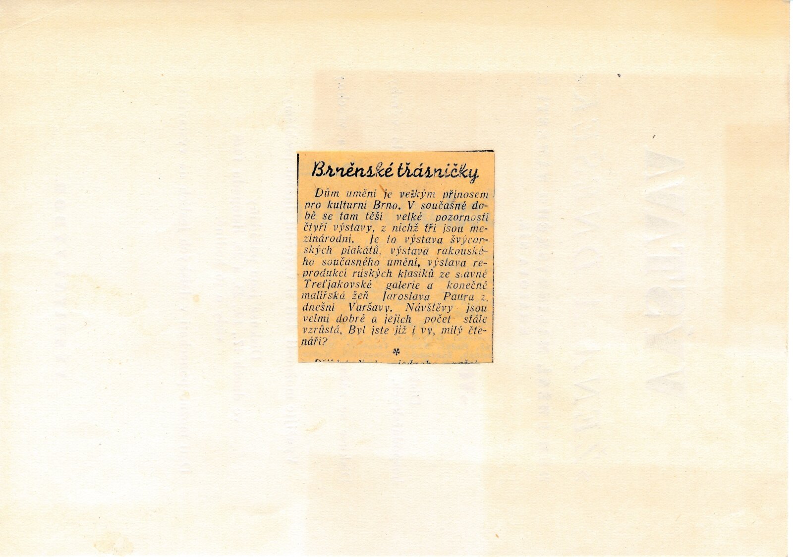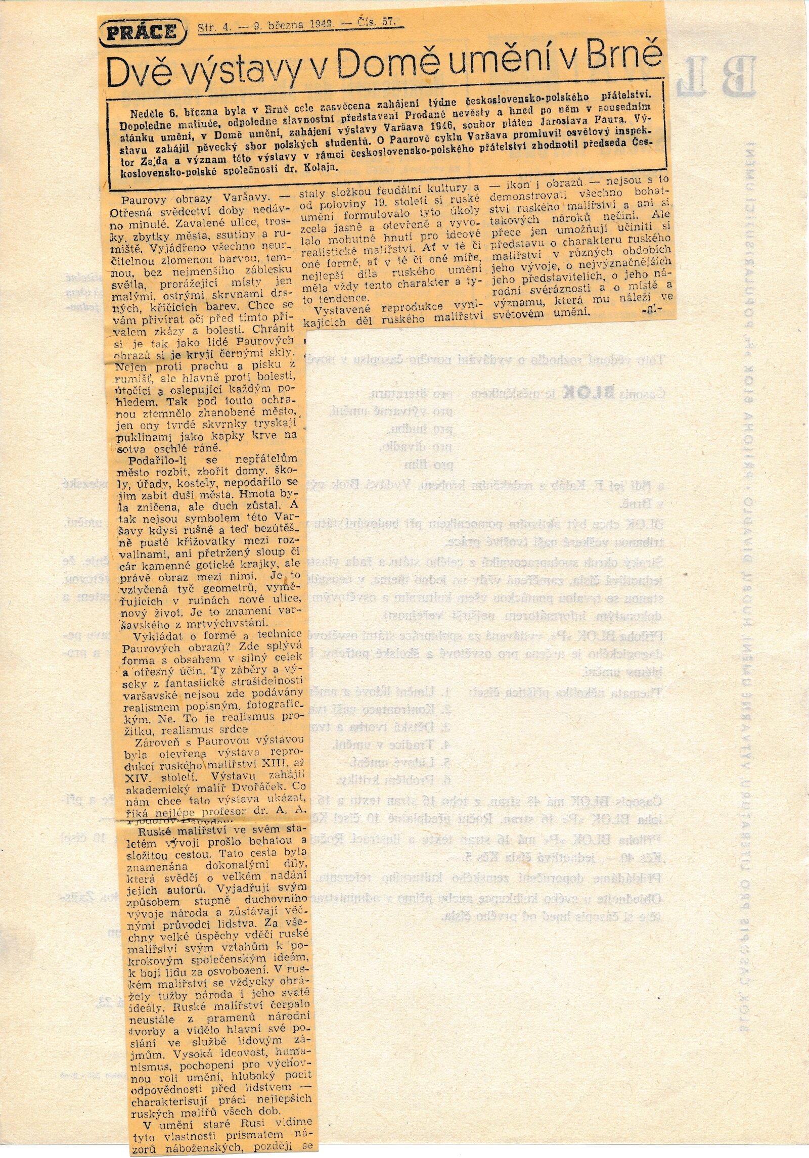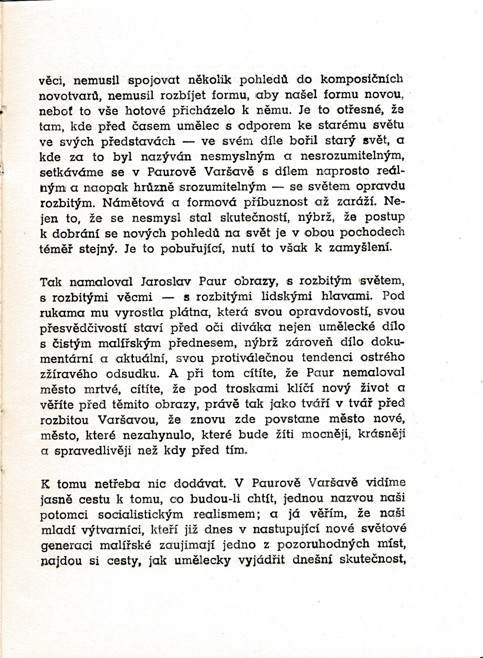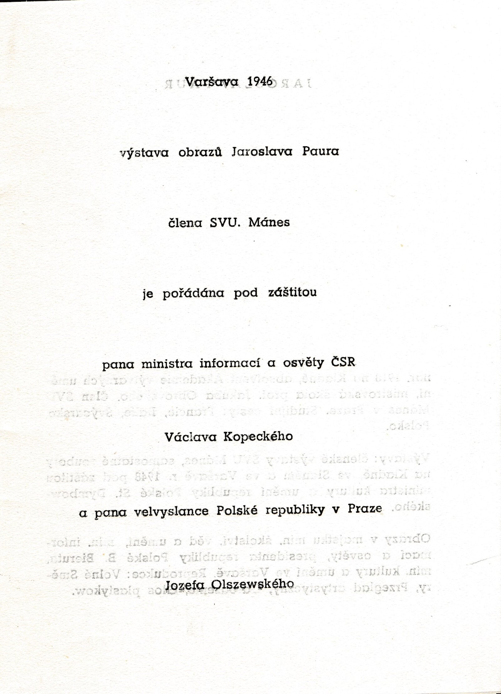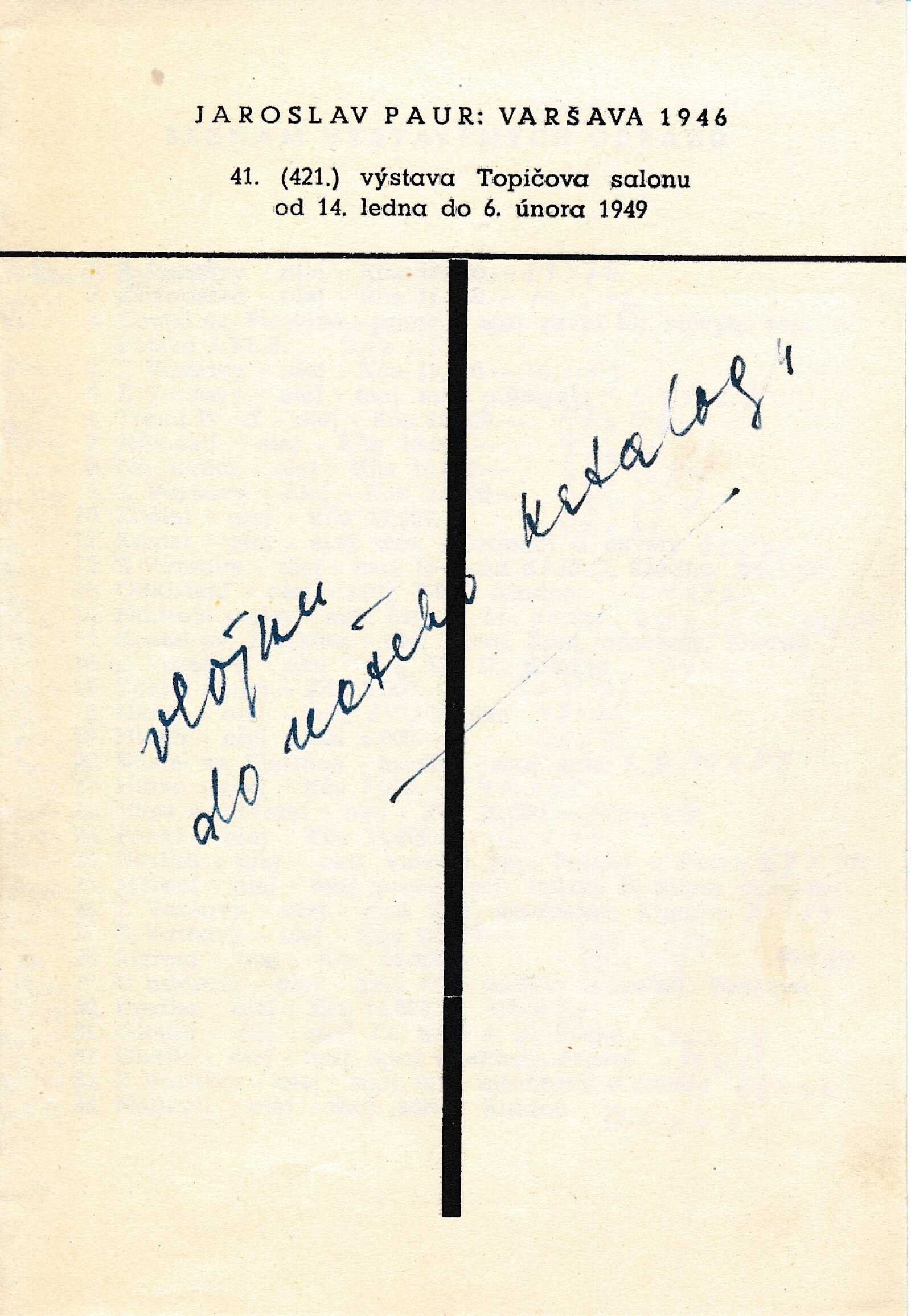 Katalog výstav Domu umění, pořádaných 3. 3. – 27. 3. 1949 / Obsahuje výstavy: Reprodukce ruského malířství 13.–19. století. 96. výstava, Jaroslav Paur: Varšava 1946. 97. výstava, Současné rakouské umění. 98. výstava, Švýcarský plakát. 99. výstava / Brno: Dům umění, 1948. – 11 s., DU 96–99. – Kubíček 7638; MZK; MG Jaroslav Paur. Varšava 1946: Dům umění v Brně 3. 3. – 27. 3. 1949 / Převzatý katalog. Varšava 1946: Výstava obrazů Jaroslava Paura. 421. výstava Topičova salonu, 14. 1. – 6. 2. 1949 / Text: František Rachlík. – Praha: Topičův salon, 1949. – 16 s., seznam vystavených obrazů, báseň Jerzy Lan, DU 97. – MG