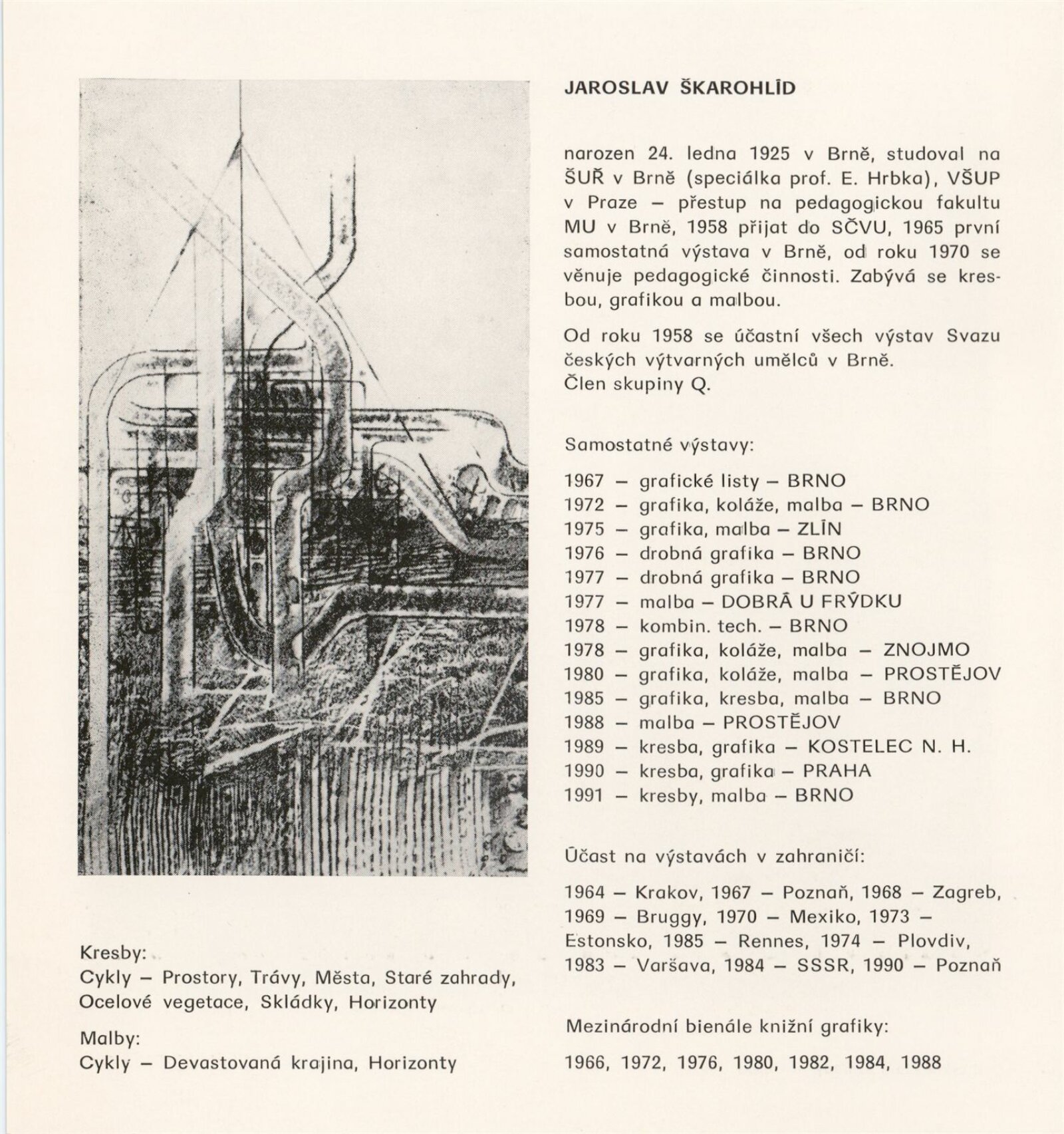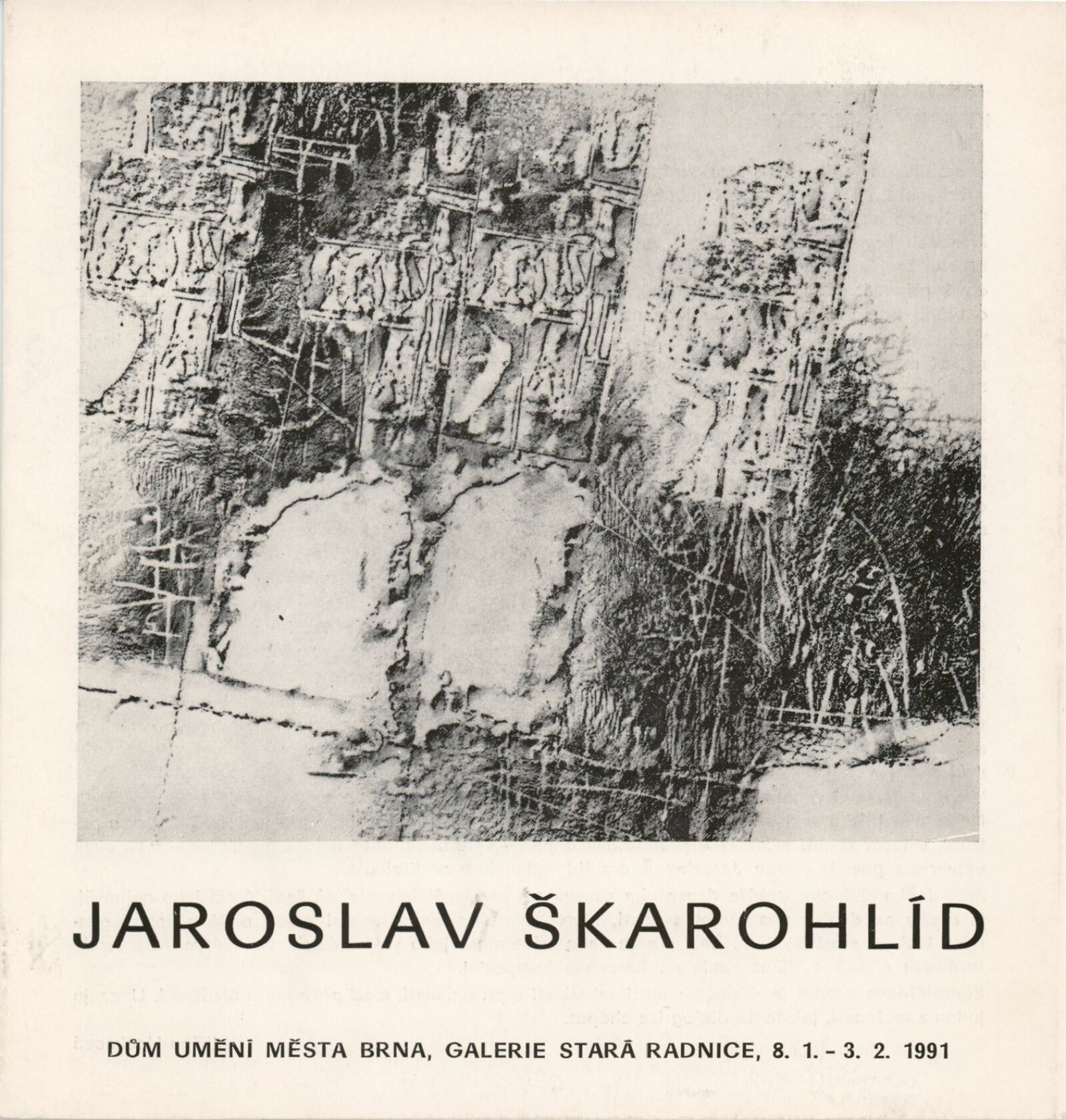 Jaroslav Škarohlíd. Kresby a malby: Galerie Stará radnice, Kabinet grafiky, 8. 1. – 3. 2. 1991 / Text: Jiřina Hockeová. – Brno: DUmB, 1991. – skládačka (6 s., obr.), životní data, výstavy, GSR 89. – MZK; MG