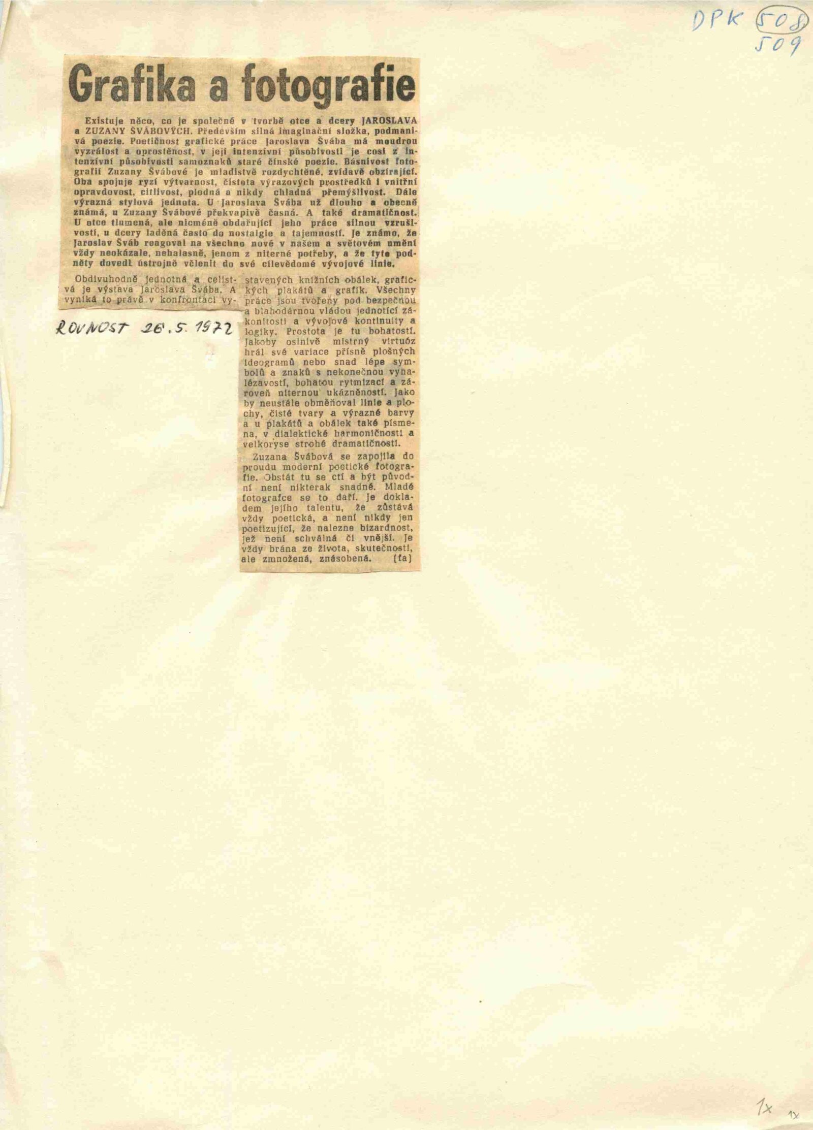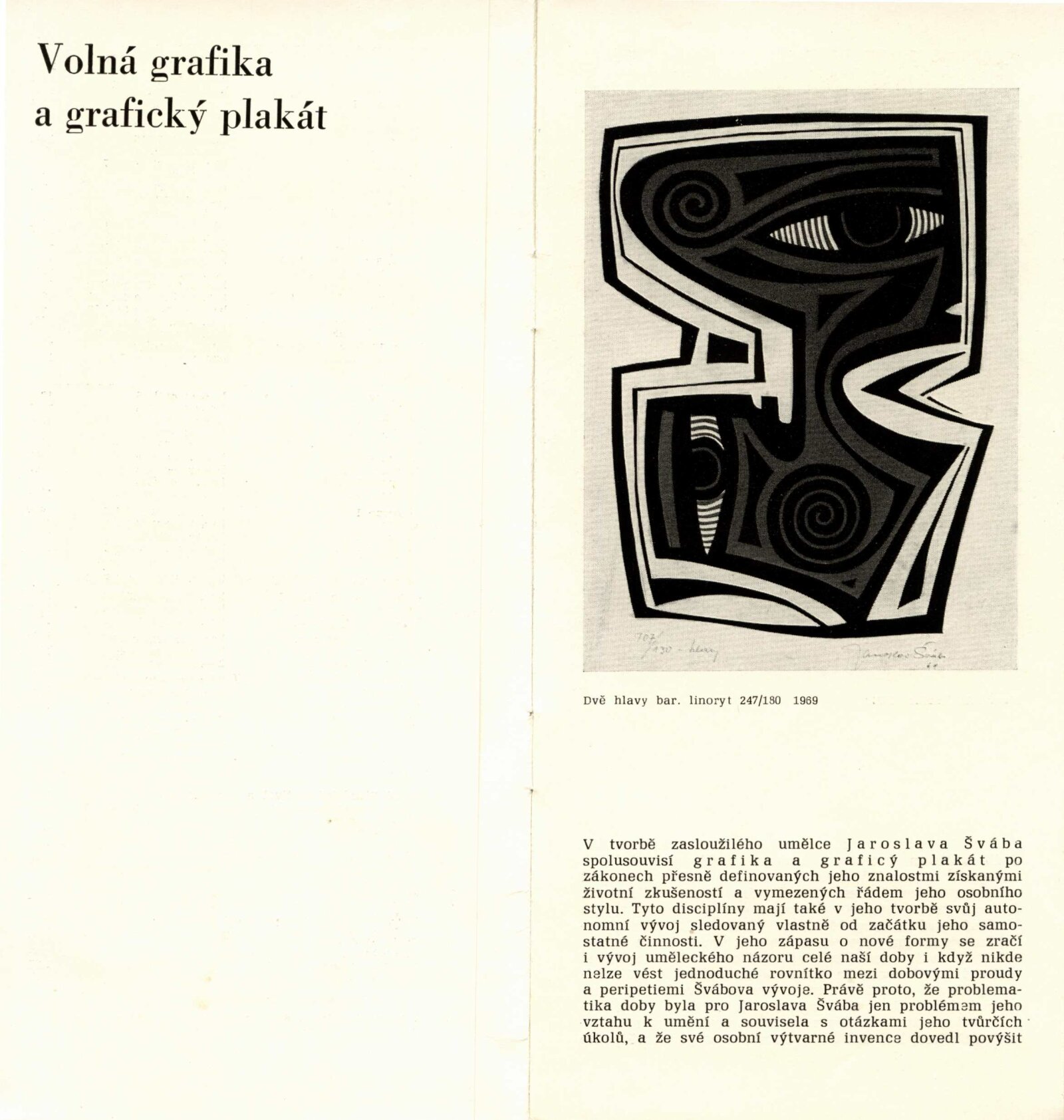 Jaroslav Šváb. Grafická a knižní tvorba: Dům umění města Brna / Dům pánů z Kunštátu, 132. výstava Kabinetu grafiky, 5. 5. – 28. 5. 1972 / Převzatý katalog. Jaroslav Šváb. Volná grafika a grafický plakát: výstavní síň Fronta, Praha, 4. 10. – 28. 10. 1971 / Text: František Dvořák. – Praha: Fronta, 1971. – 16 s., obr., životní data, výstavy, bibliografie, do katalogu vkládána vložka: Ideogram v knize Jaroslava Švába: součást výstavy Grafická a knižní tvorba v Domě pánů z Kunštátu v Brně v květnu 1972 / Text: Jan Řezáč. – Brno: DUmB, 1972. – skládačka, 6 s., obr., DPK 508. – MG