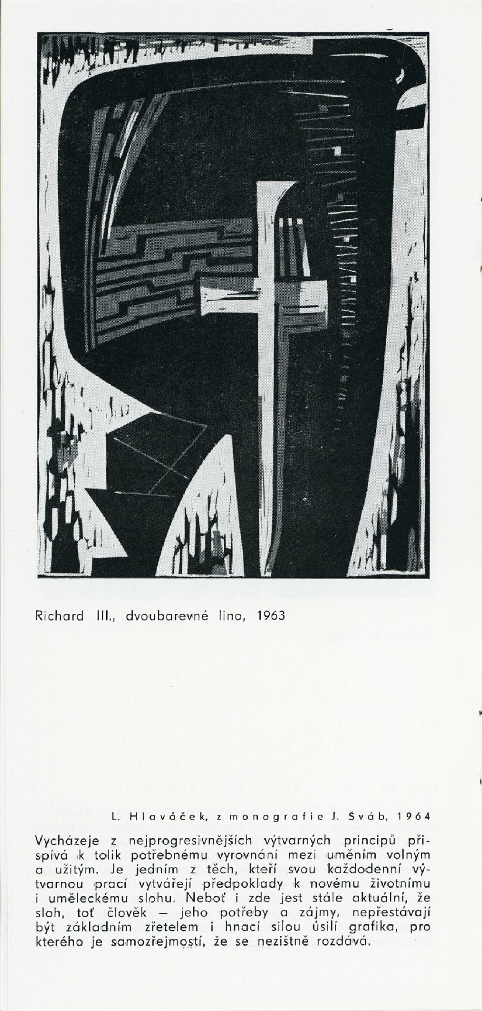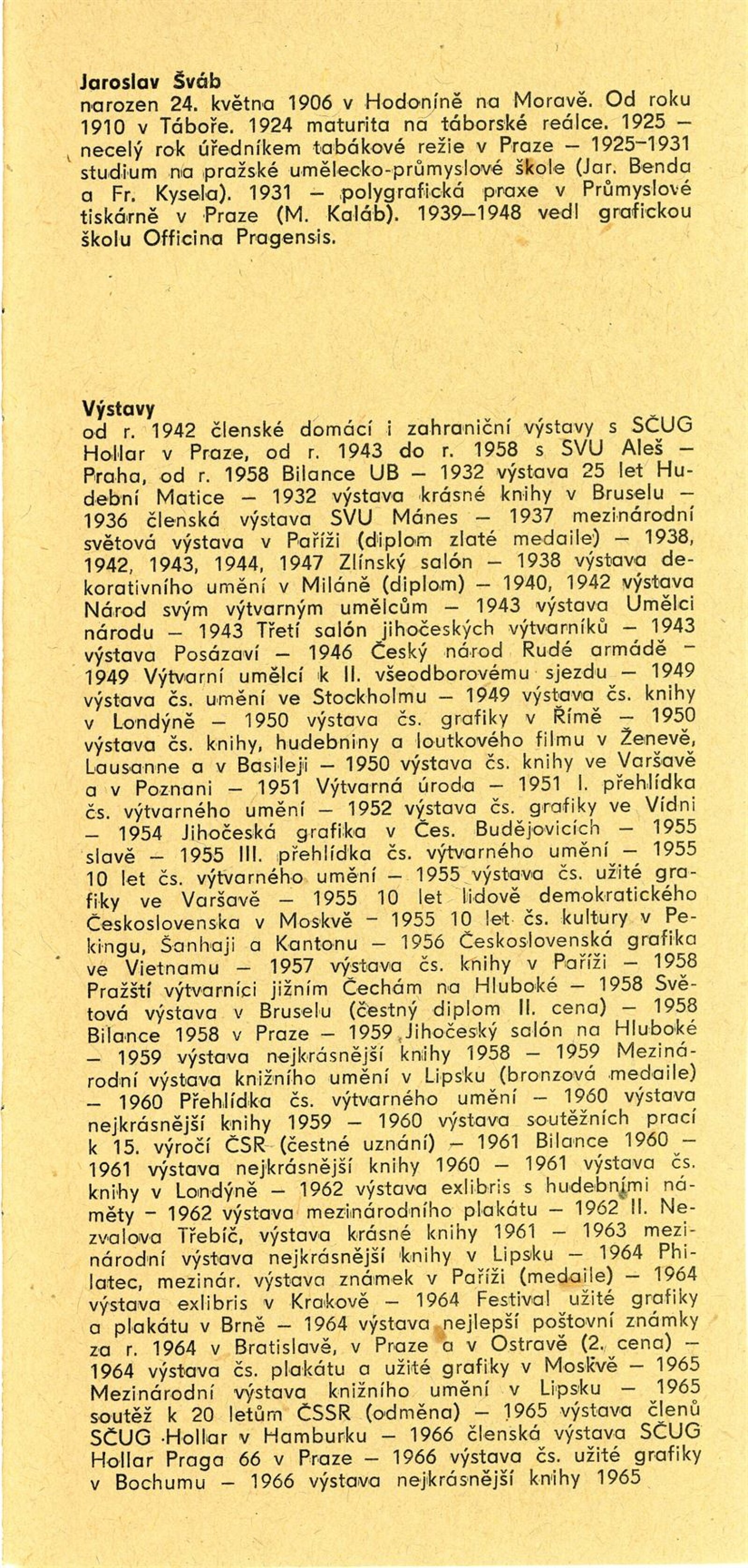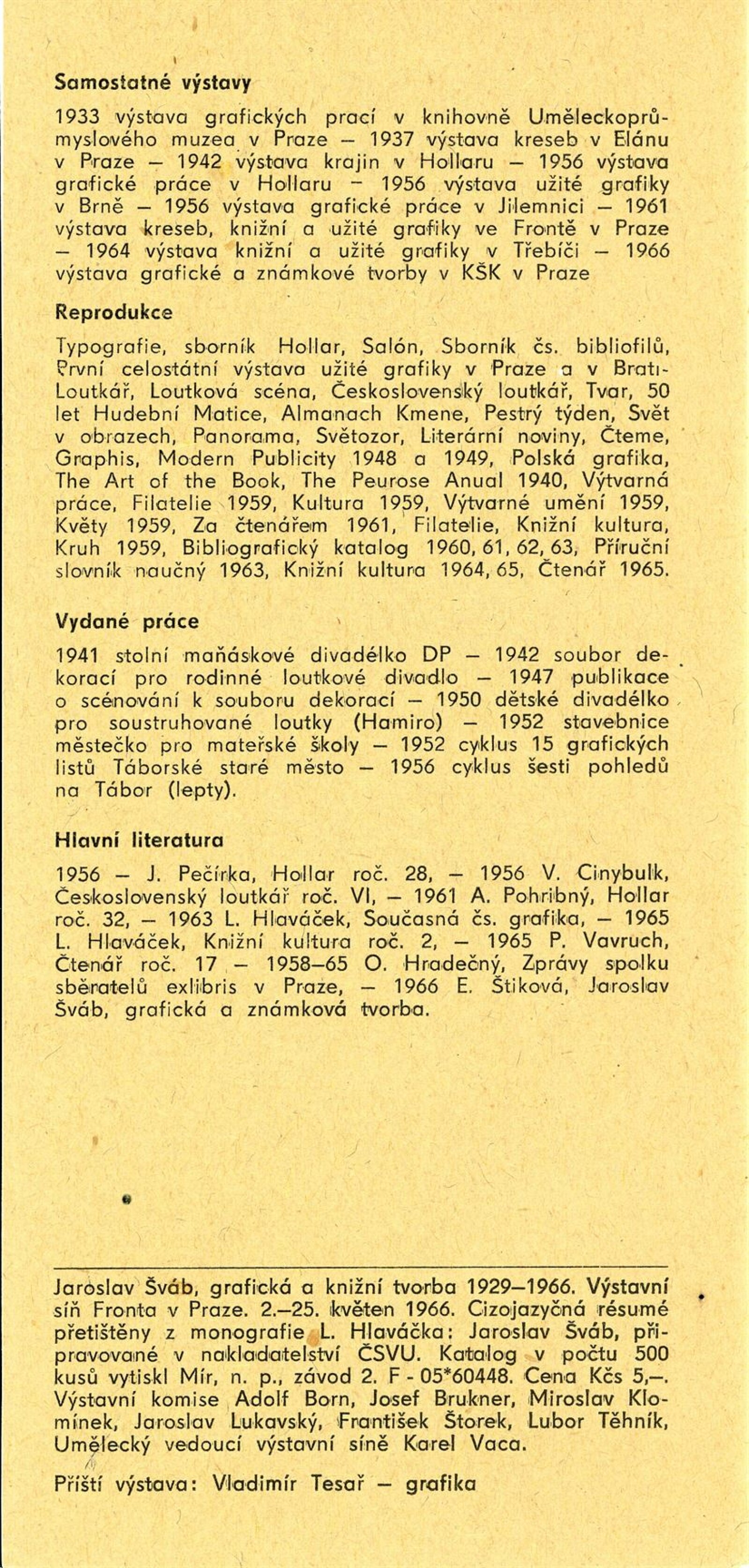 Jaroslav Šváb. Knižní a užitá grafika: Dům umění města Brna / Dům pánů z Kunštátu, 81. výstava Kabinetu grafiky, 3. 3. – 2. 4. 1967 / Převzatý katalog. Jaroslav Šváb. Grafická a knižní tvorba 1929–1966: Výstavní síň Fronta, Praha, 2. 5. – 25. 5. 1966 / Texty: různí autoři. – Praha: Fronta, 1966. – 18 s., obr., životní data, výstavy, reprodukce, vydané práce, bibliografie, DPK 331. – MZK; MG