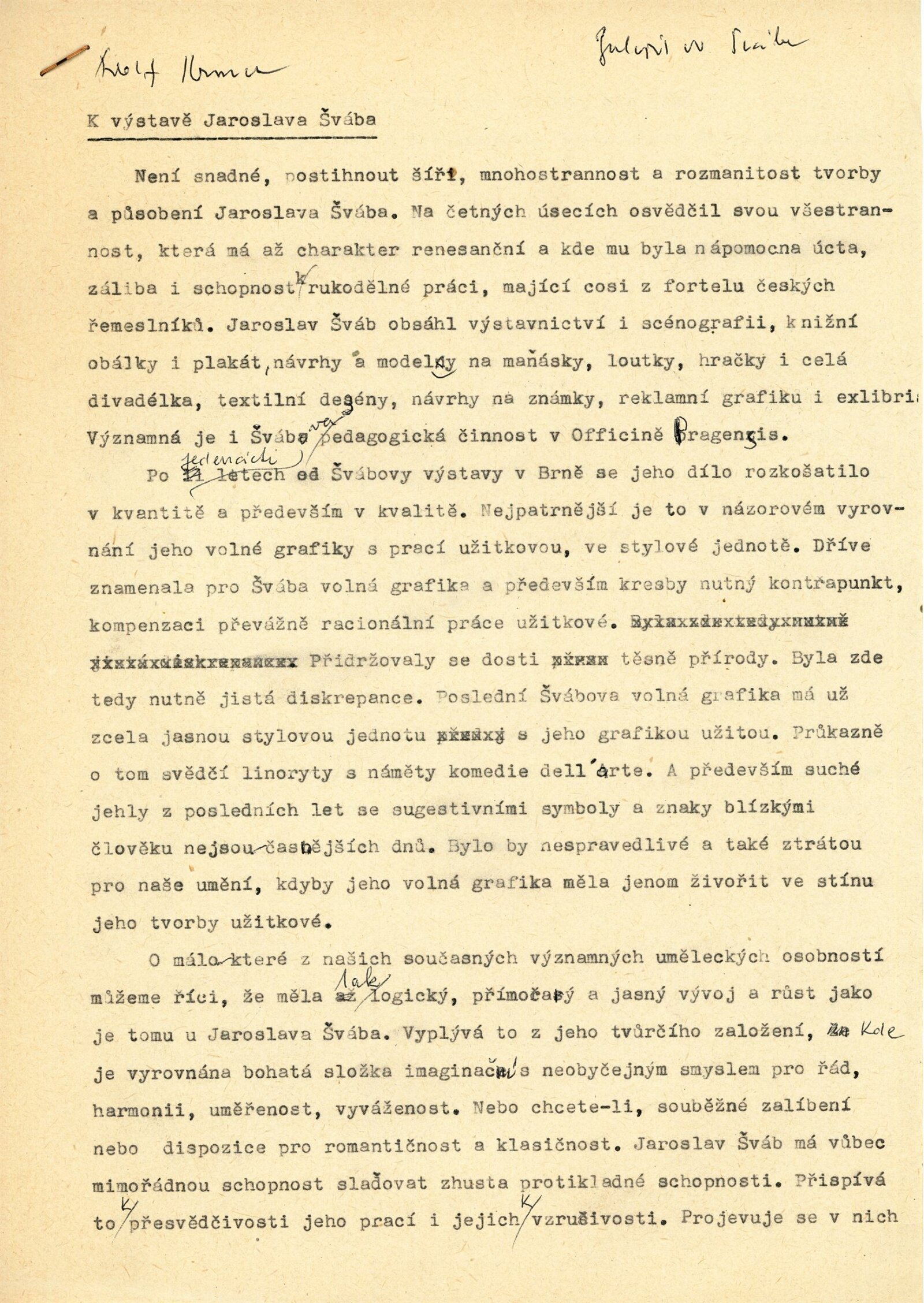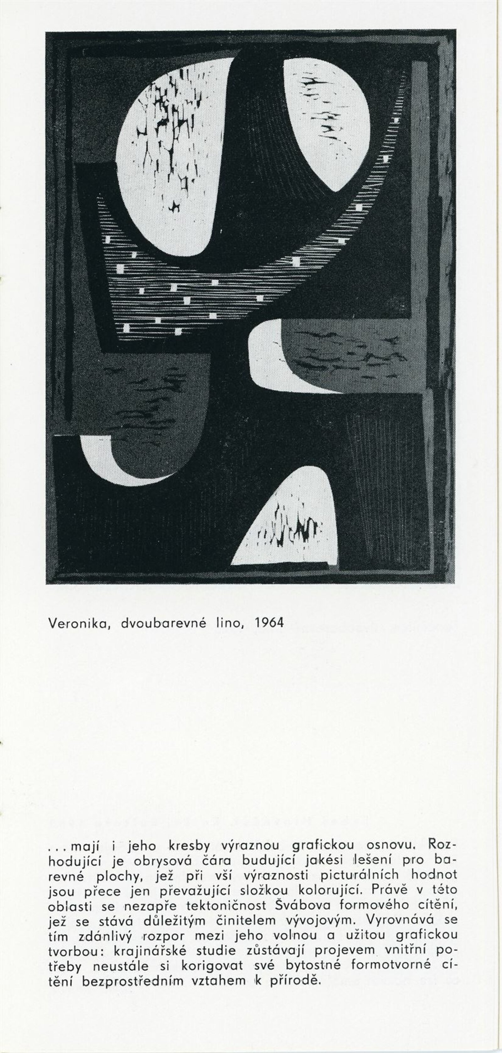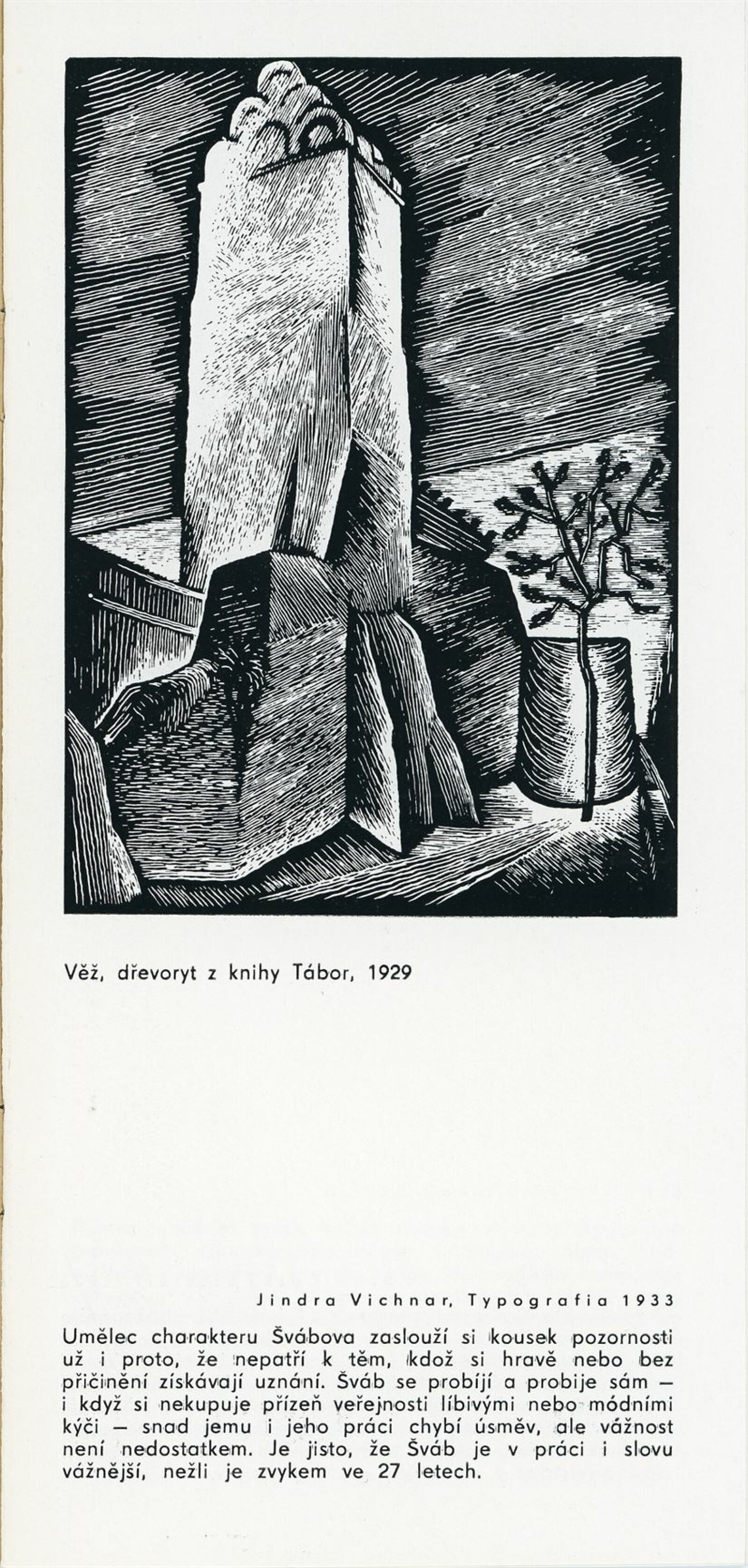 Jaroslav Šváb. Knižní a užitá grafika: Dům umění města Brna / Dům pánů z Kunštátu, 81. výstava Kabinetu grafiky, 3. 3. – 2. 4. 1967 / Převzatý katalog. Jaroslav Šváb. Grafická a knižní tvorba 1929–1966: Výstavní síň Fronta, Praha, 2. 5. – 25. 5. 1966 / Texty: různí autoři. – Praha: Fronta, 1966. – 18 s., obr., životní data, výstavy, reprodukce, vydané práce, bibliografie, DPK 331. – MZK; MG