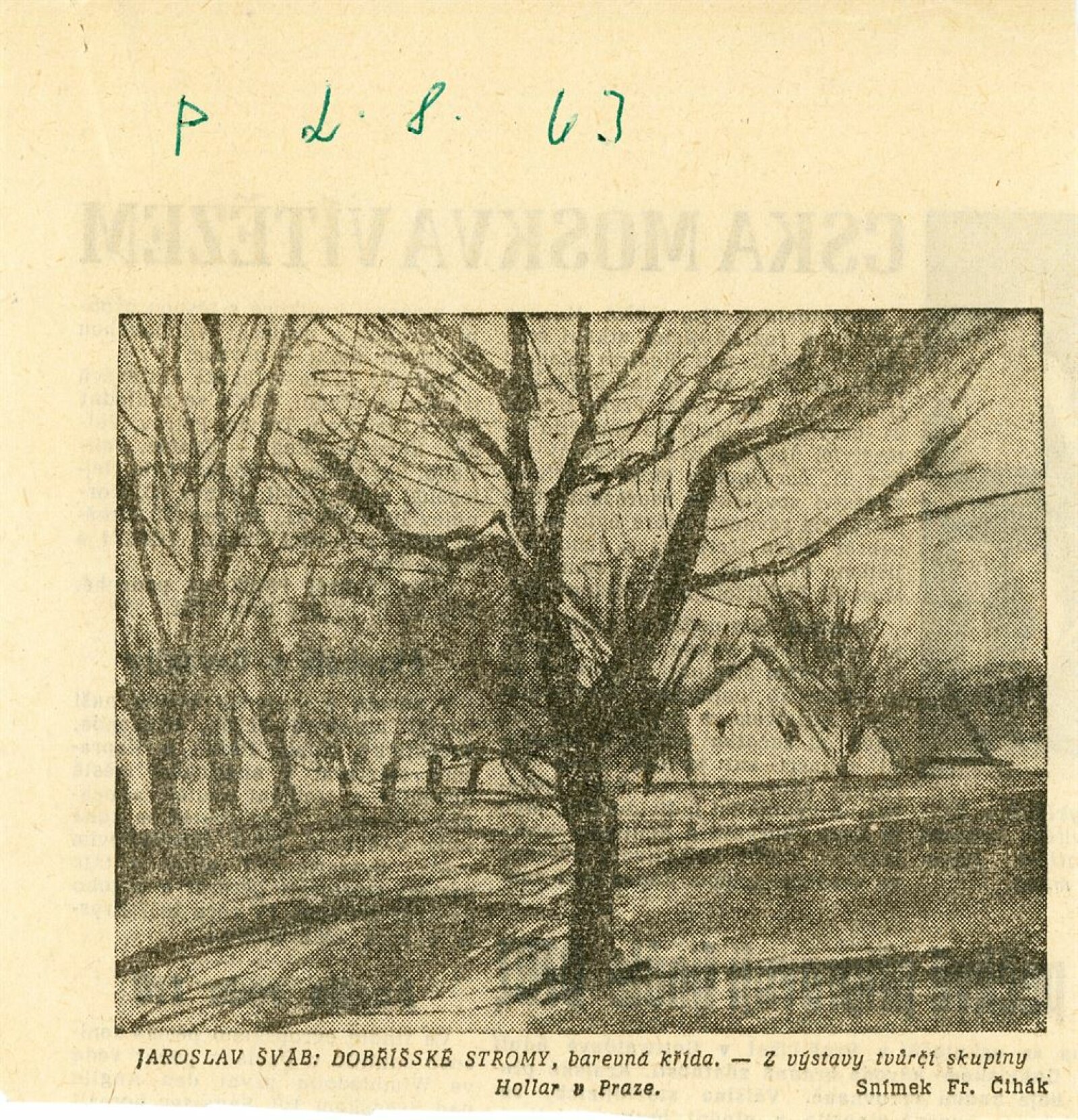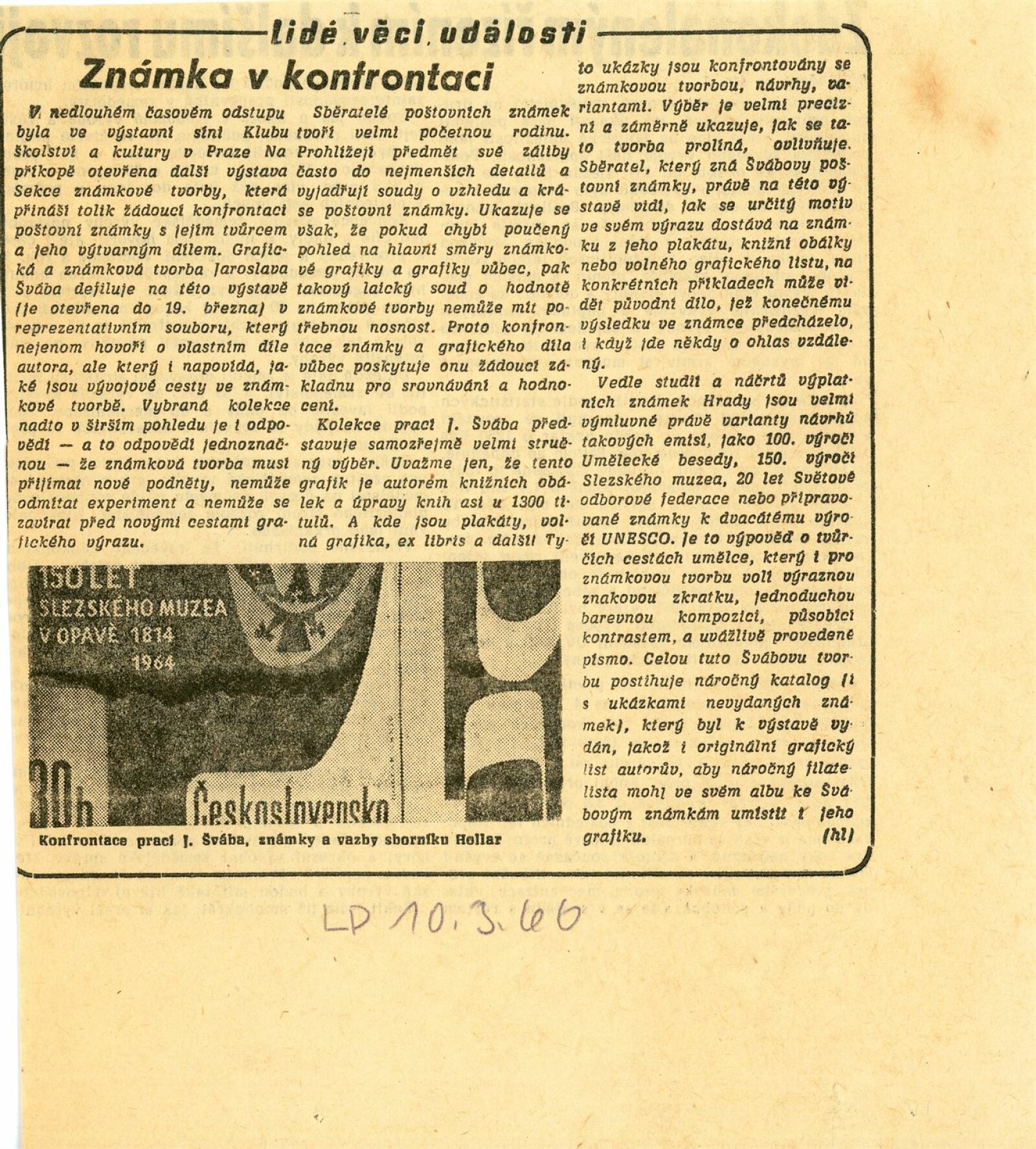 strojopis textu (Adolf Kroupa), strojopis textu (Karla Holešovského), seznam vystavených děl, fotografie (vernisáže, výstavy), korespondence (Jaroslav Šváb, Milada Nováková, dopis J. Šváb 7. 1. 1967, provozní korespondence), recenze v tisku, pozvánka a katalog převzaté z výstavy (Fronta Praha), katalog (SČUG Hollar Grafika Praga 66)