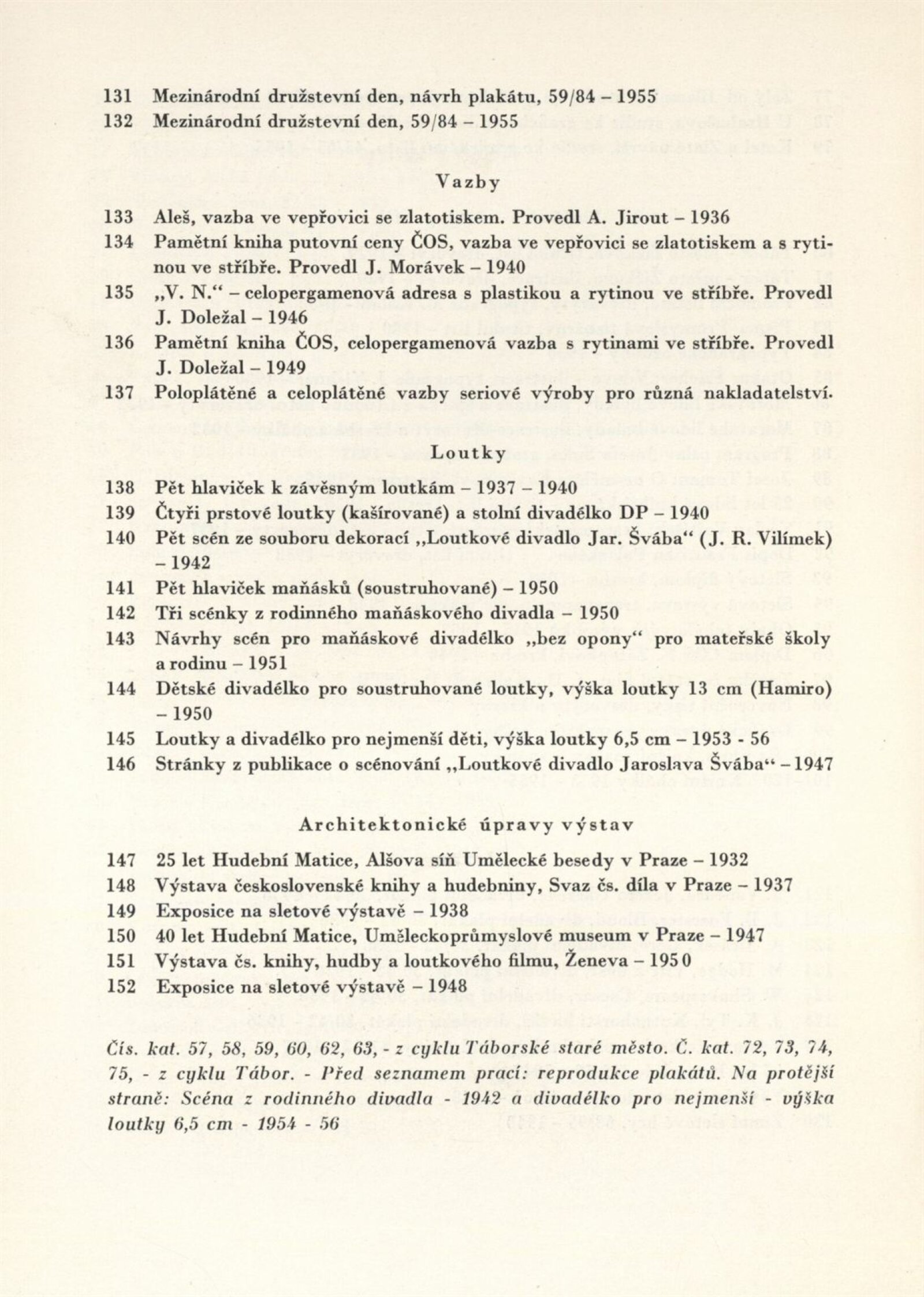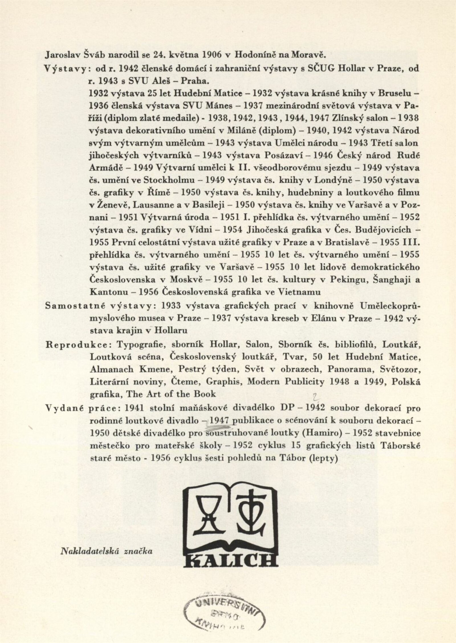 Jaroslav Šváb. Výstava užité grafiky. Dům umění města Brna, 24. 6. – 15. 7. 1956 / Převzatý katalog. Výtvarná práce Jaroslava Švába: Hollar, 13. 4. – 13. 5. 1956 / Text: Karel Štika. – Praha: Přípravný výbor SČSVU, 1956. – 22 s., obr., životní data, DU 257. – MZK; MG