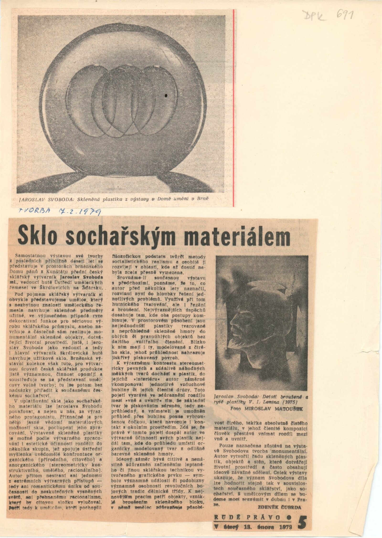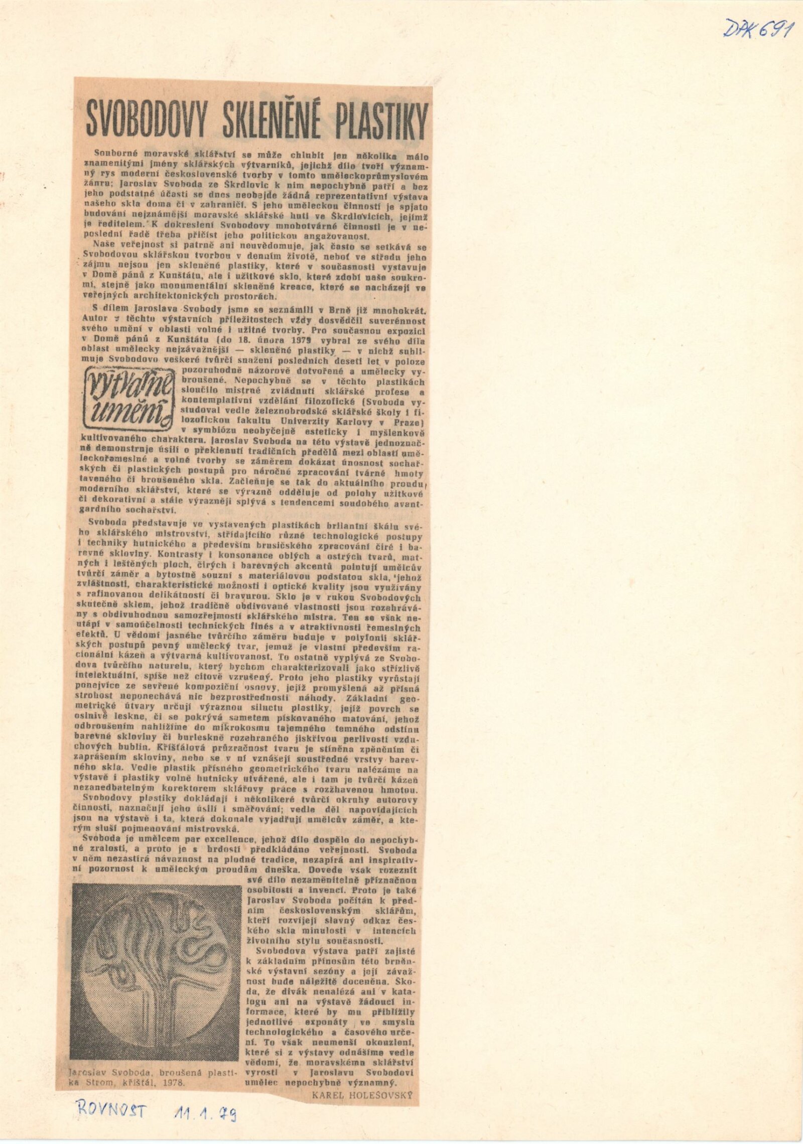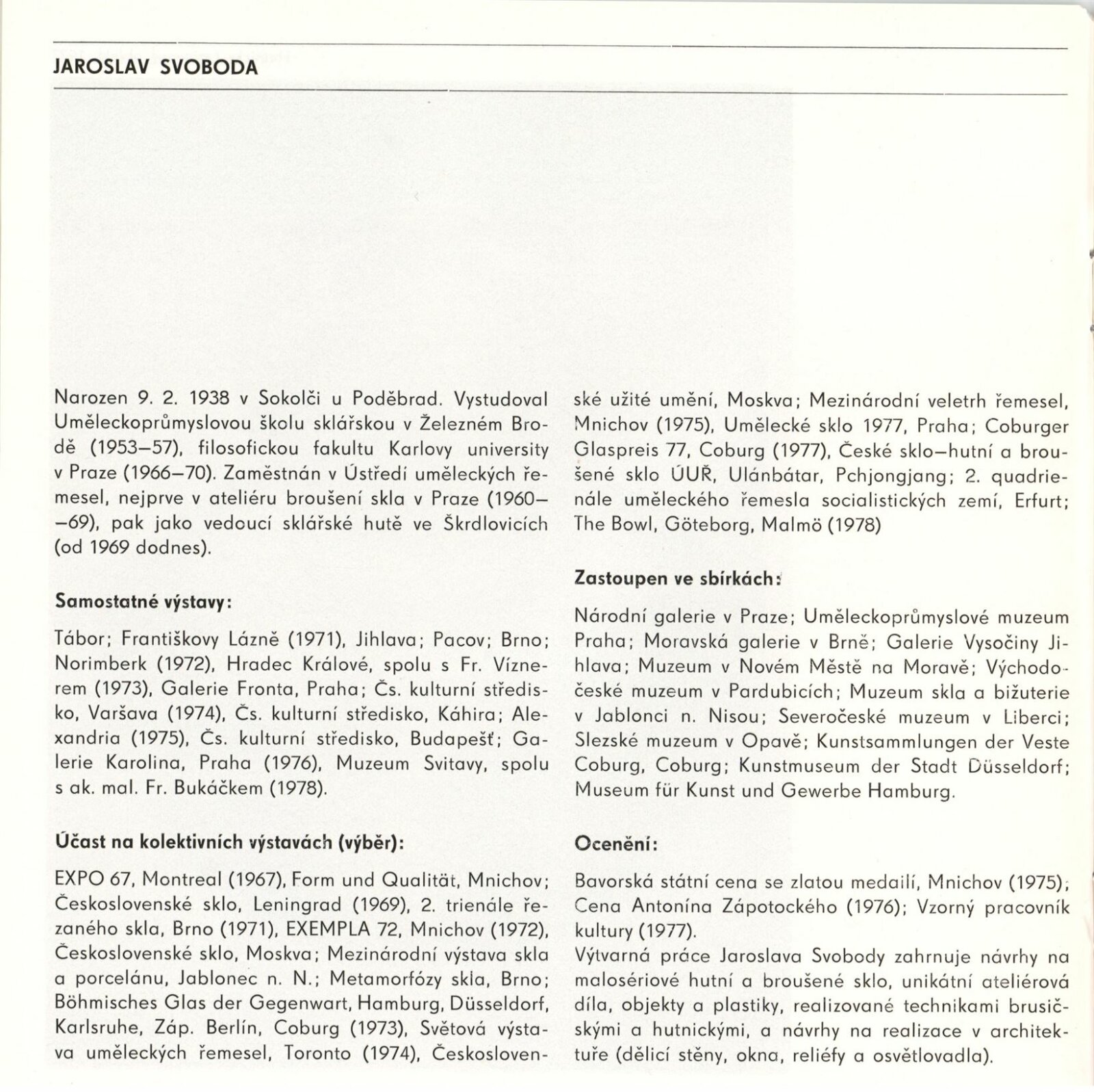 Jaroslav Svoboda. Skleněné plastiky: Dům pánů z Kunštátu 17. 12. 1978 – 18. 2. 1979 / Text Jiří Valoch. - Brno: DUmB, 16 s., obr. Životní data, výstavy, zastoupení ve sbírkách, ocenění DPK 691; MZK; MG; MMB