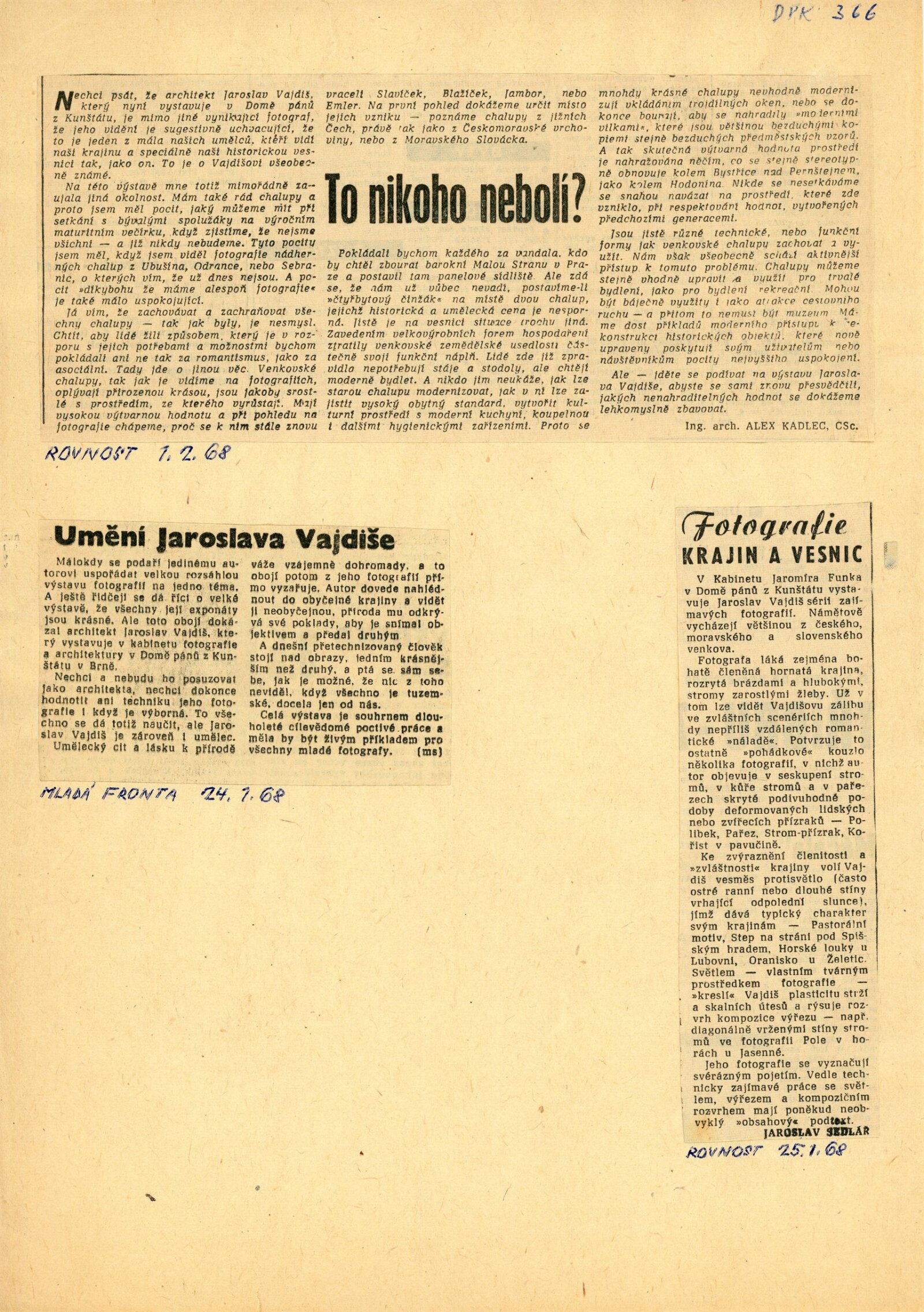 Jaroslav Vajdiš. Fotografie krajin a vesnic: Dům umění města Brna / Dům pánů z Kunštátu, 88. výstava Kabinetu fotografie Jaromíra Funka, 12. 1. – 5. 2. 1968 / Text: Milan Pavlík. – Brno: DUmB, 1968. – 8 s., obr., DPK 366, 367. – MZK; MG