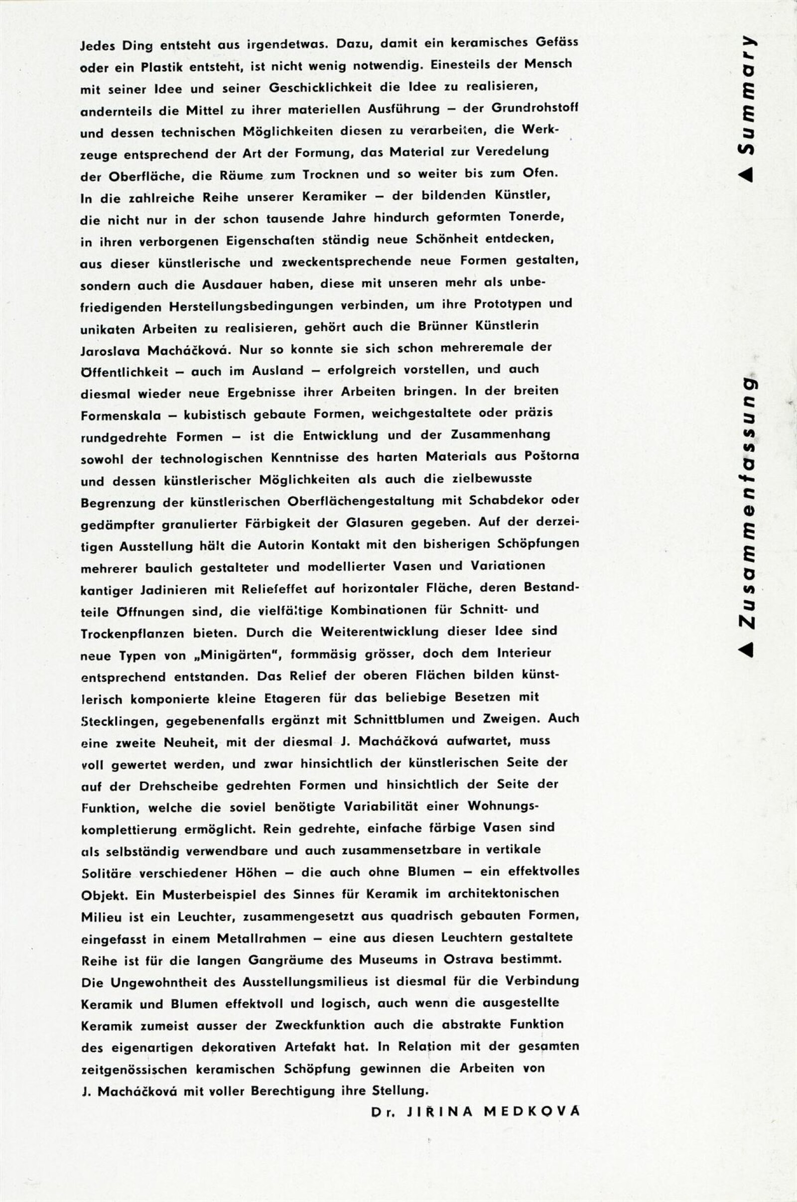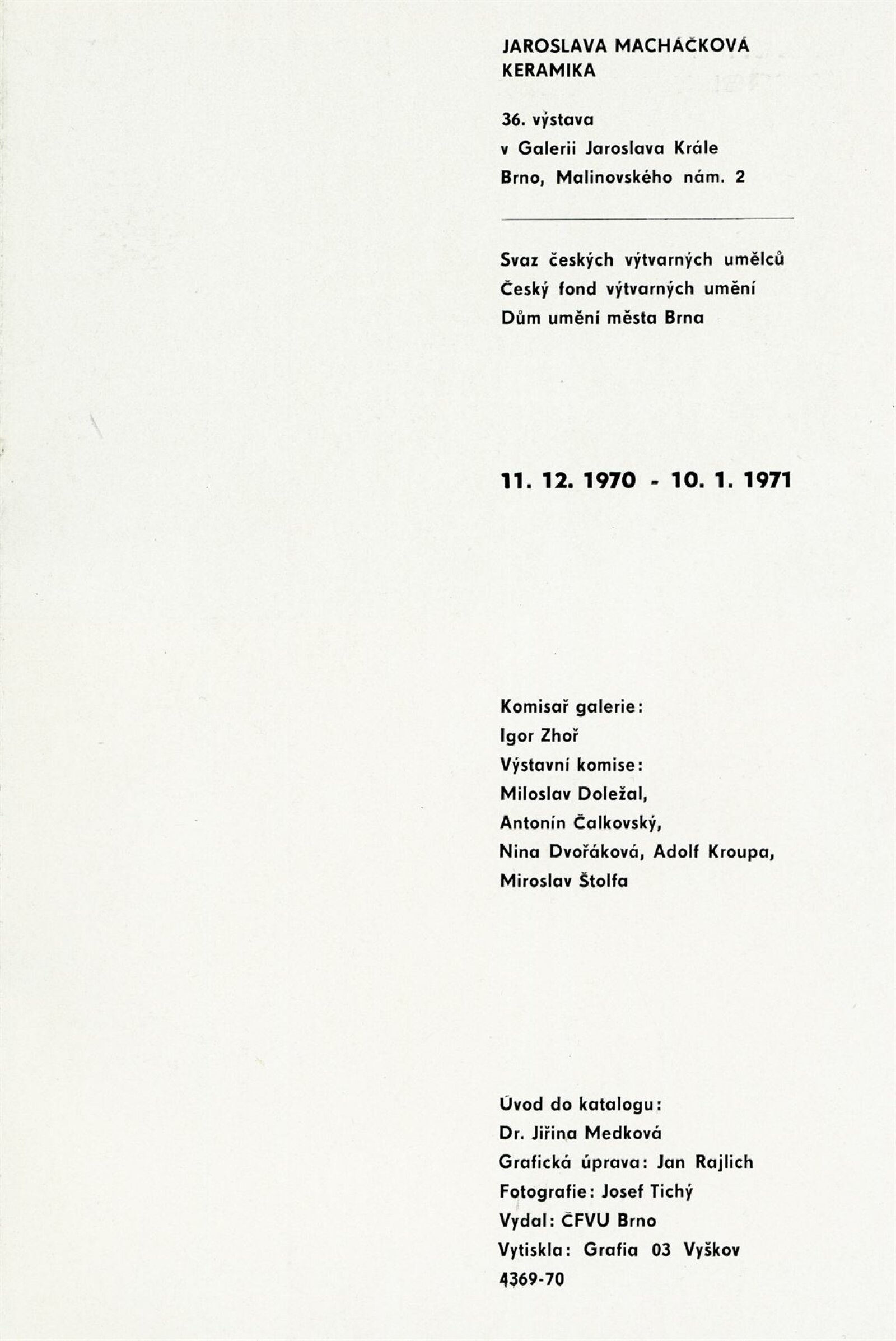 Jaroslava Macháčková. Keramika: Dům umění, 36. výstava v Galerii Jaroslava Krále, 11. 12. 1970 – 10. 1. 1971 / Výstava byla umístěna v Galerii pod Krokodýlem. Text: Jiřina Medková. – Brno: ČFVU, 1970. – 10 s., obr., portrét, životní data, DU 557. – MG