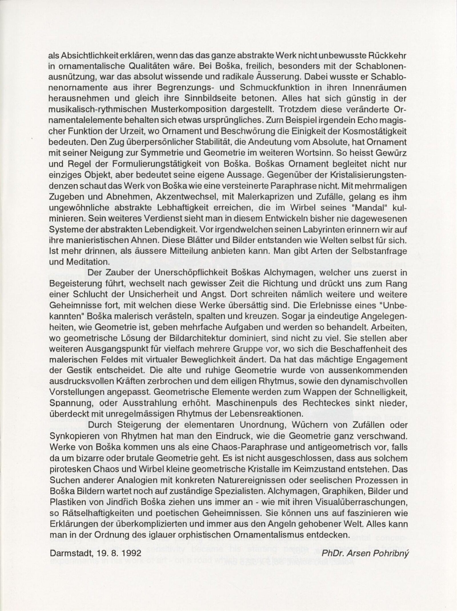 Jindřich Boška. Průřez tvorbou: ... Dům umění města Brna, Procházkova síň, ... 27. 10. – 27. 11. 1994 / Text Arsén Pohribný. - Jihlava: Oblastní galerie Vysočiny, - [38] s., obr. Životní data, výstavy DU 980; MZK