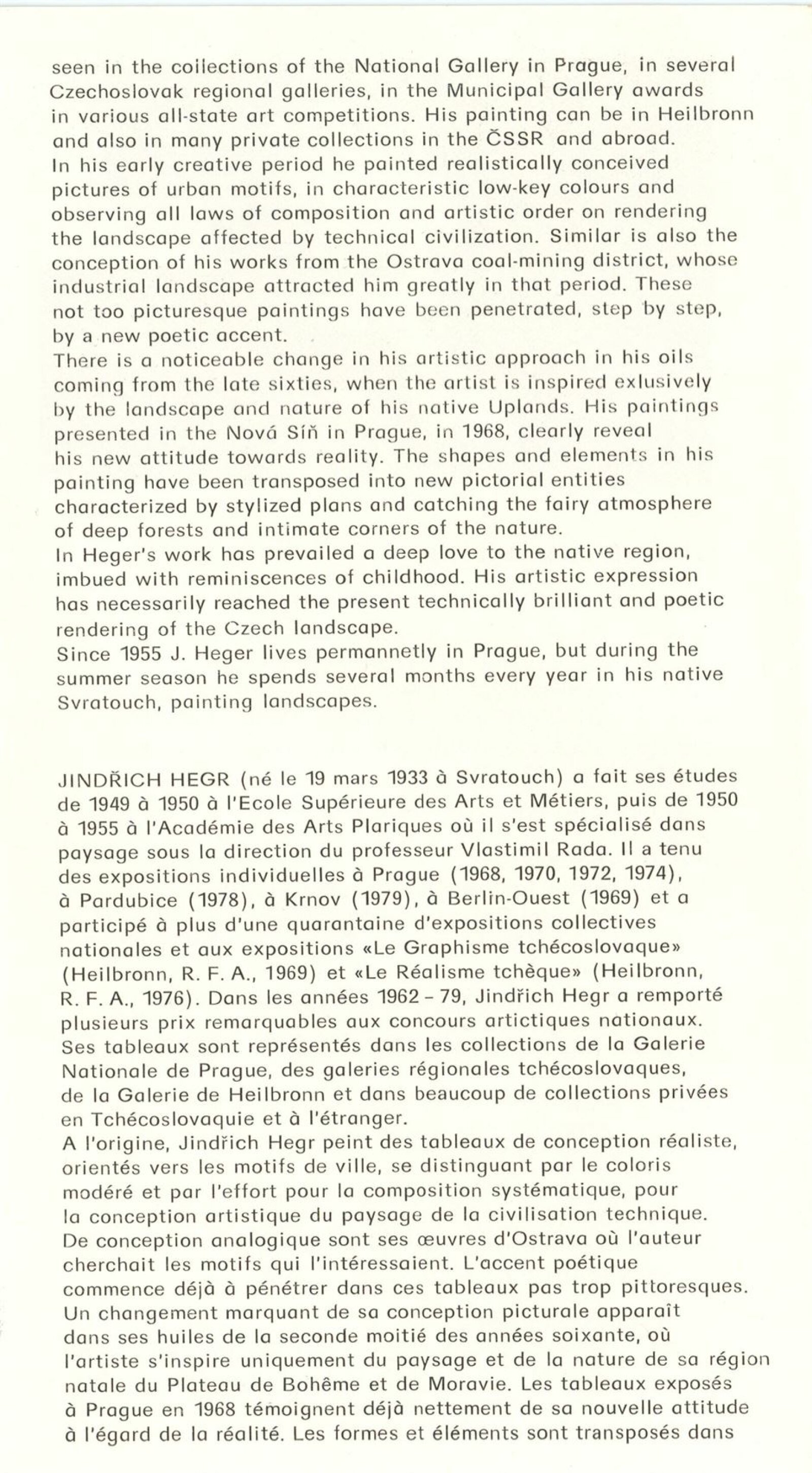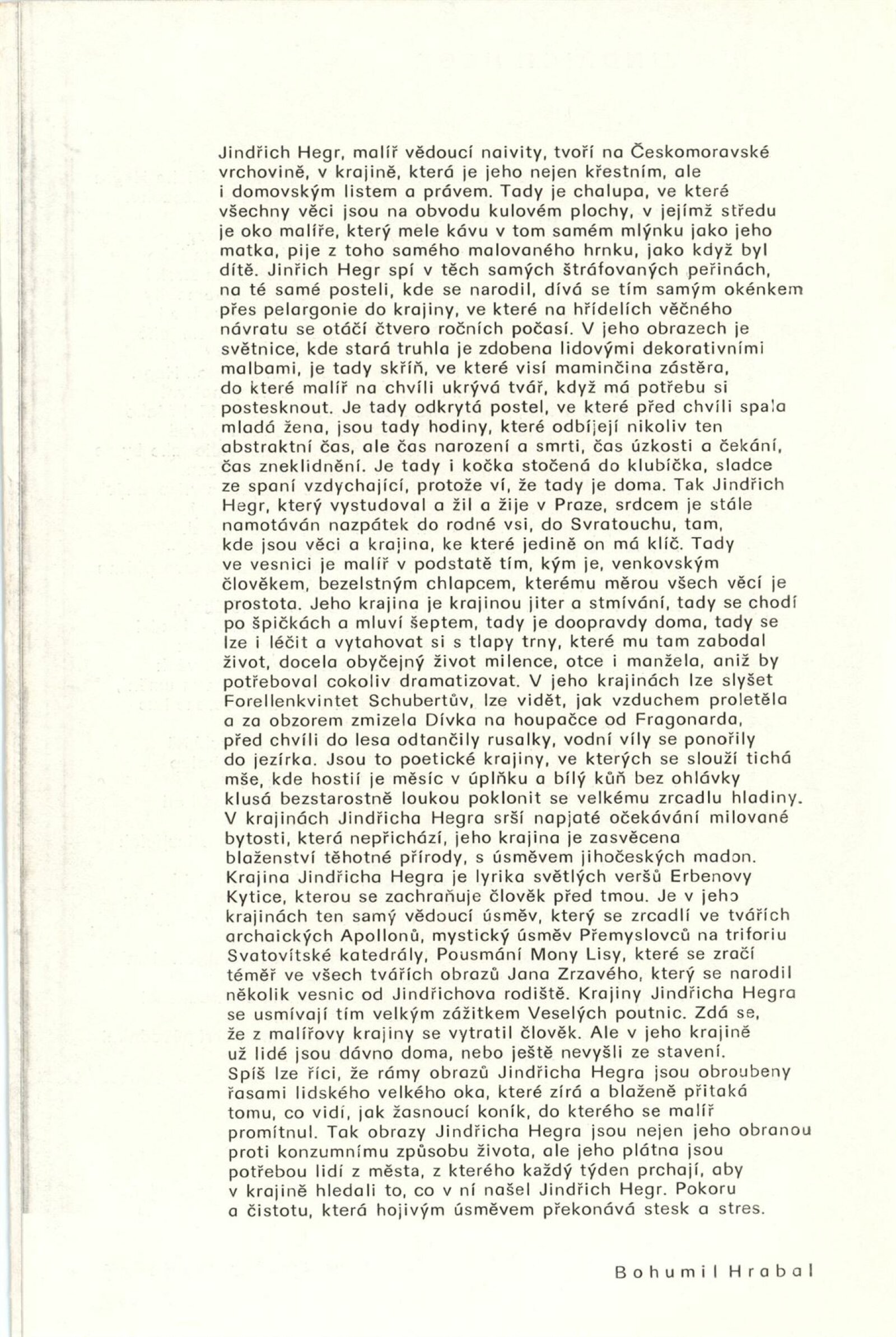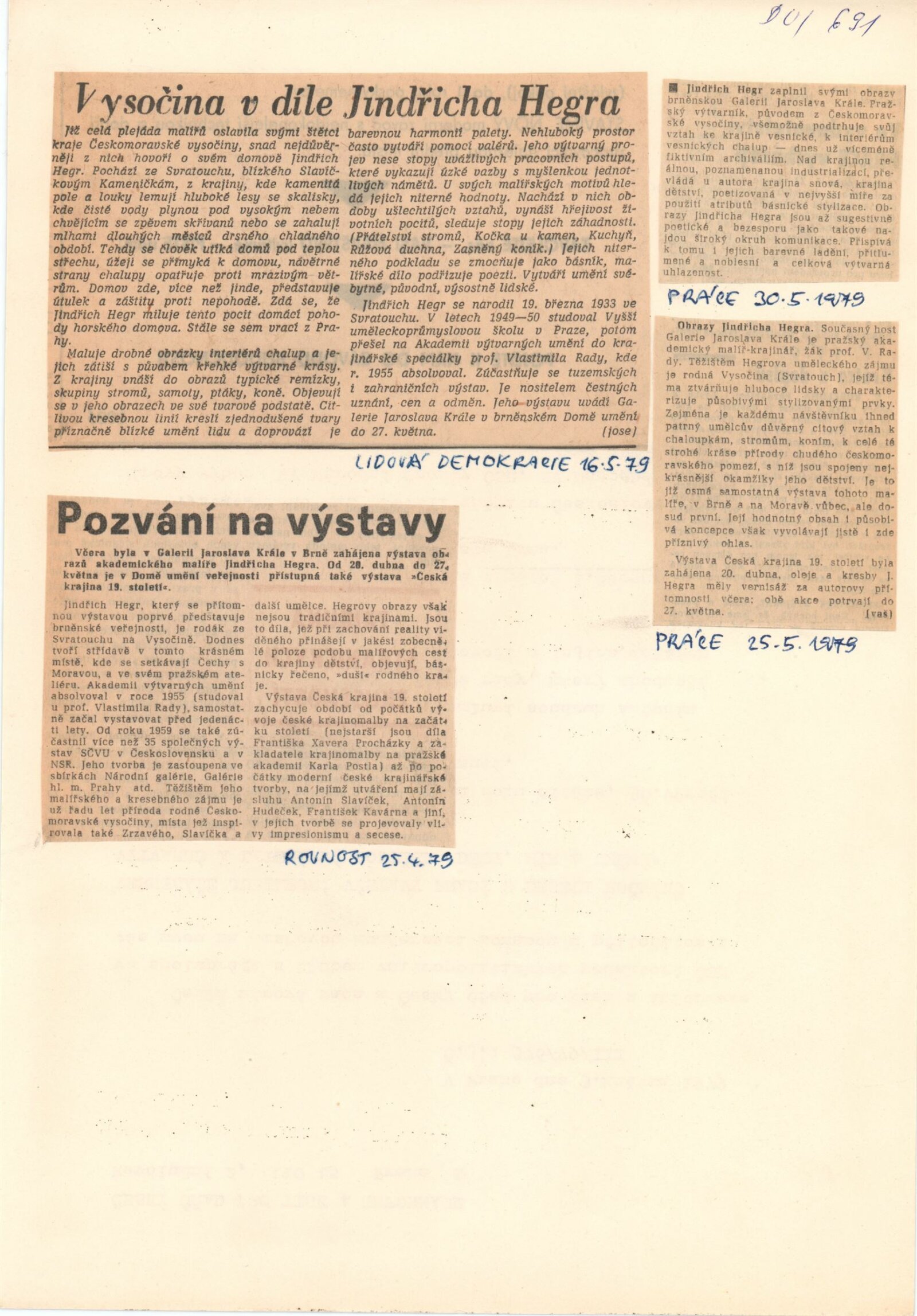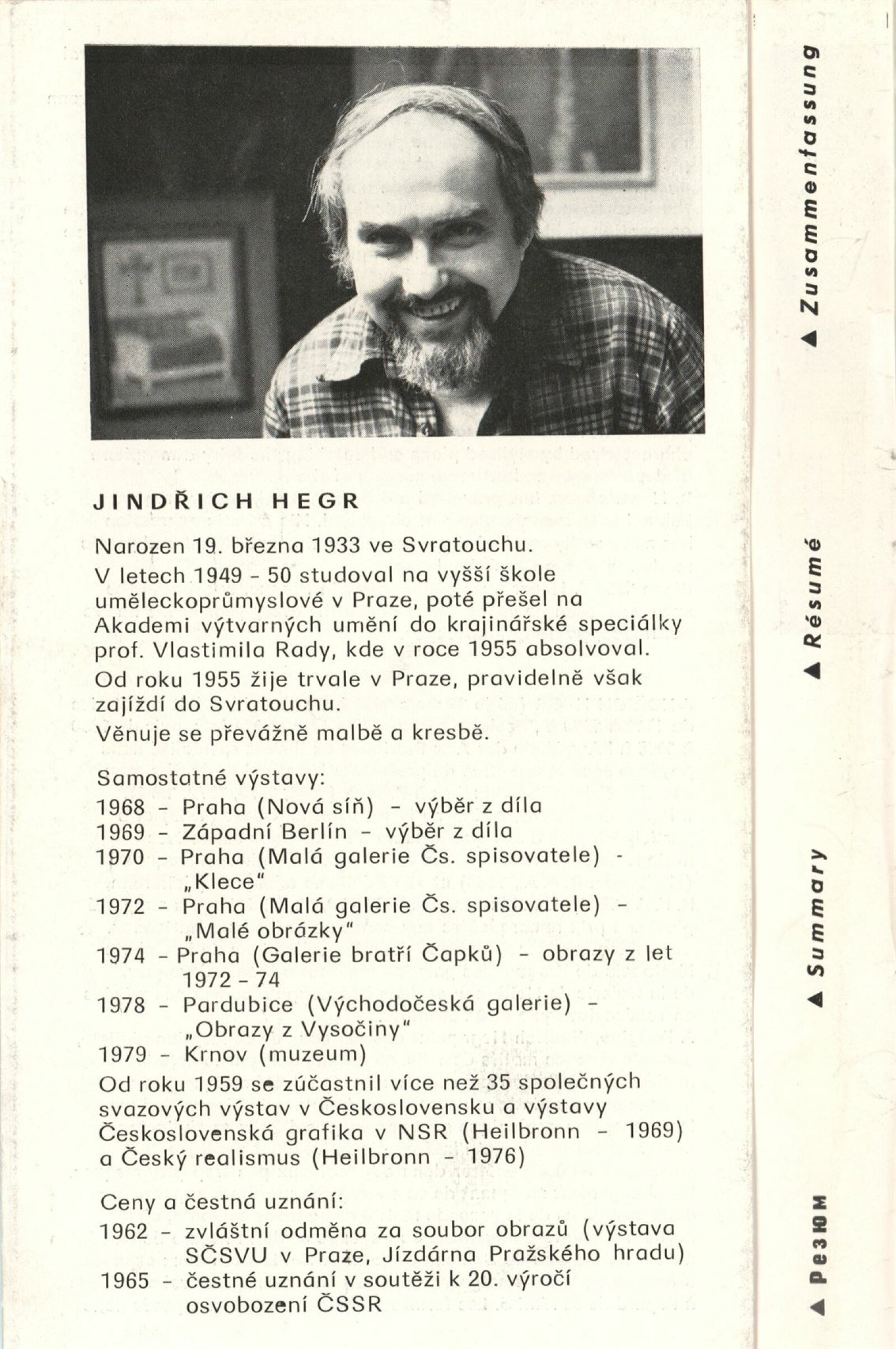 Jindřich Hegr. Obrazy: 93. výstava v Galerii Jaroslava Krále 24. 4. – 27. 5. 1979 / Text Dušan Konečný. - Brno: ČFVU, - 10 s., obr. + Seznam vystavených prací 2 s. Portrét, životní data, výstavy, ceny, DU 691; MMB