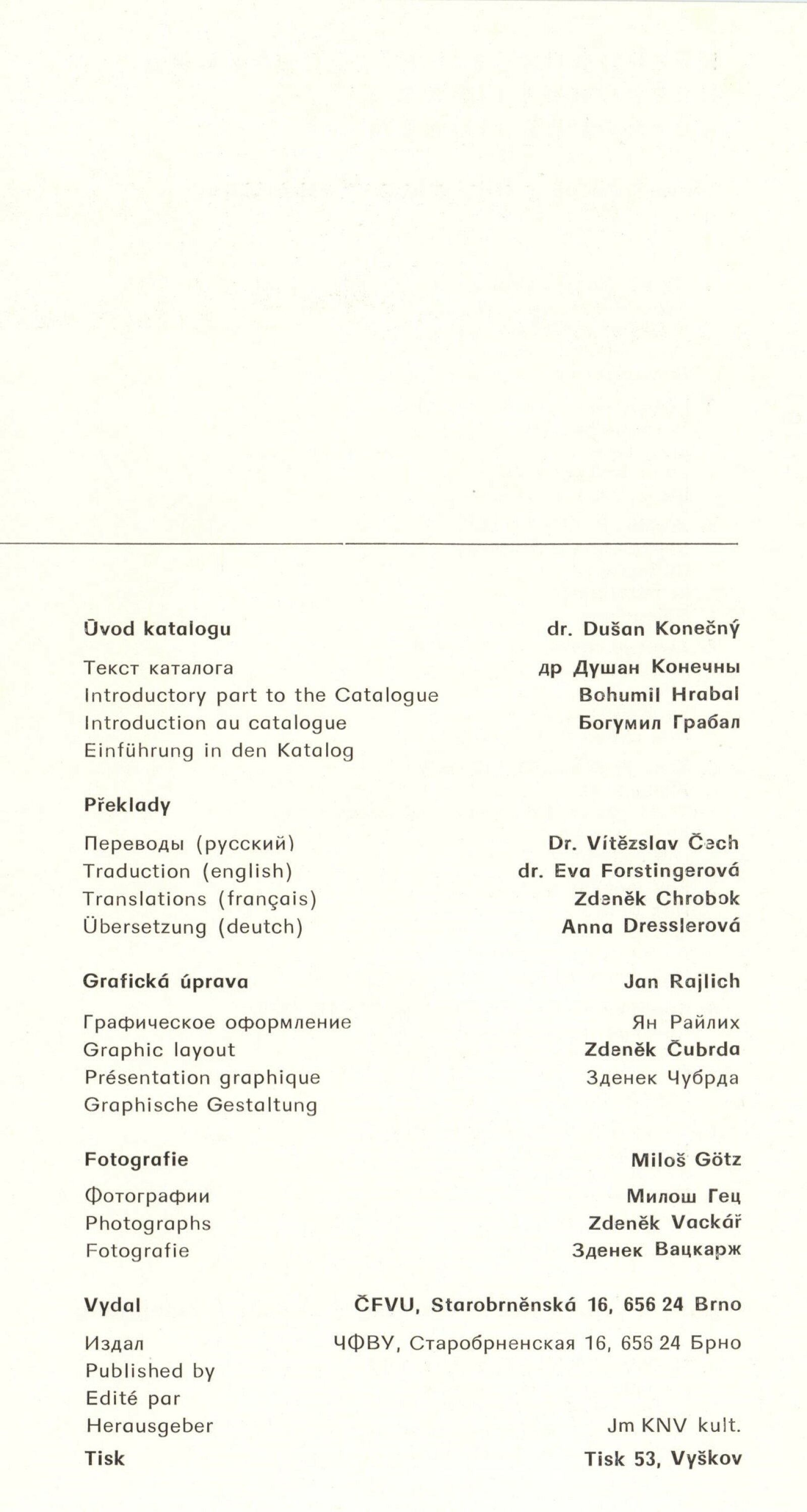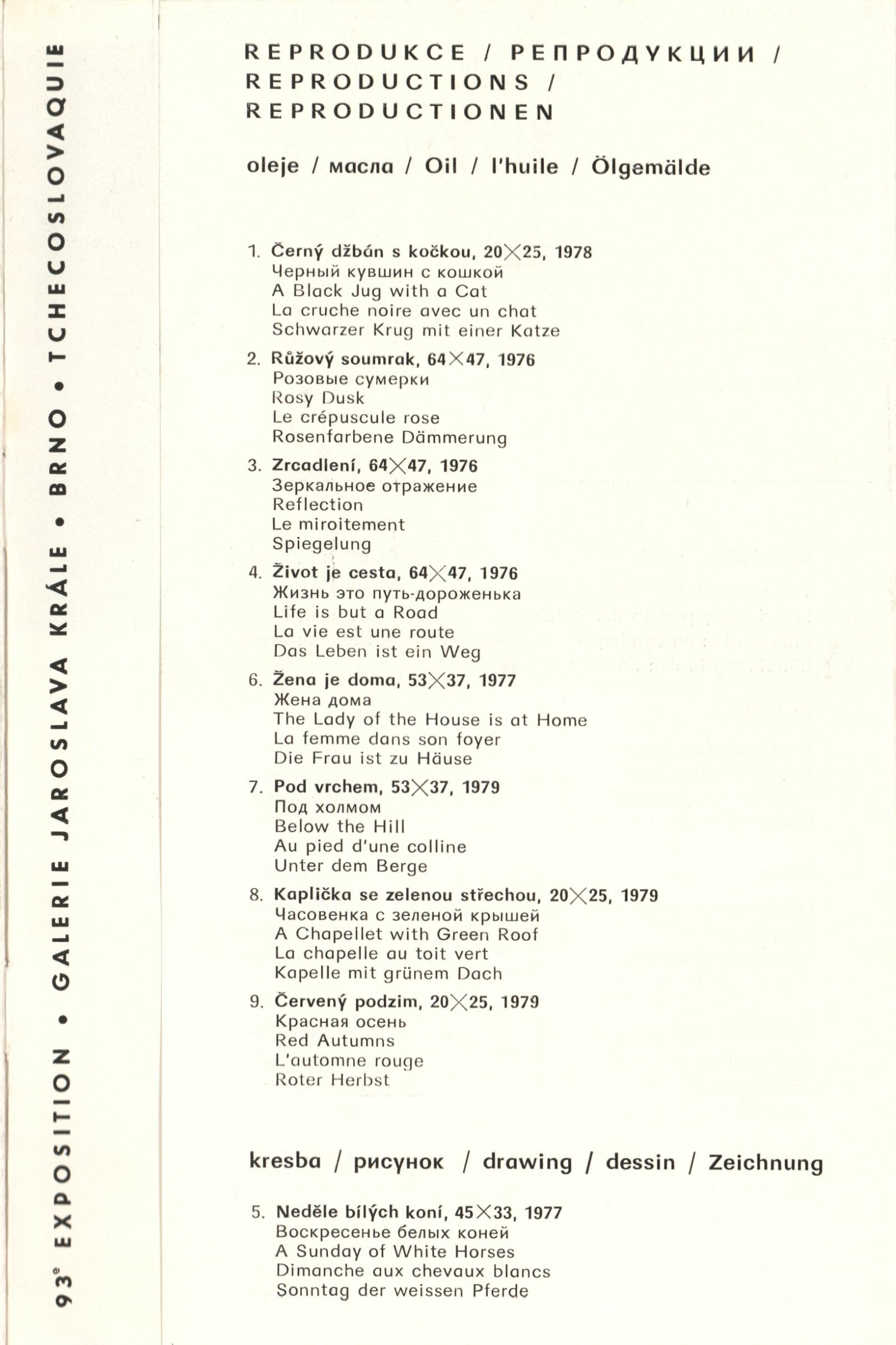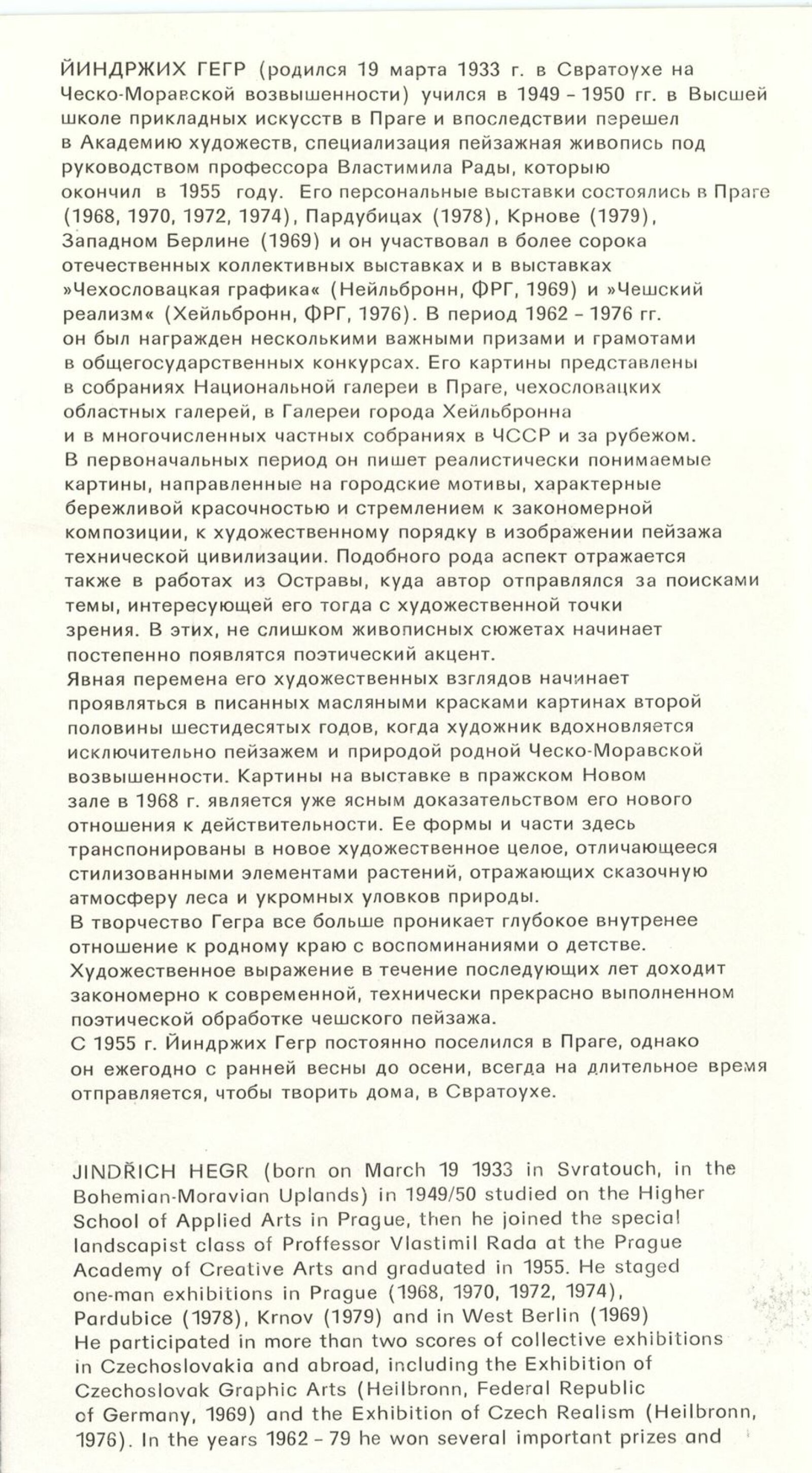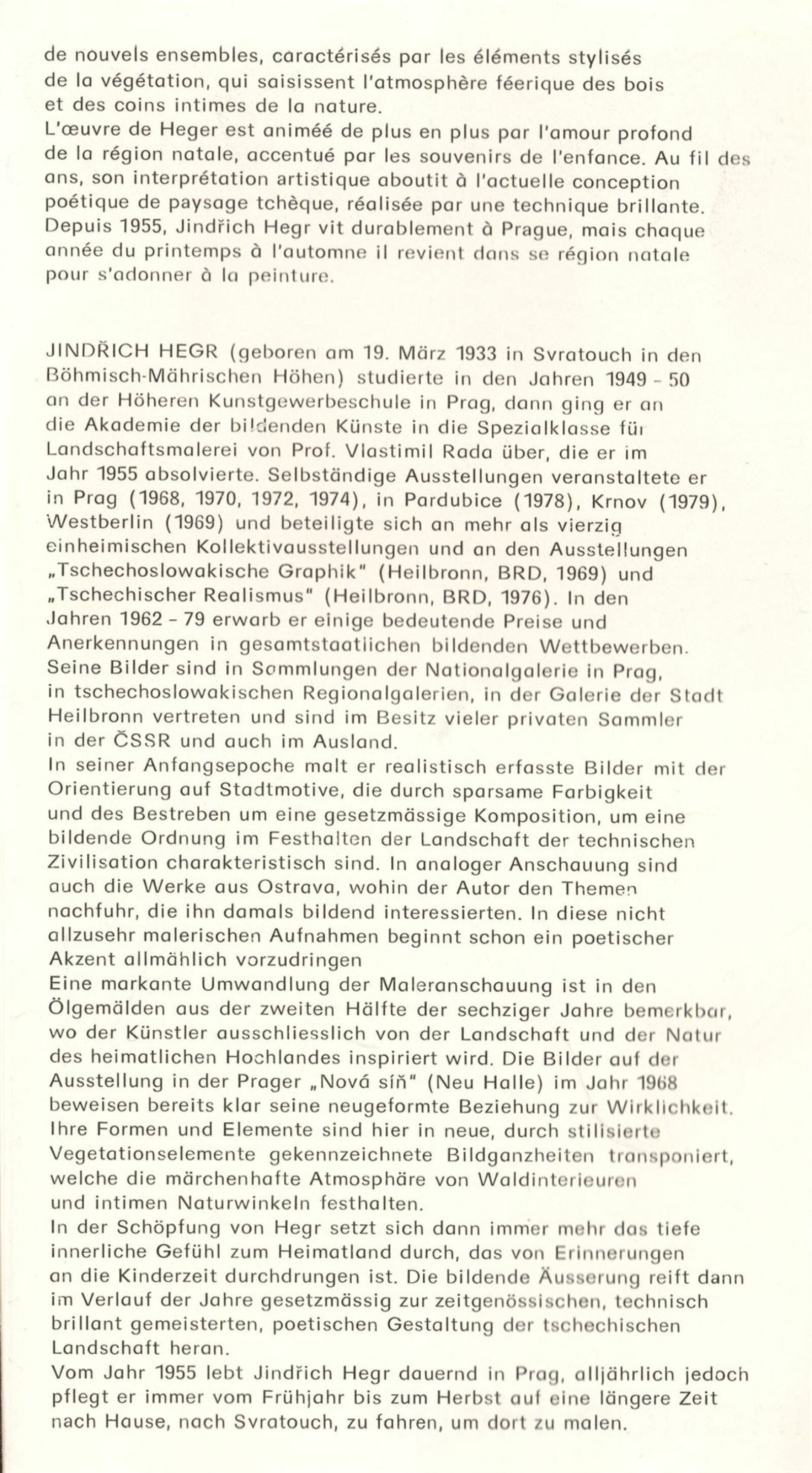 Jindřich Hegr. Obrazy: 93. výstava v Galerii Jaroslava Krále 24. 4. – 27. 5. 1979 / Text Dušan Konečný. - Brno: ČFVU, - 10 s., obr. + Seznam vystavených prací 2 s. Portrét, životní data, výstavy, ceny, DU 691; MMB