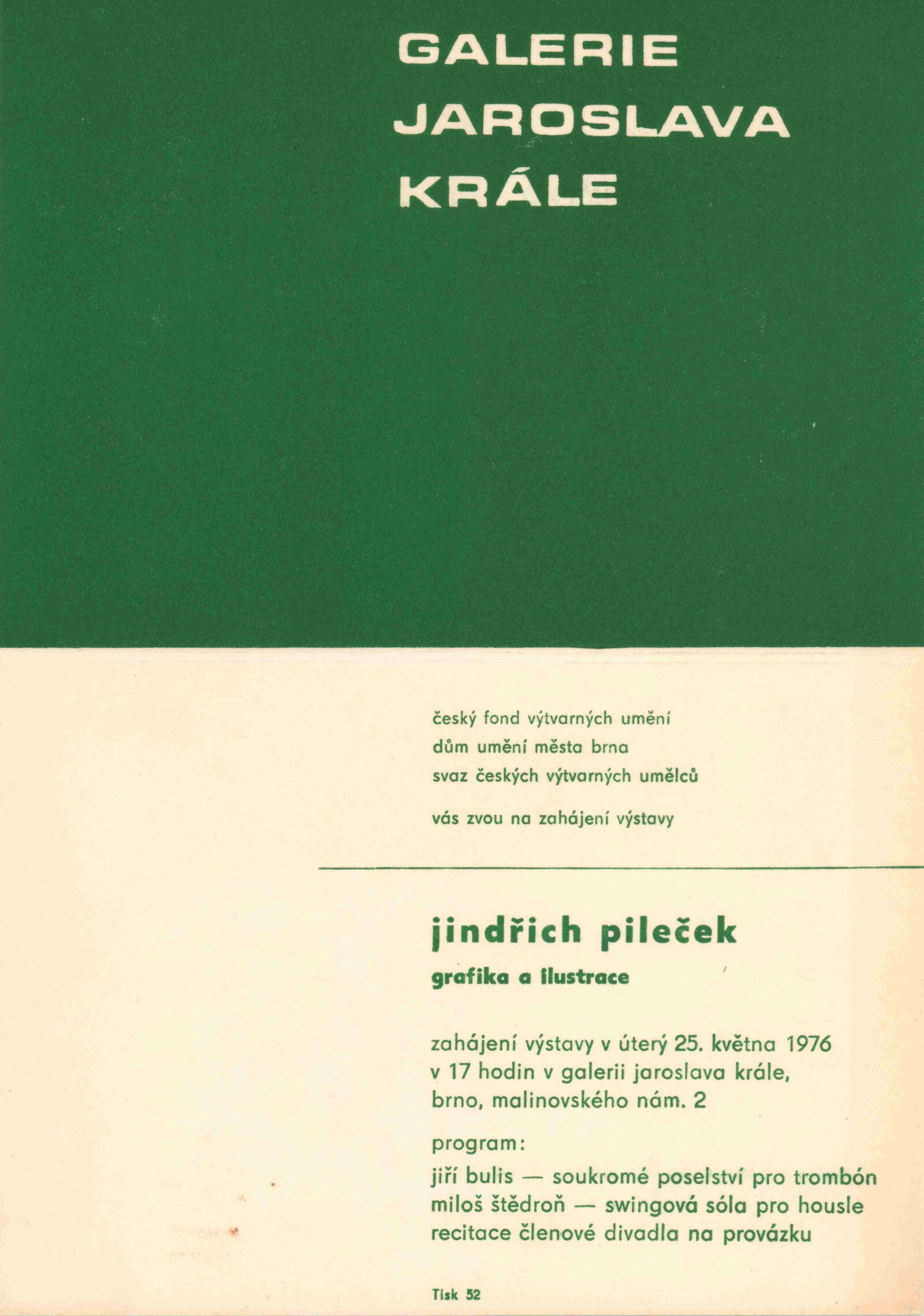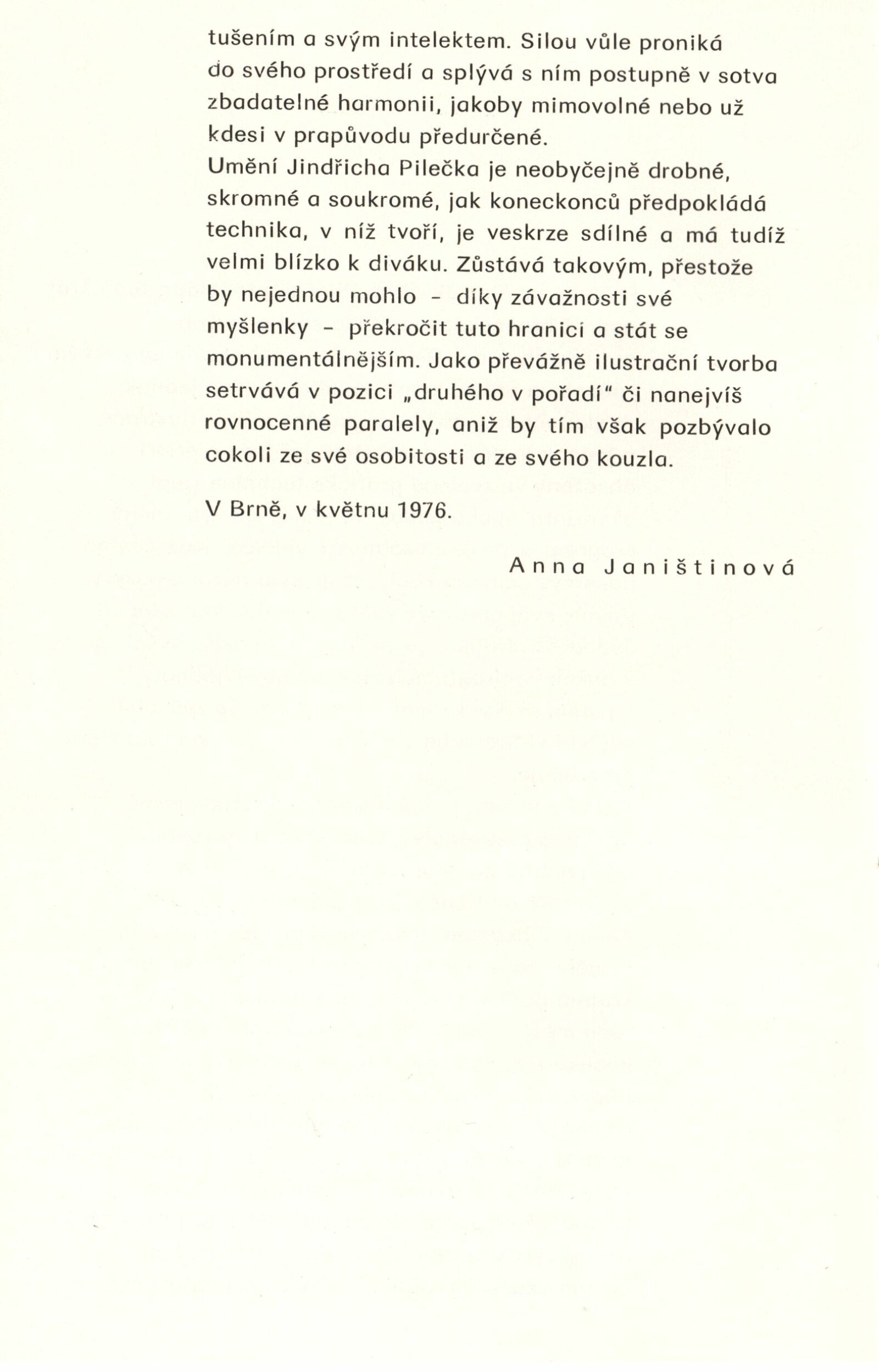 Jindřich Pileček. Grafika a ilustrace: Dům umění, 73. výstava v Galerii Jaroslava Krále, 25. 5. – 20. 6. 1976 / Text: Anna Janištinová. – Brno: ČFVU, 1976. – 2 s., 8 s. obr., seznam vystavených prací 2 s., životní data, DU 641. – MZK; MG; MMB
